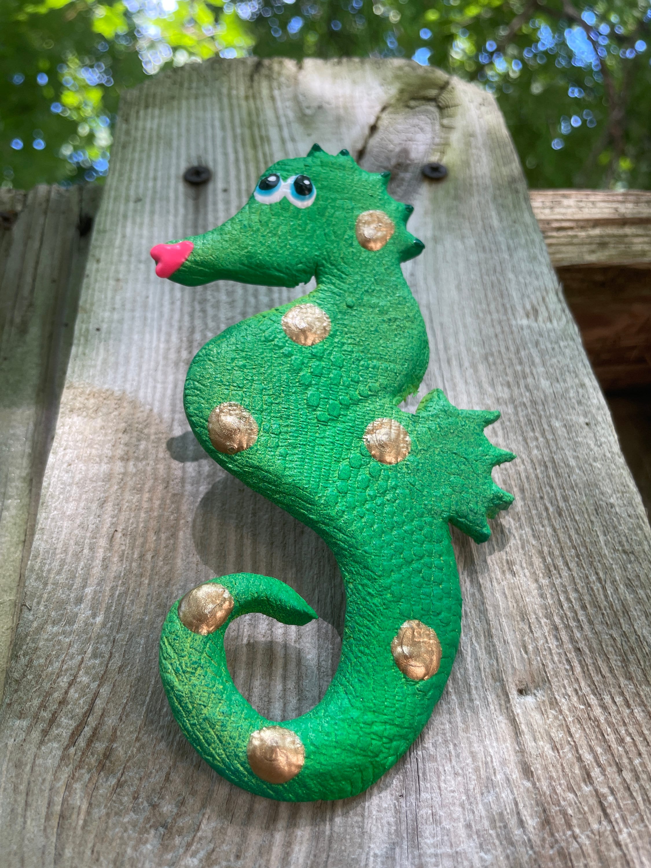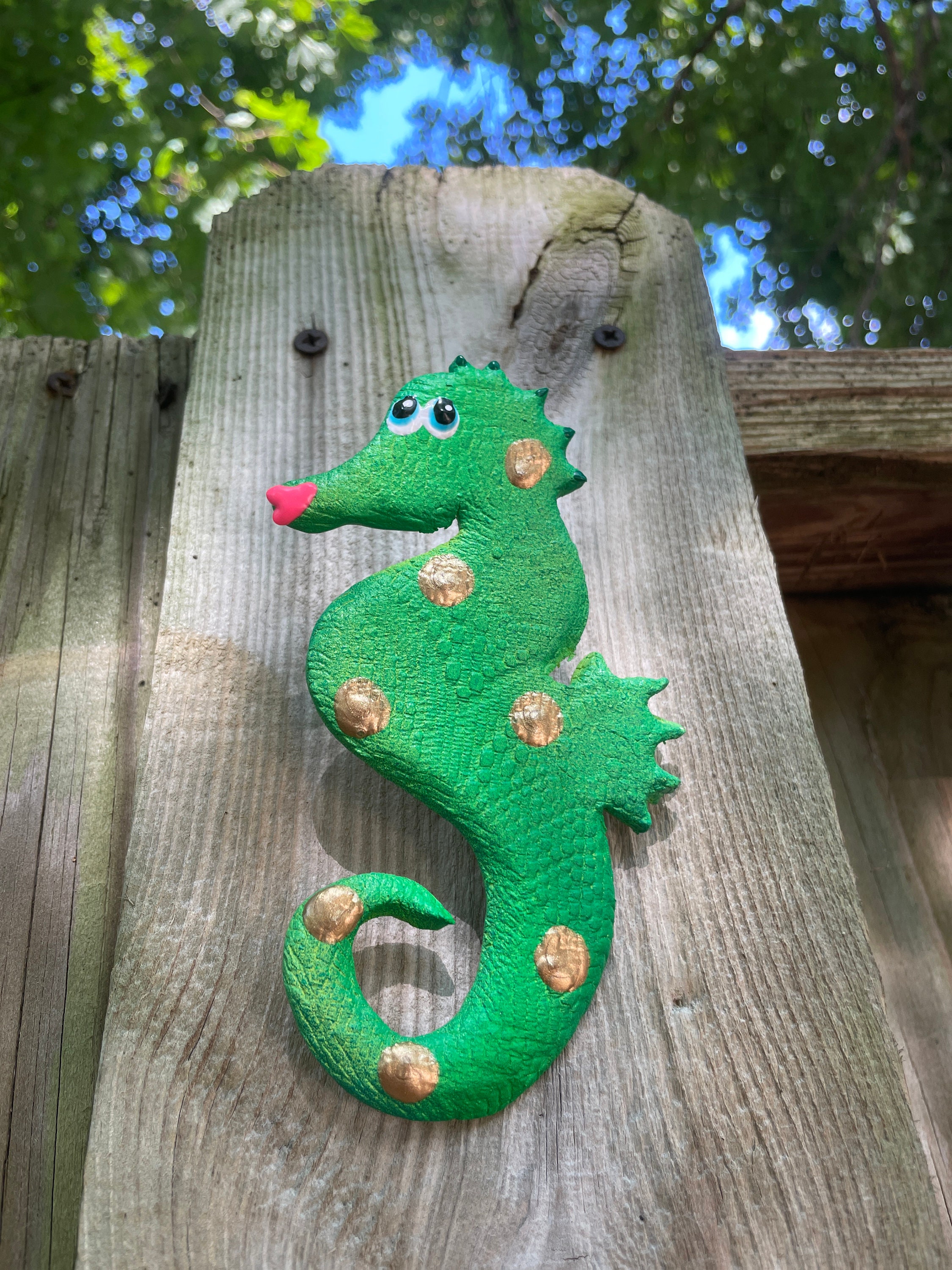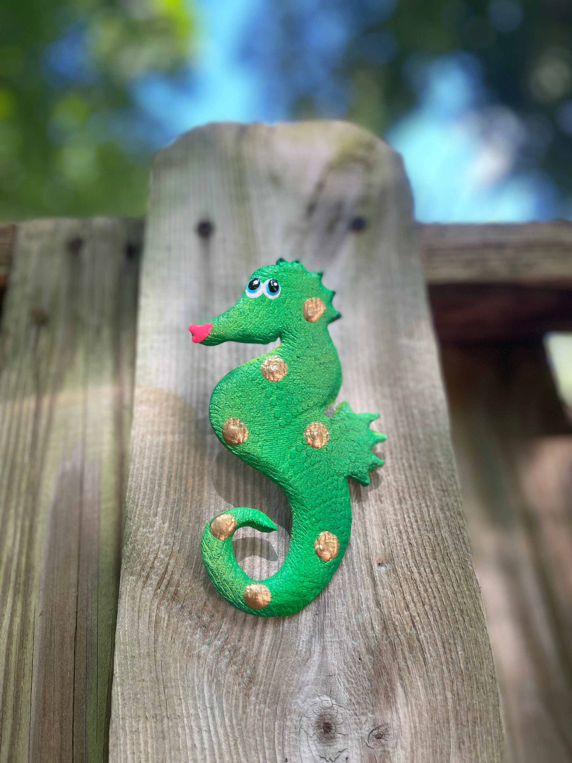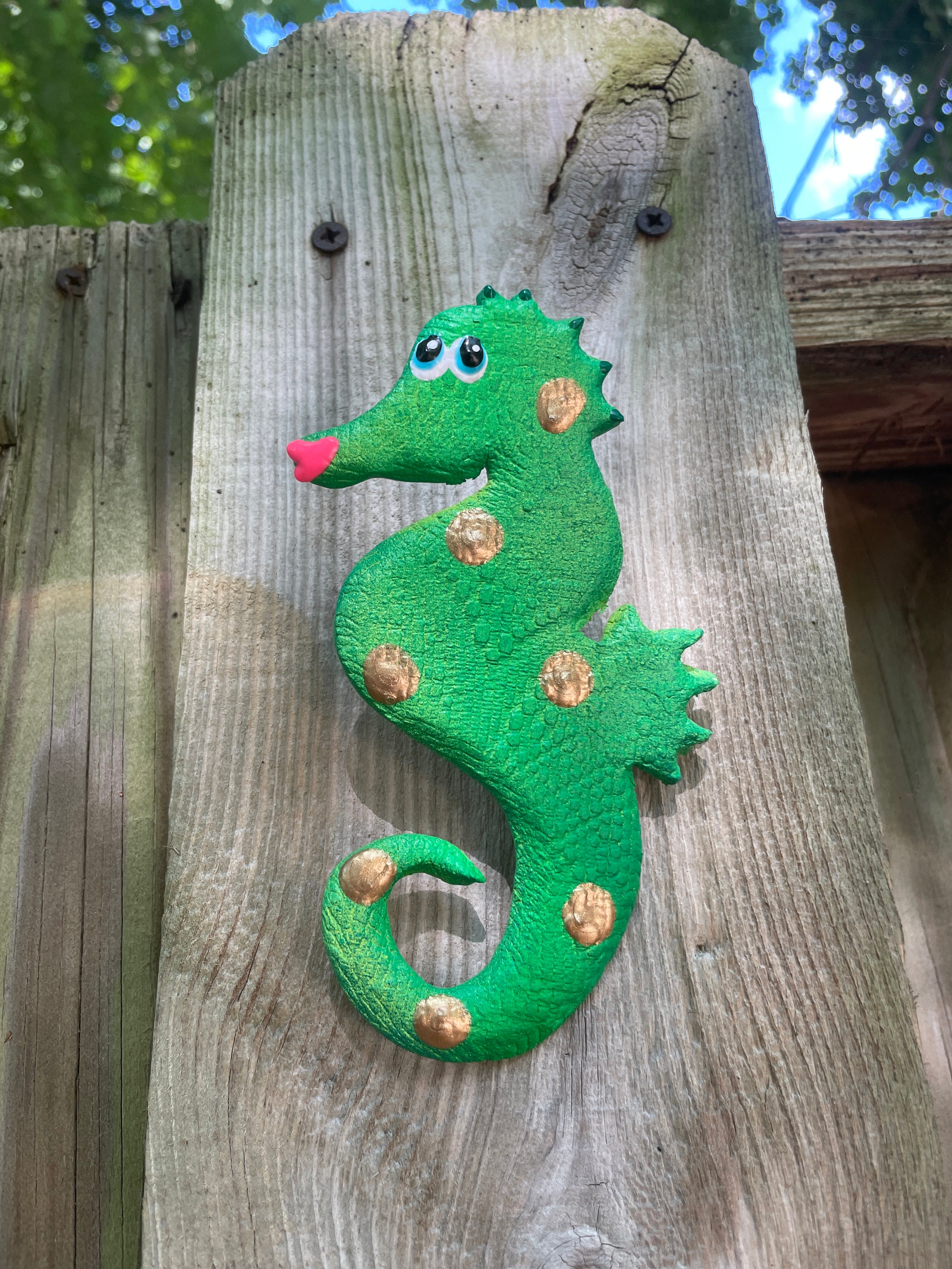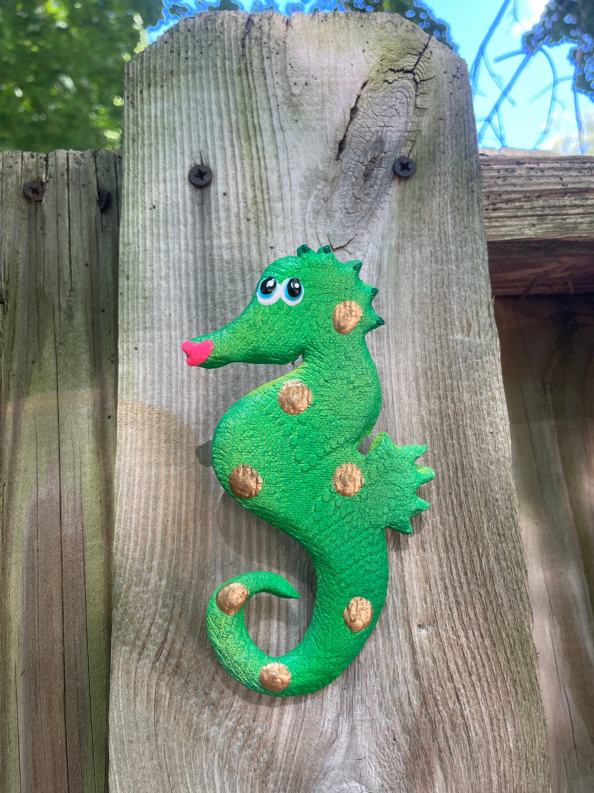 My fish-seahorse designs can help bring ideas when creating a theme such as ocean decors, Poolside, cabana, Boathouse or hang them on your Patio wall.