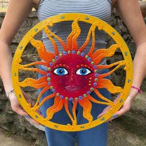 Each piece is hand formed out of a thin metal and has a base coat of enamel paint with textured acrylic paint detailing.