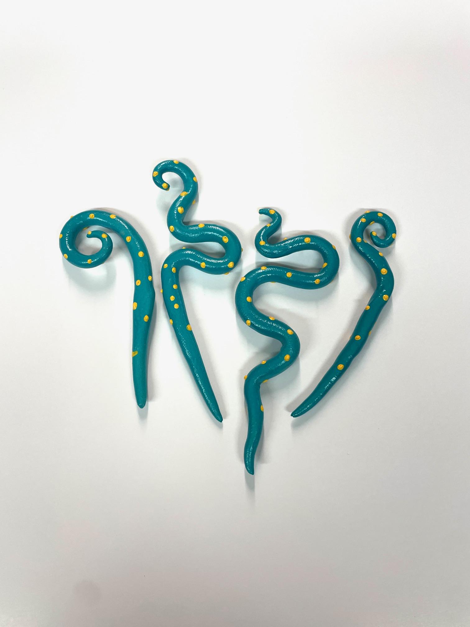 Each Octopus Tentacle is hand formed from a ball of stoneware clay. Once the clay is dry, the Whimsy Tentacles are fired in my kiln. As they're all handmade, no two are exactly alike. Imperfections are part of the charm!