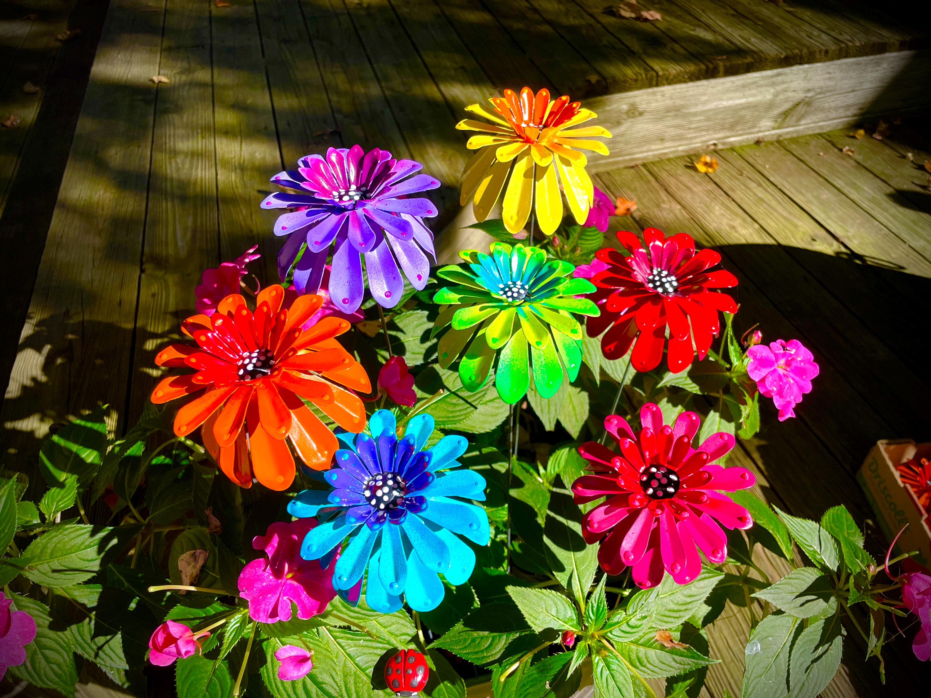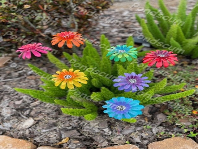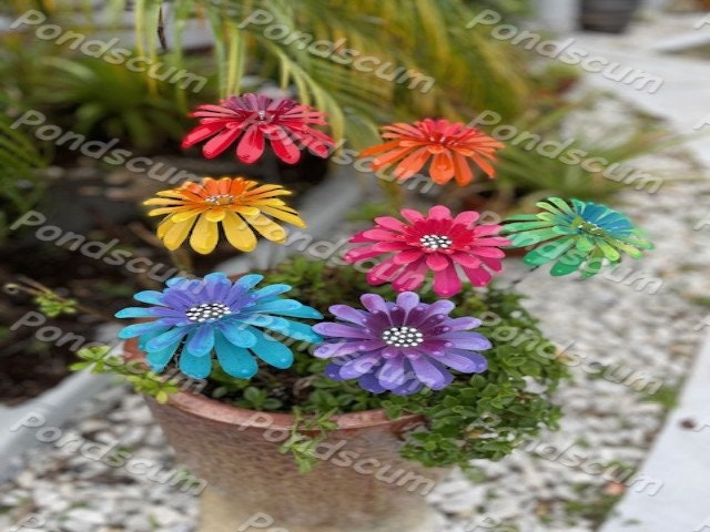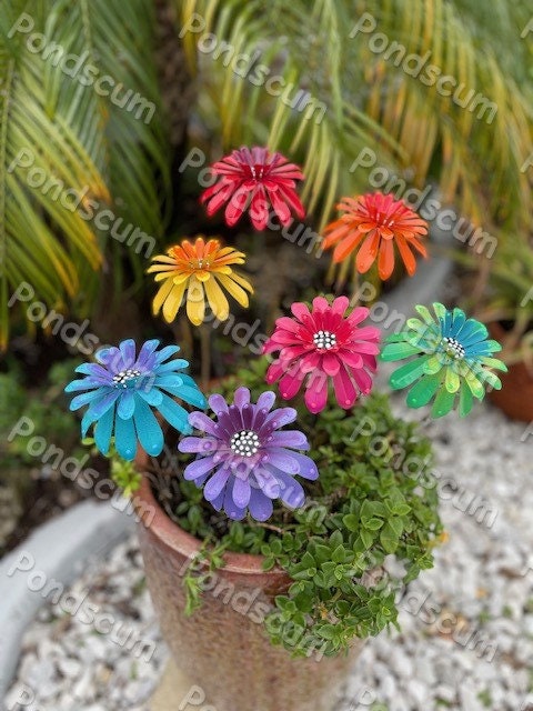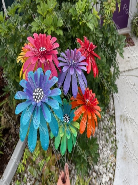 Each flower measures approximately 4 inches wide and stands 18 inches tall. With a base coat of enamel paint and textured acrylic detailing, every piece is hand-formed and unique. Additionally, each metal flower has a small tube epoxied to the bottom, making it easy to attach the included 16-inch steel stem.