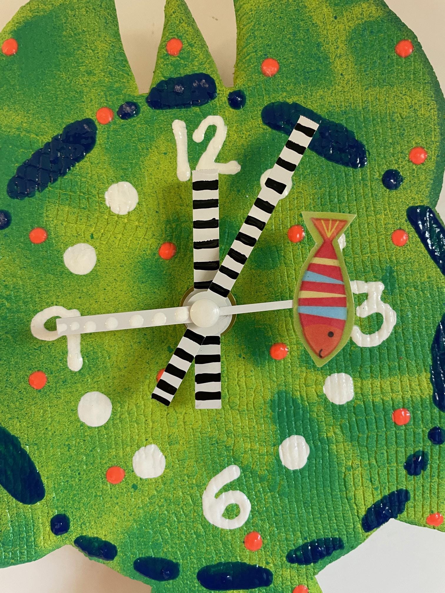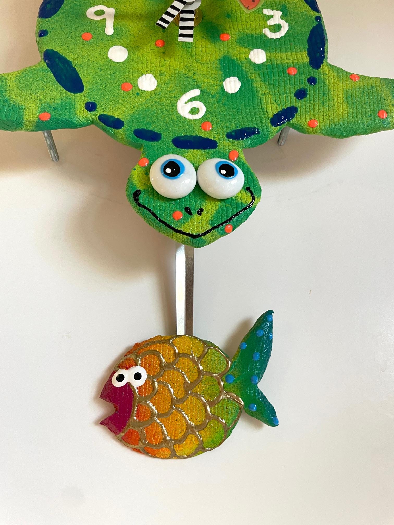 This clever ceramic wall clock with a Happy Little swinging Fish pendulum is hand made in my art studio in Fishers, Indiana.