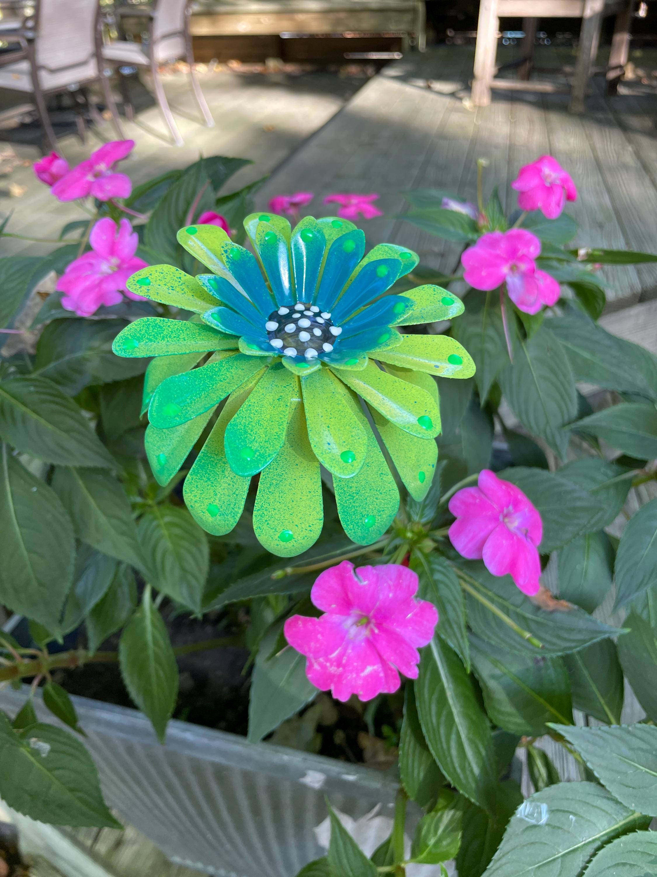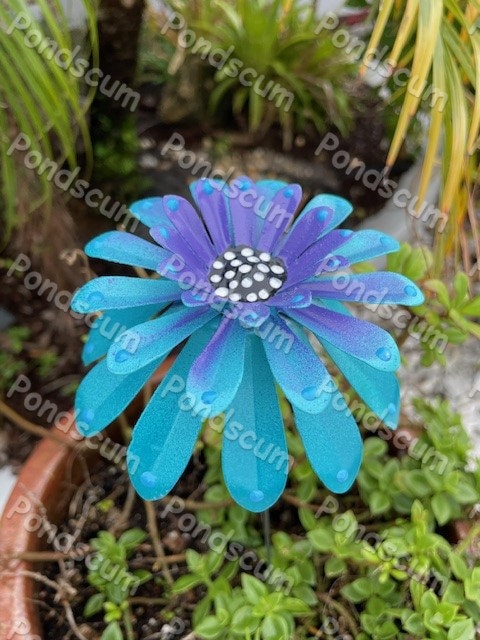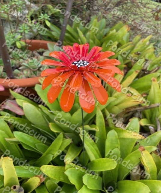 Each flower measures approximately 4 inches wide and stands 18 inches tall. With a base coat of enamel paint and textured acrylic detailing, every piece is hand-formed and unique. Additionally, each metal flower has a small tube epoxied to the bottom, making it easy to attach the included 16-inch steel stem.
