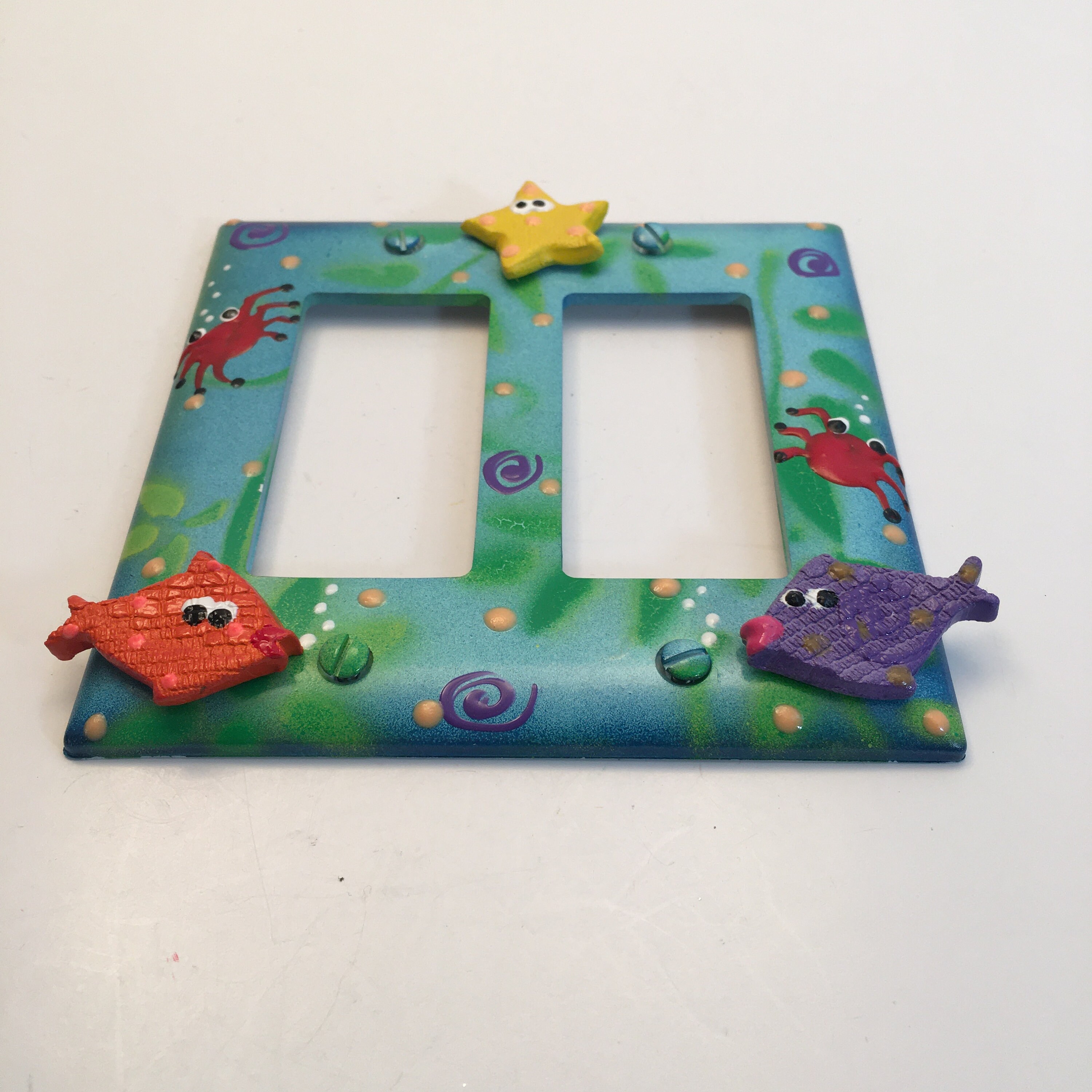 Hand painted light switch cover with fish embellishments.