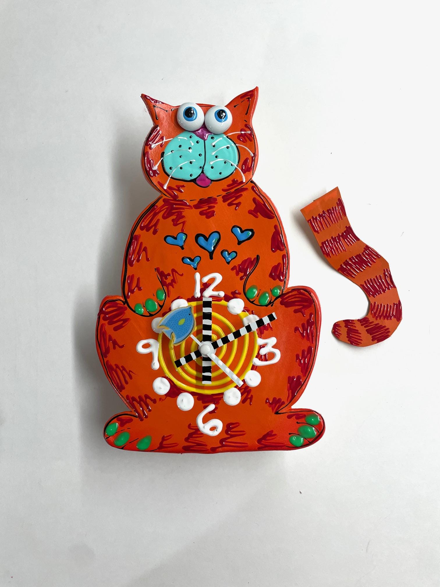 This ceramic wall clock with swinging cat tail is hand made in my art studio in Fishers, Indiana.