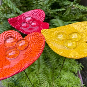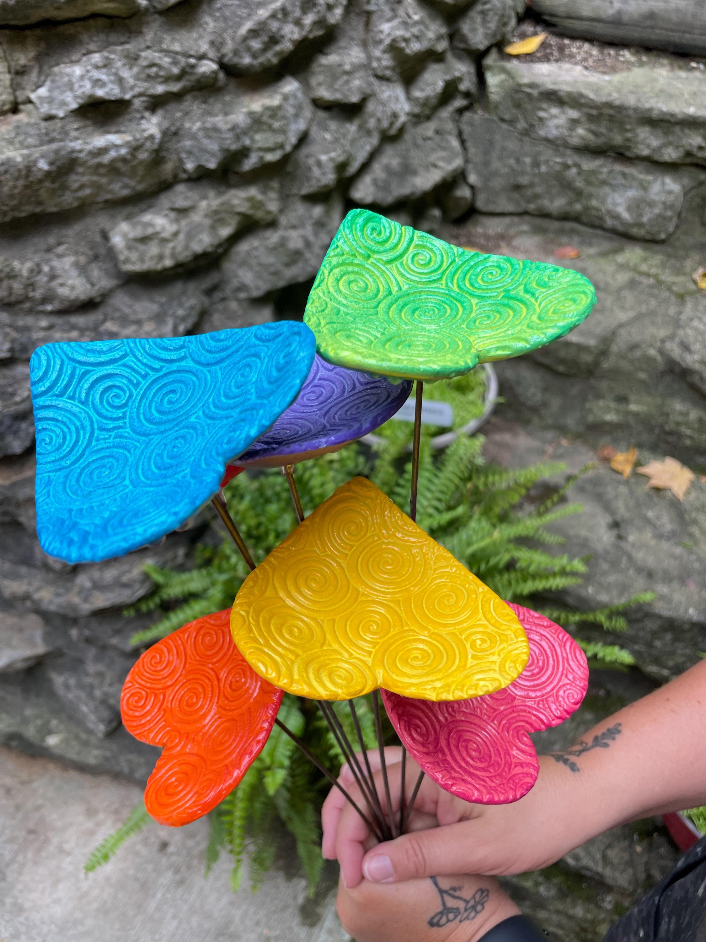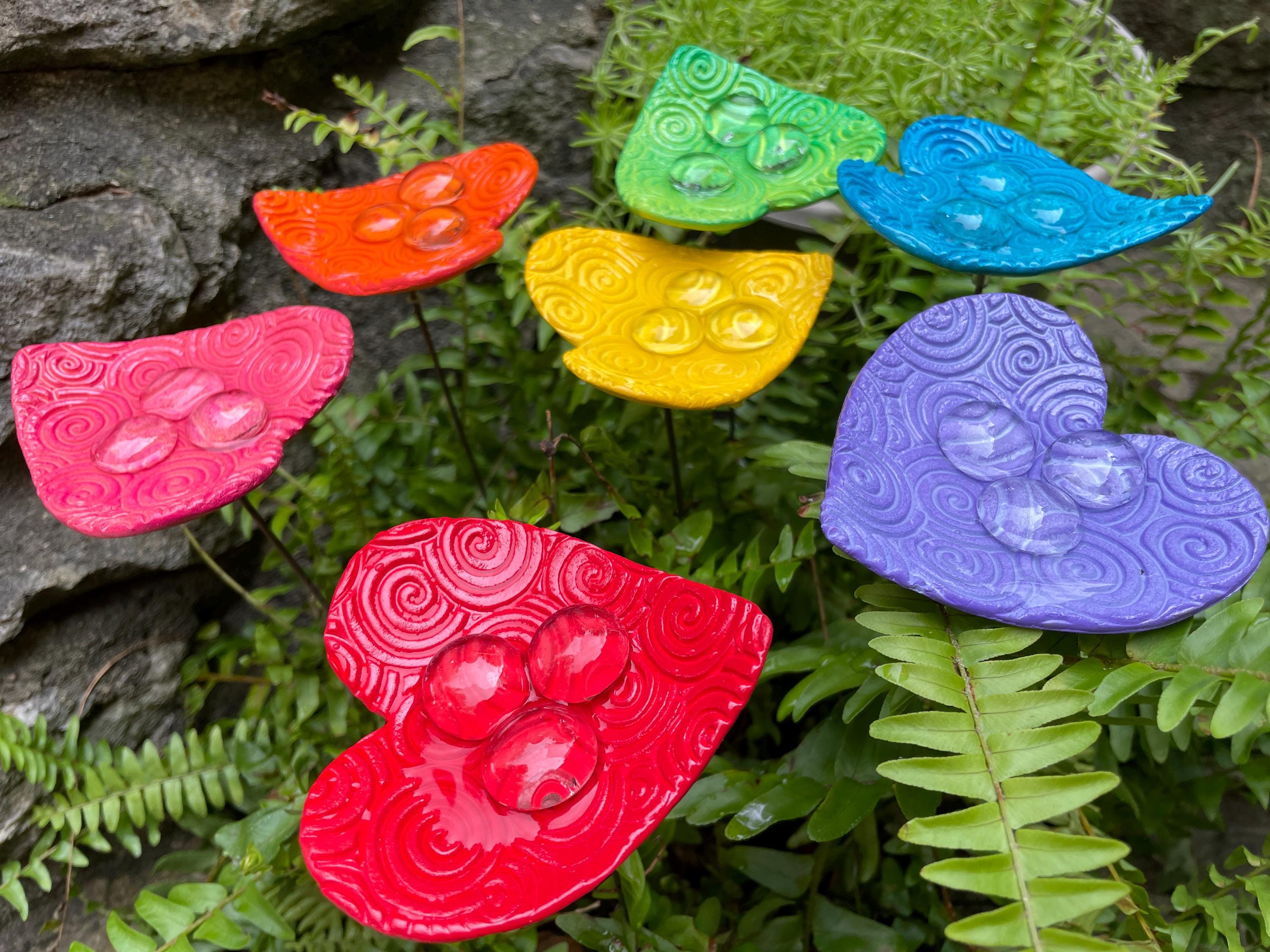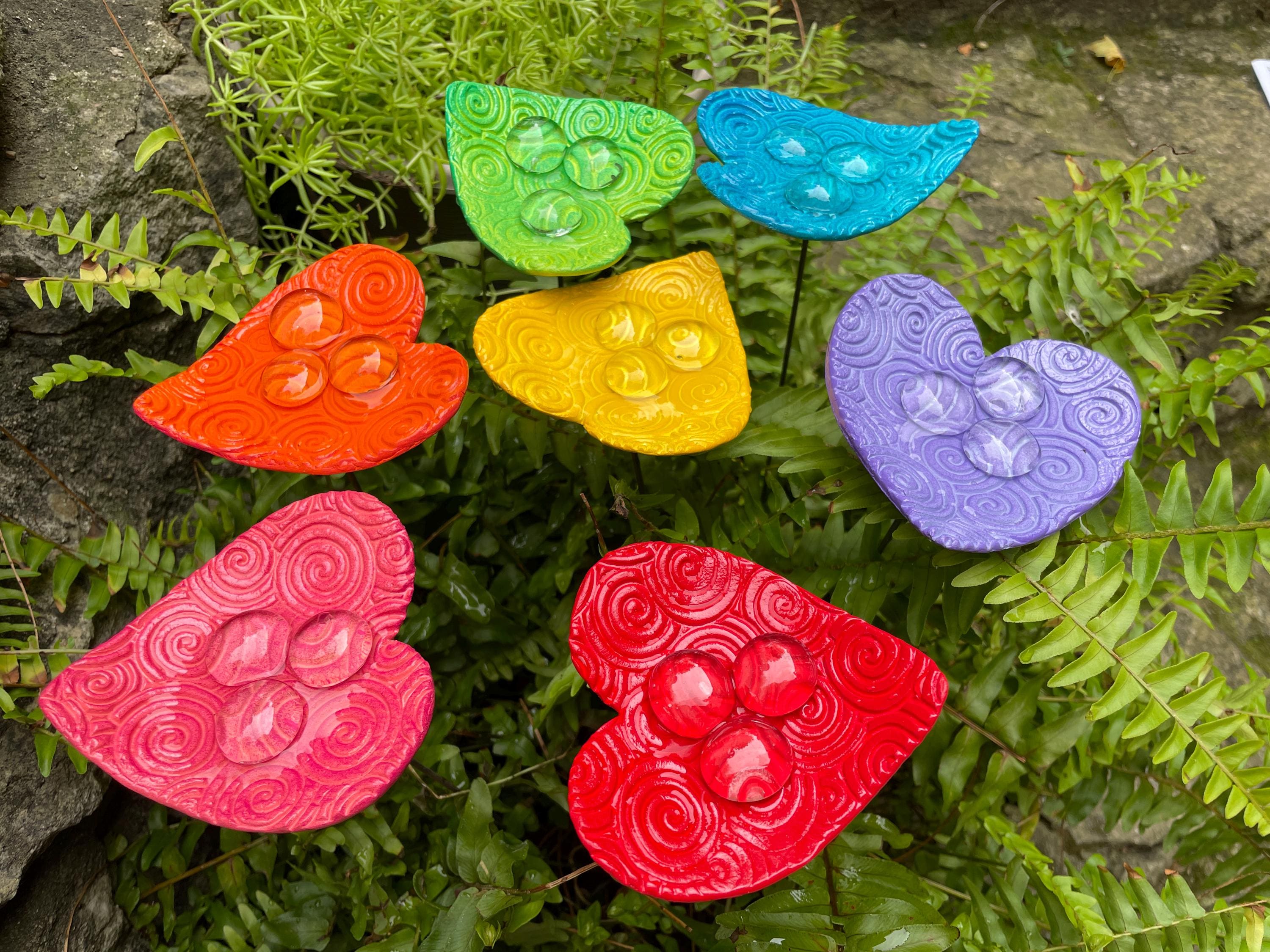 Handcrafted garden Hearts is made out of Stoneware clay. Once the clay is dry, the Whimsy Hearts are fired in my kiln to give them strength and durability.