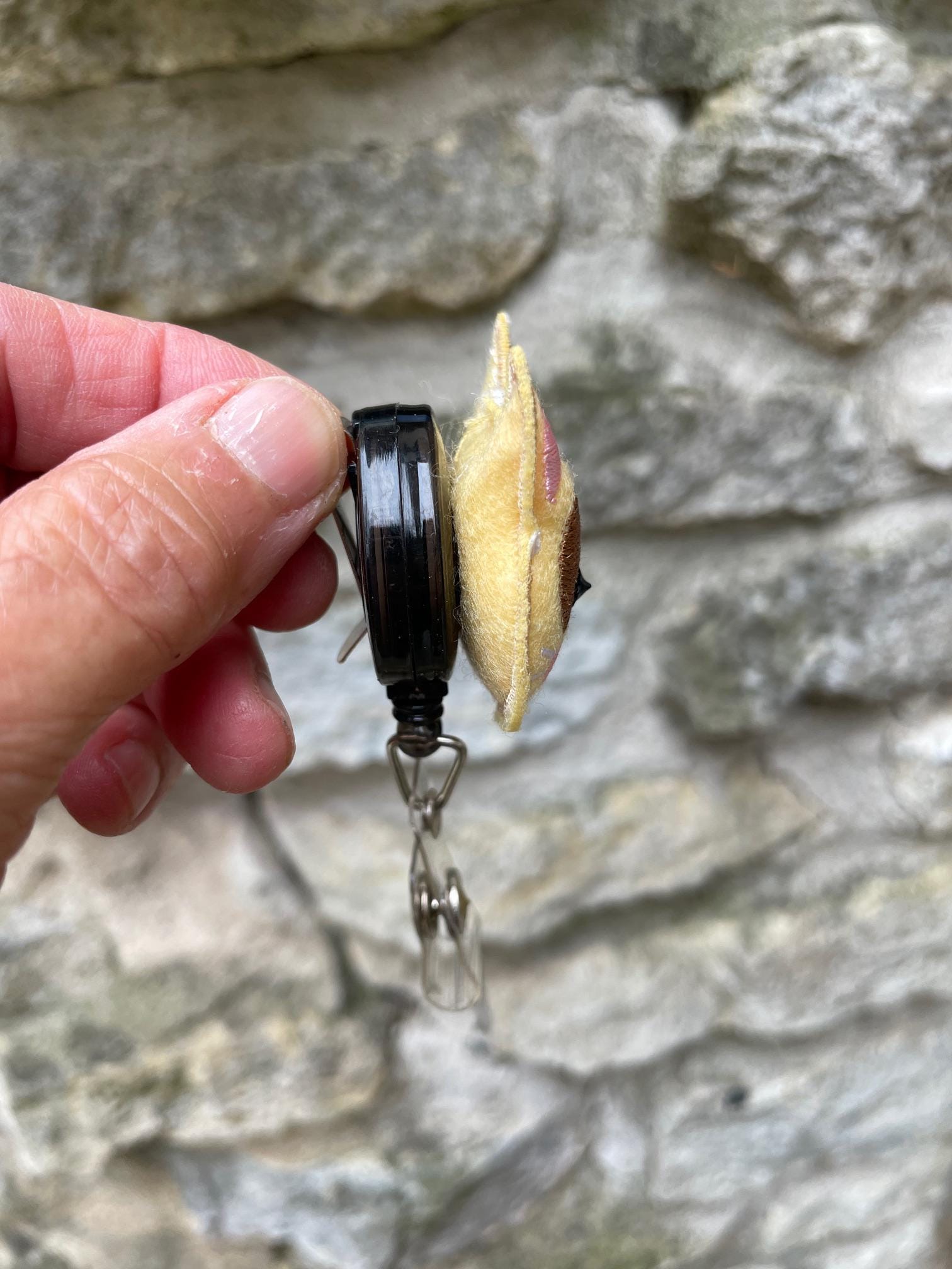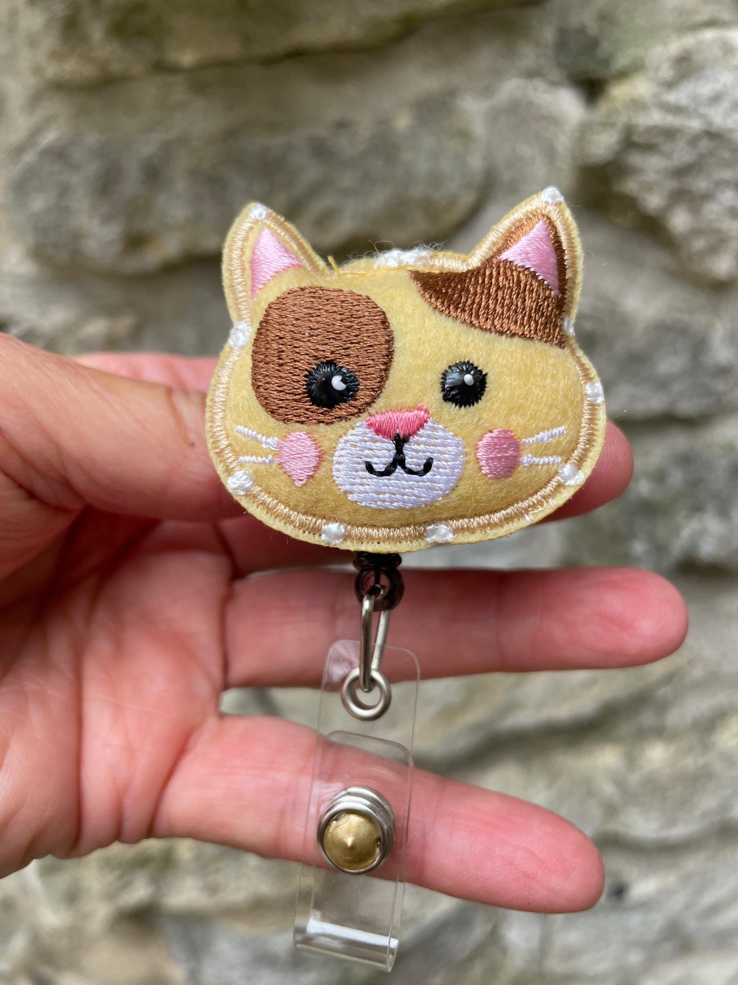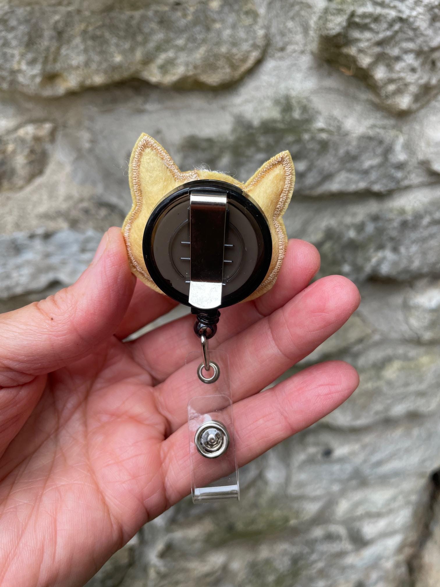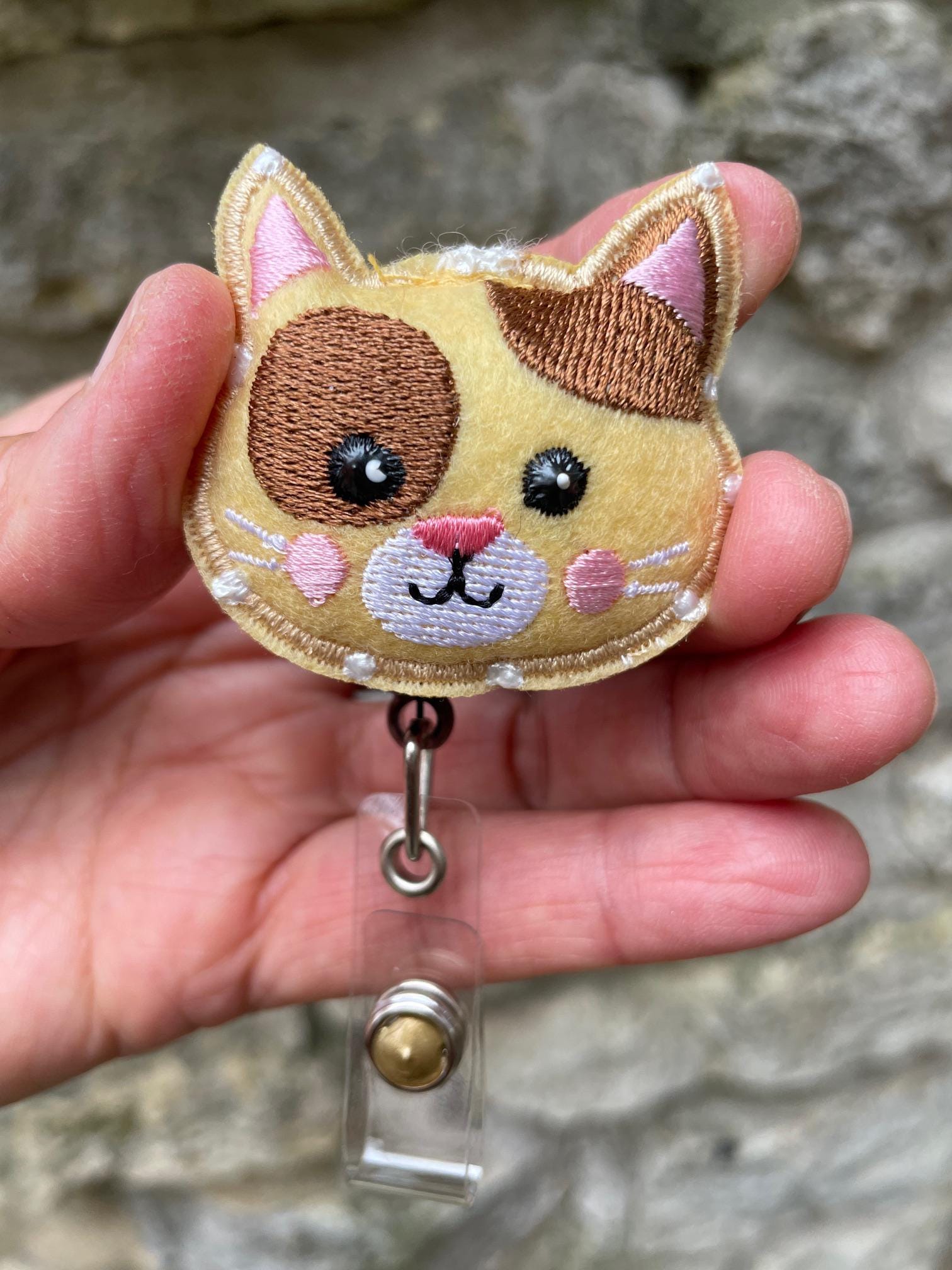 This cute cat badge reel is made from soft felt and carefully hand-stitched for lasting quality. The sweet kitty face features embroidered details and is attached to a retractable ID badge holder with a slip-on clip — perfect for keeping your ID, name tag, or keys handy while showing off your love for cats!