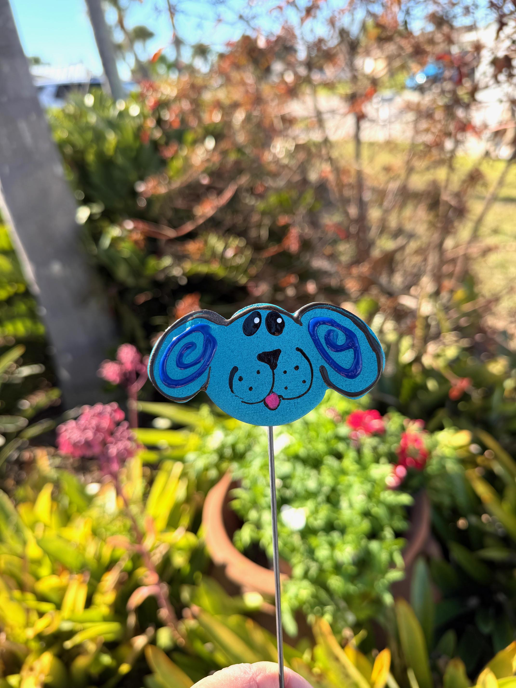Handcrafted from durable white stoneware clay, the Dog Face measures approximately 3.5" x 1.75". It comes attached to a sturdy metal garden stake, giving it a total height of 16 inches—perfect for peeking out among your blooms.