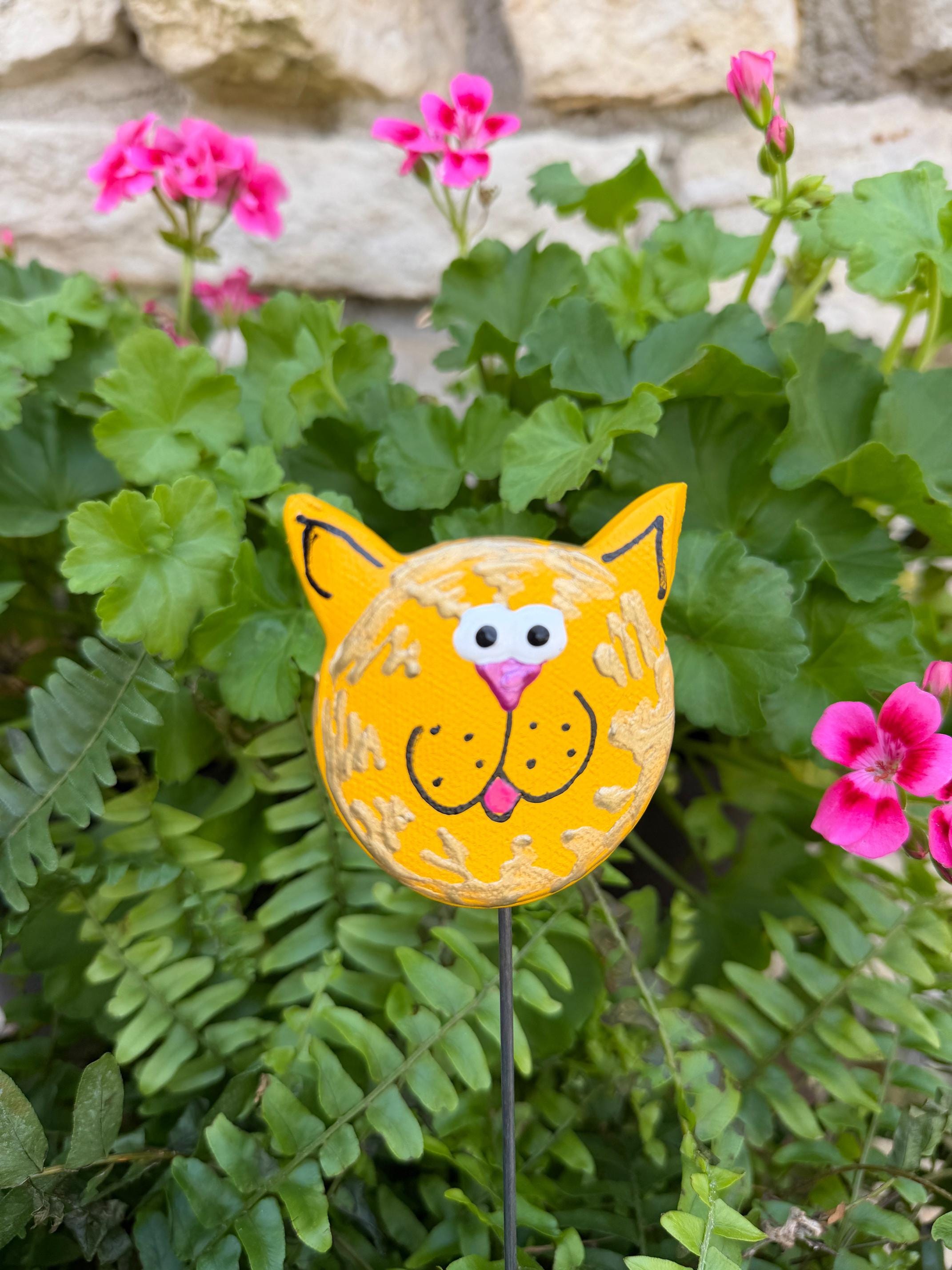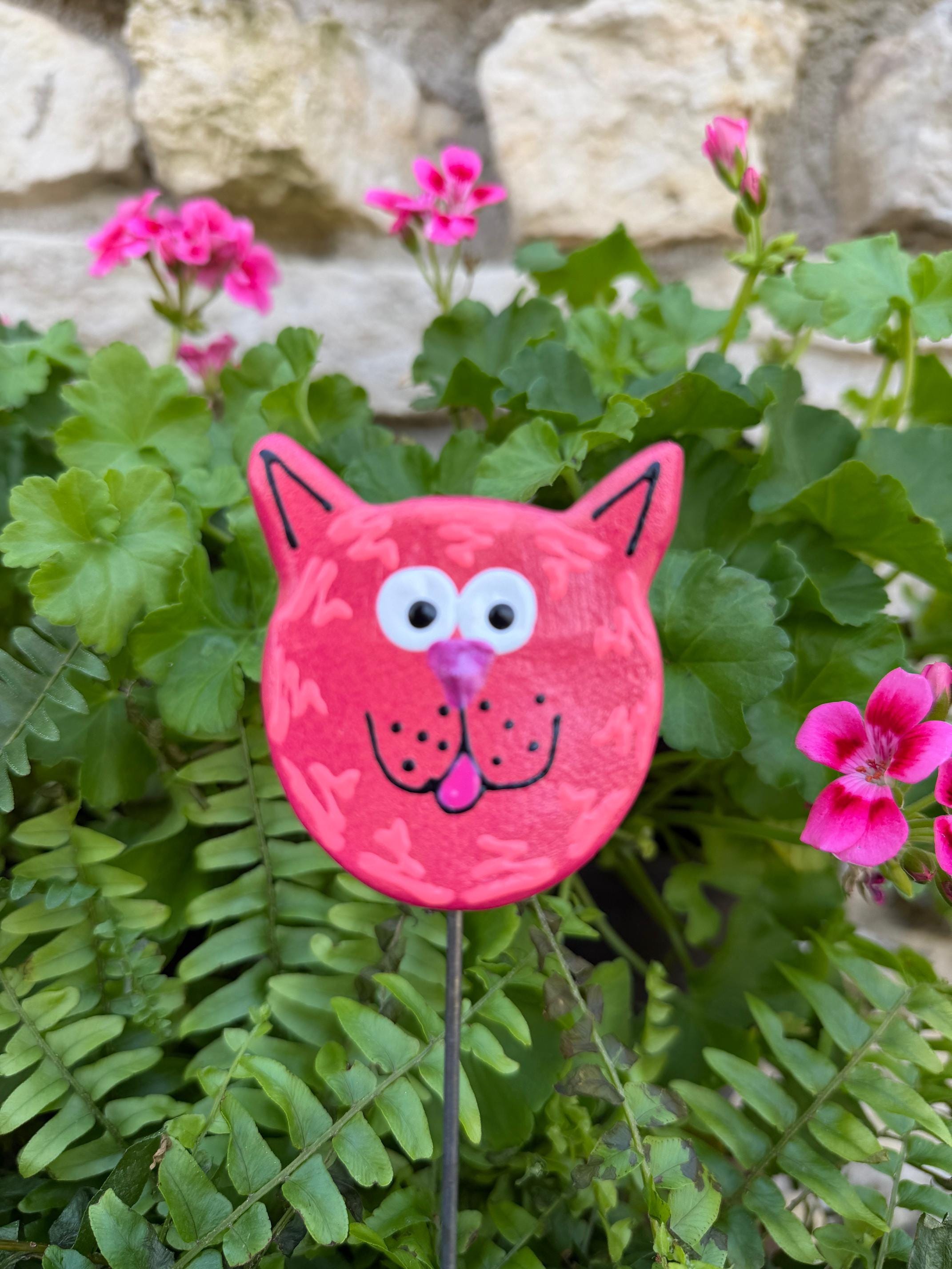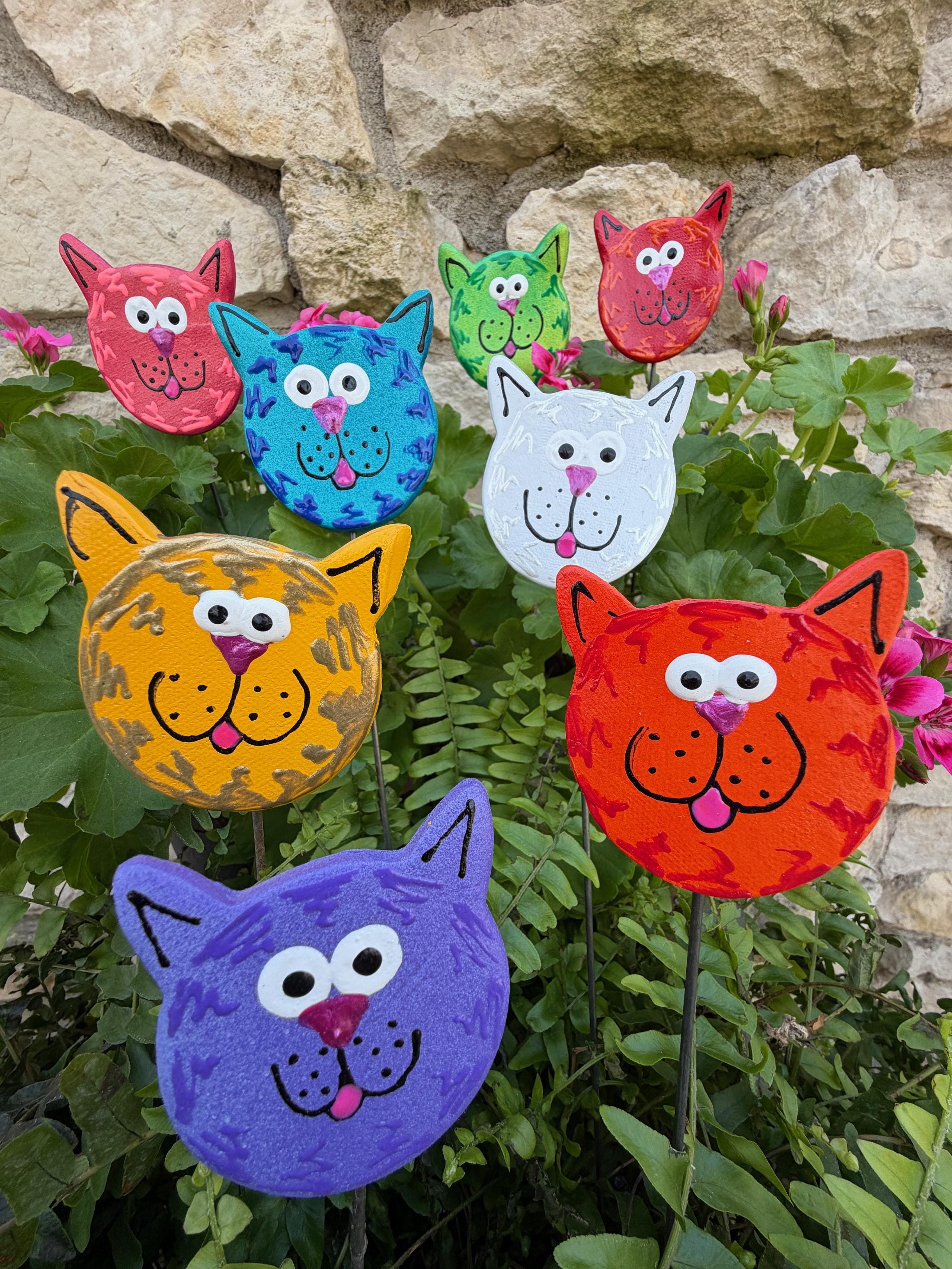 I have 8 different colors to choose from. Red Pink Orange Yellow Green Blue Purple White Add a sweet touch of feline charm to your garden with this handmade White Kitty Cat Face Plant Stake! This whimsical ceramic cat is the perfect accent for flower beds, potted plants, courtyards, or backyard spaces.