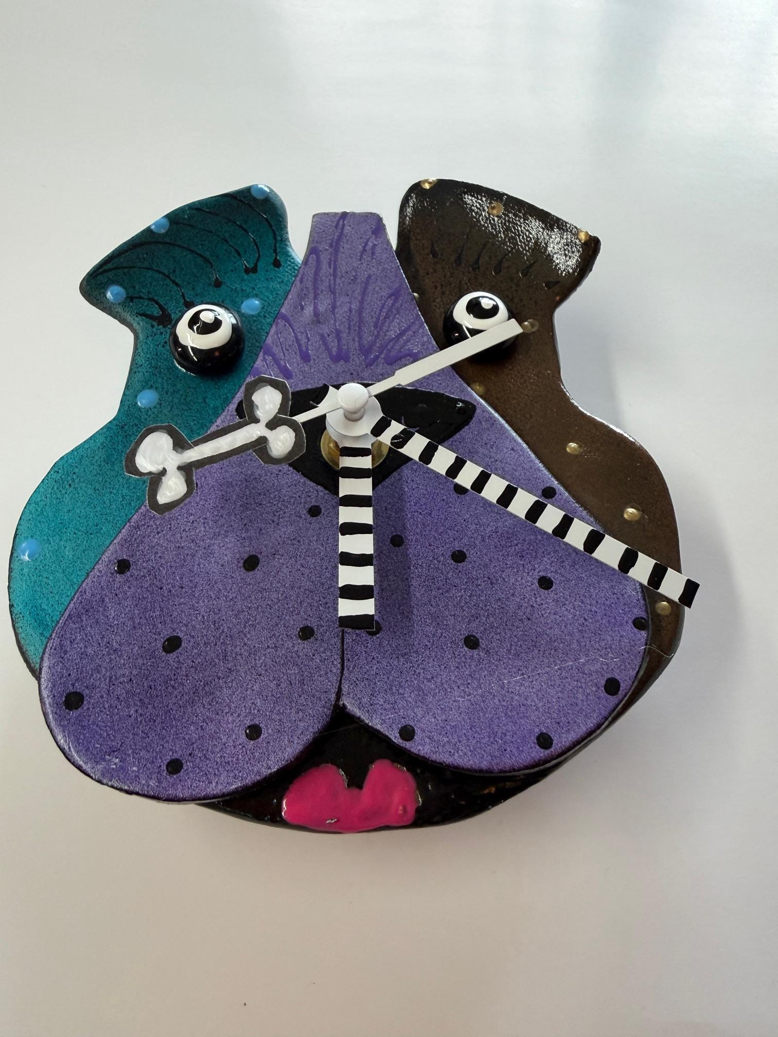 Sized at approximately 6” wide x 5” long x 2” deep, this handcrafted wall clock is made from durable stoneware clay and is perfect for kitchens, covered lanais, steamy bathrooms, or any room in need of a bit of whimsy.