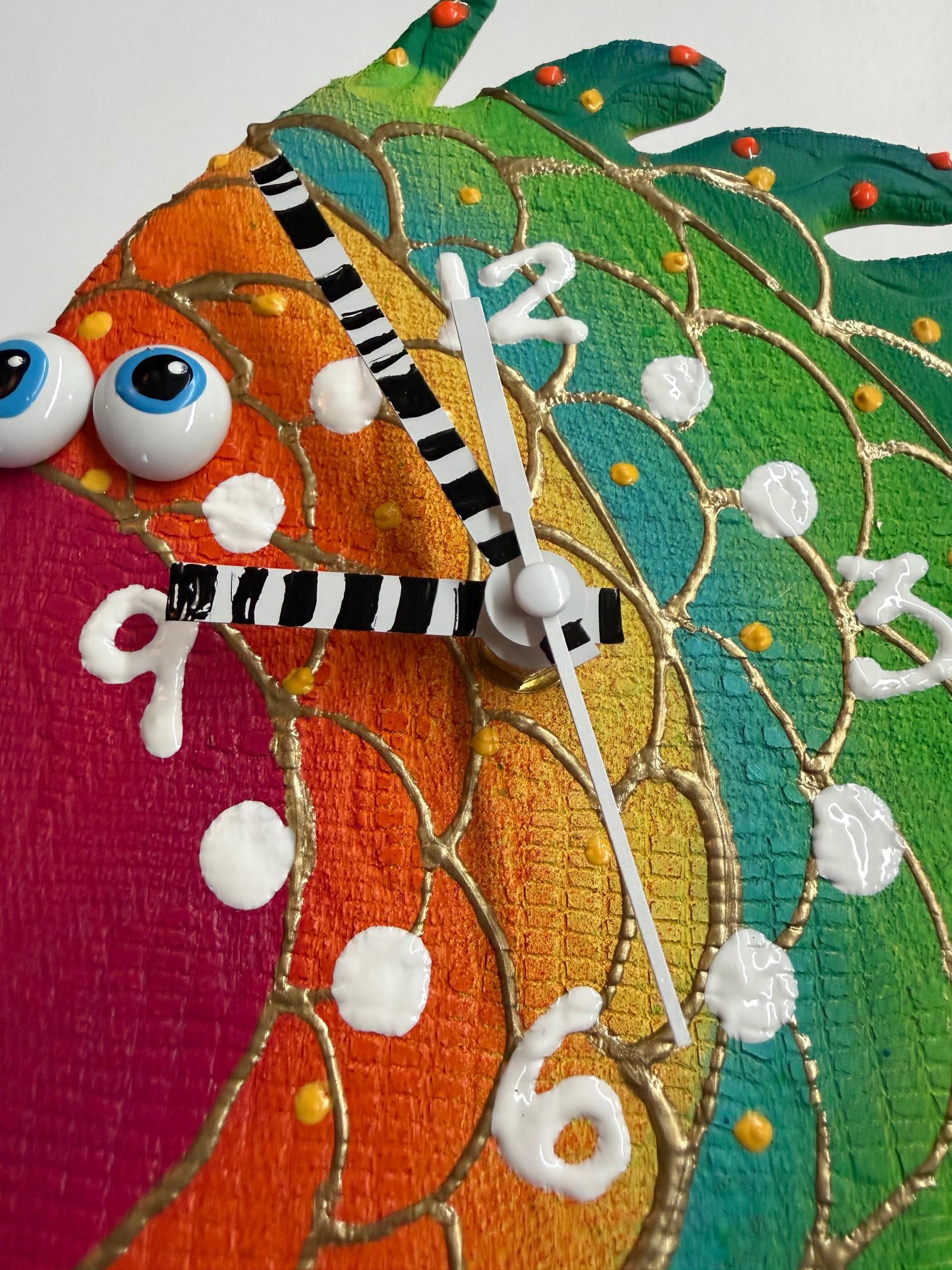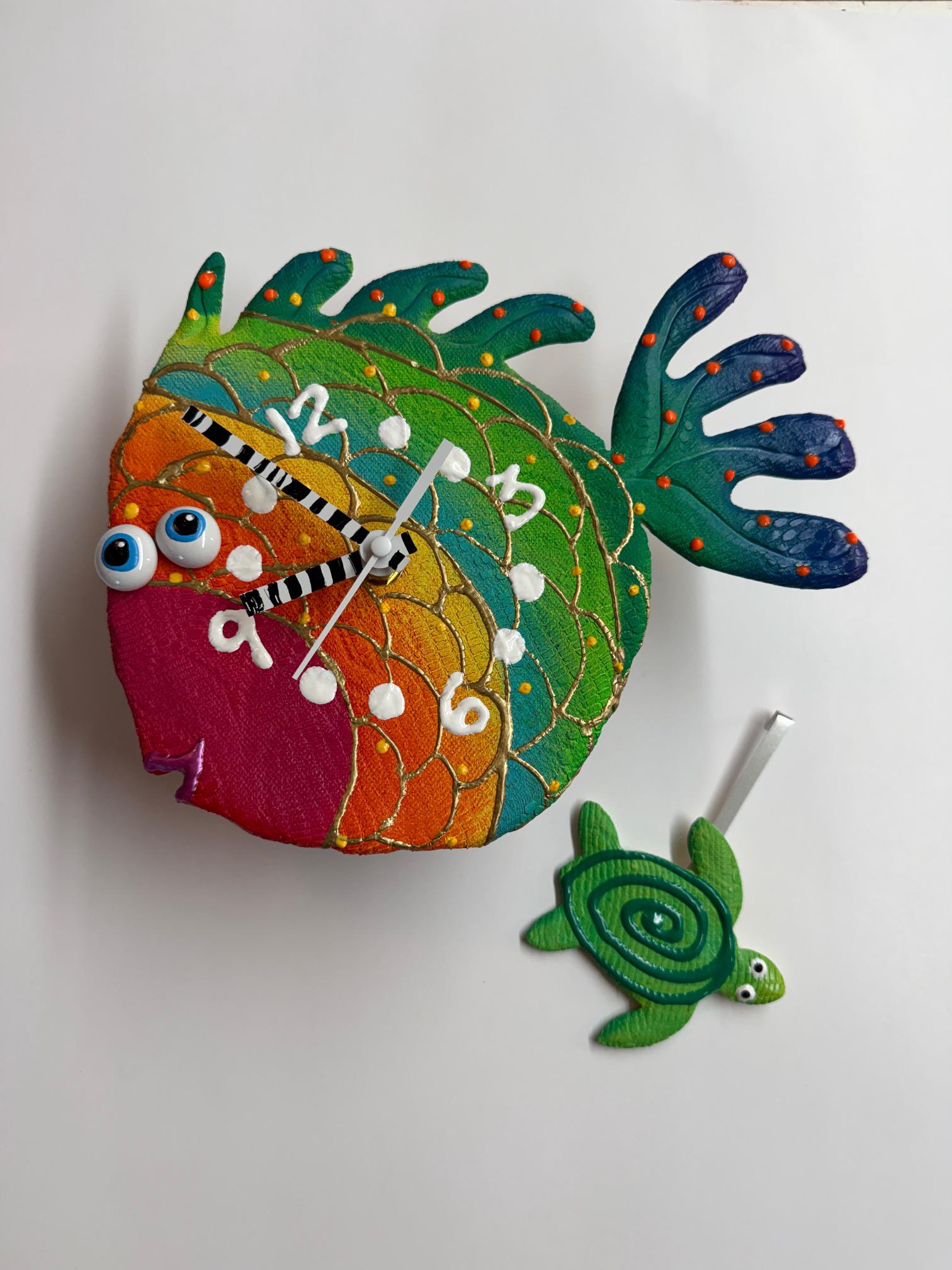 Each clock is meticulously crafted from a ball of stoneware clay, then fired in the kiln for lasting strength. The vibrant colors are achieved through a unique finish process that combines acrylics and ceramic stains, creating a wide range of eye-catching hues and textures. With its swinging rainbow fish pendulum, this piece adds a gentle motion to the design, making it a dynamic and playful addition to any wall.