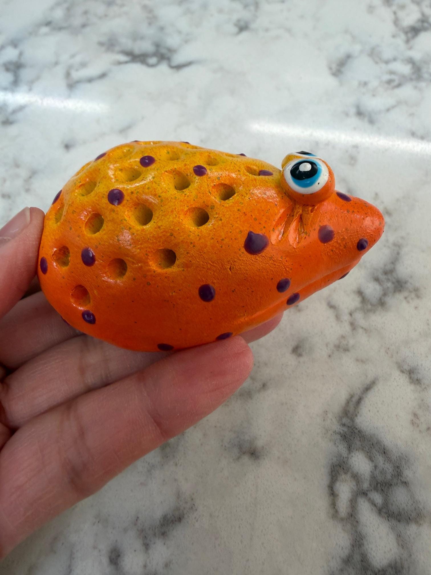 The finish on each piece is a base coat of acrylic paint with ceramic stains and textured acrylic paint detailing. I prefer using acrylic paints over traditional ceramic glazes because they afford me a much wider range of color which adds to the whimsy of my work.