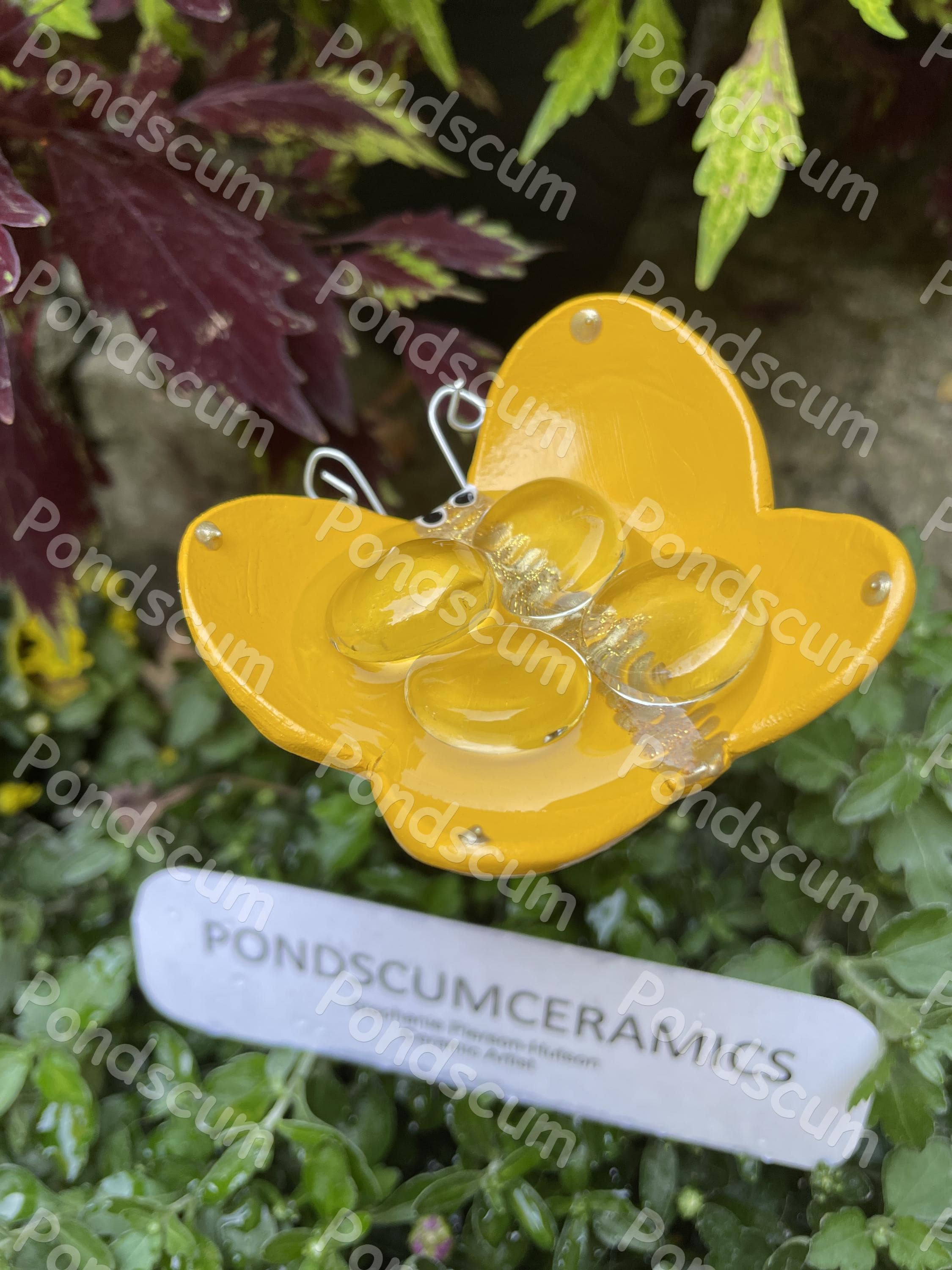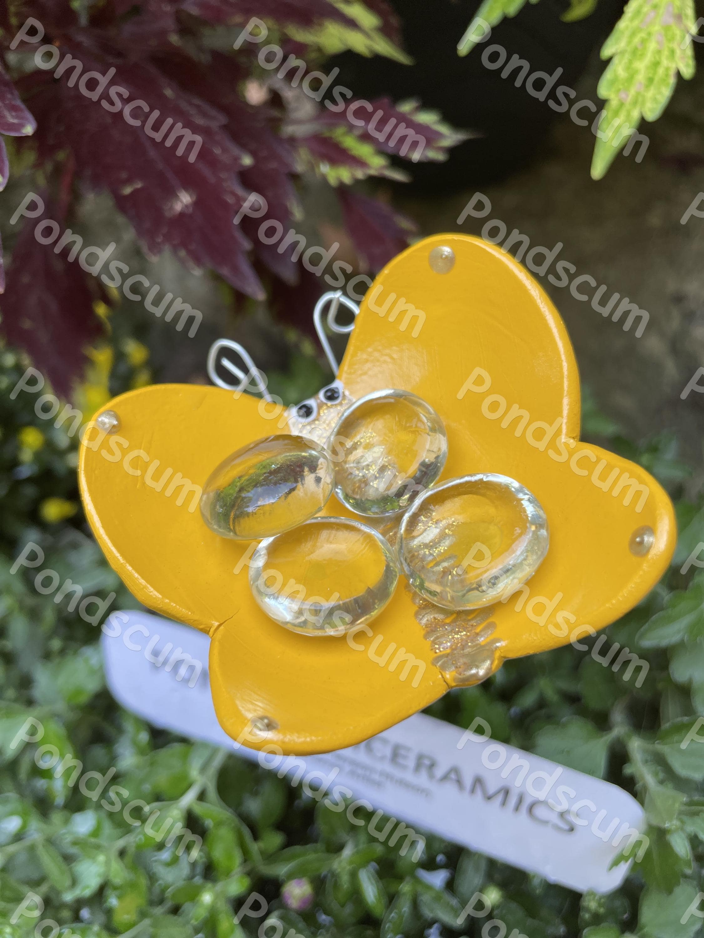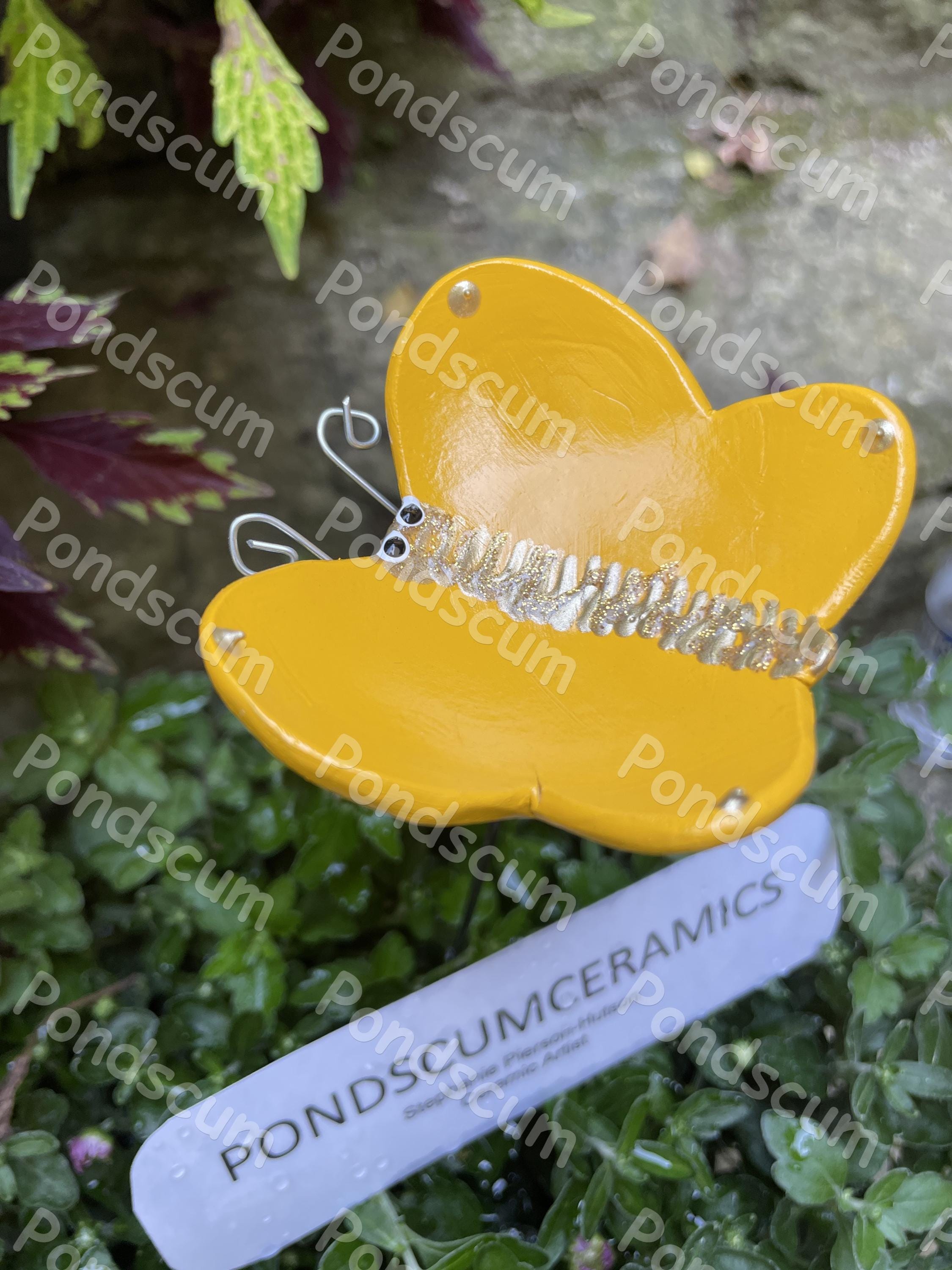 Yellow Butterfly Puddler Bee Watering Station – Ceramic Bee Bath Garden Stake – Pollinator Safe Water Feeder