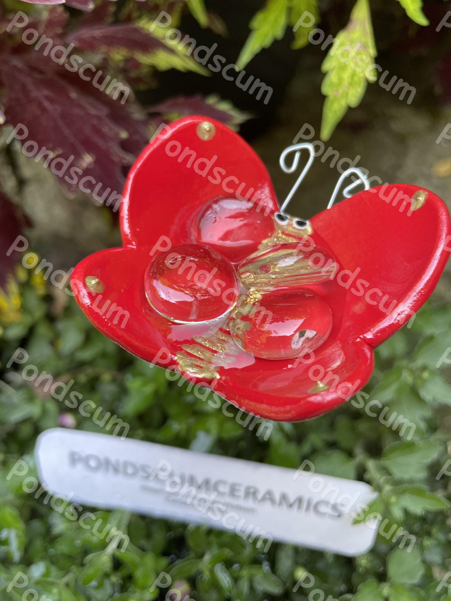 Red Butterfly Puddler Bee Watering Station – Ceramic Bee Bath Garden Stake – Pollinator Safe Water Feeder