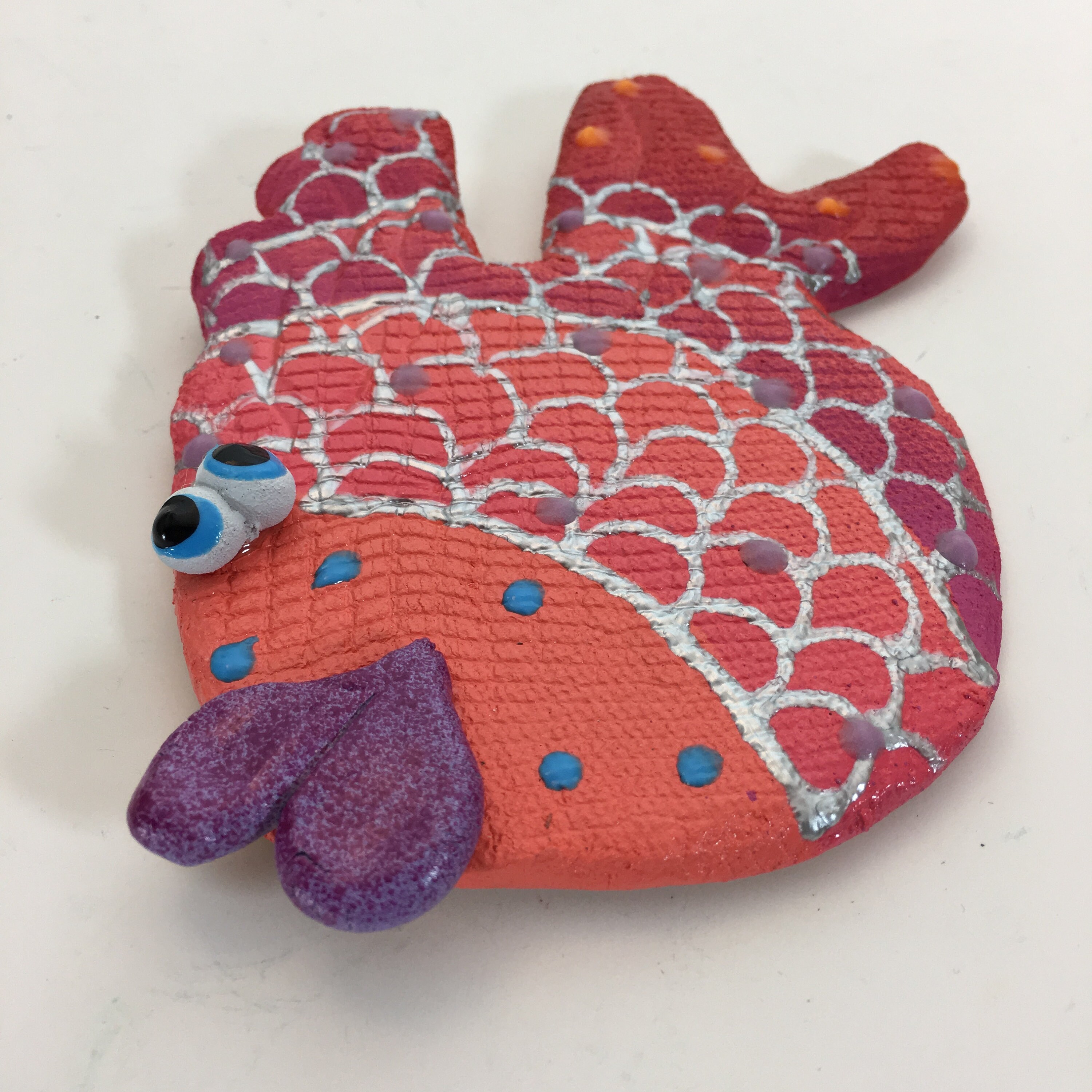 Perfect for your bathroom, bedroom, child's nursery or any room in your home. Dimensions 3.5''' tall by 4. 5'' wide. The finish on each piece is a base coat of acrylic paint with ceramic stains and textured acrylic paint detailing. I prefer using acrylic paints over traditional ceramic glazes because they afford me a much wider range of color which adds to the whimsy of my work. This guy has some dimensional glow in the dark paint on him as well to give him a little extra interest. He hangs on a wire loop on his backside. I have been working with clay for over 20 years. You will receive a quality ceramic art piece. I hope you enjoy my work as much as I enjoy making them.