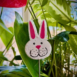The Alien-Monster is made from white stoneware clay, is 6'' x 8'' x 5''. It has a green garden stake, making it 25" tall.