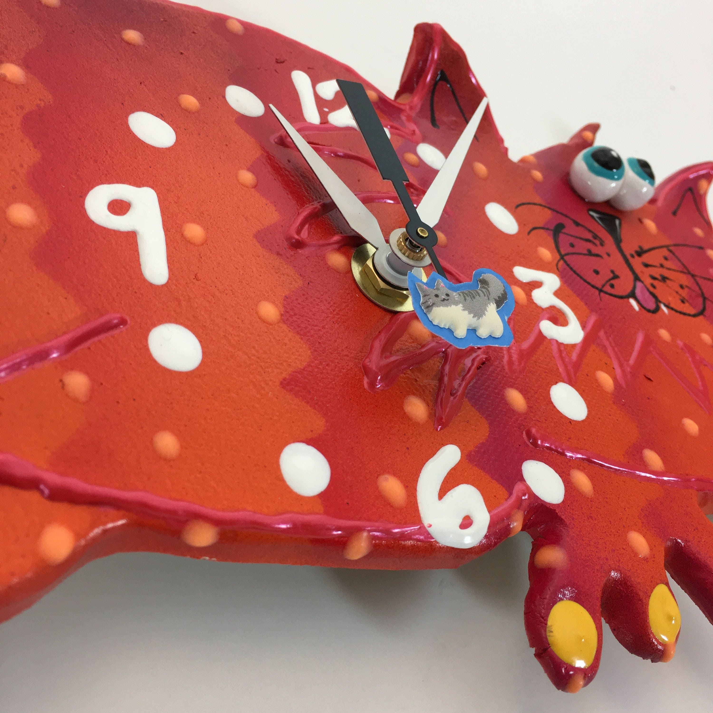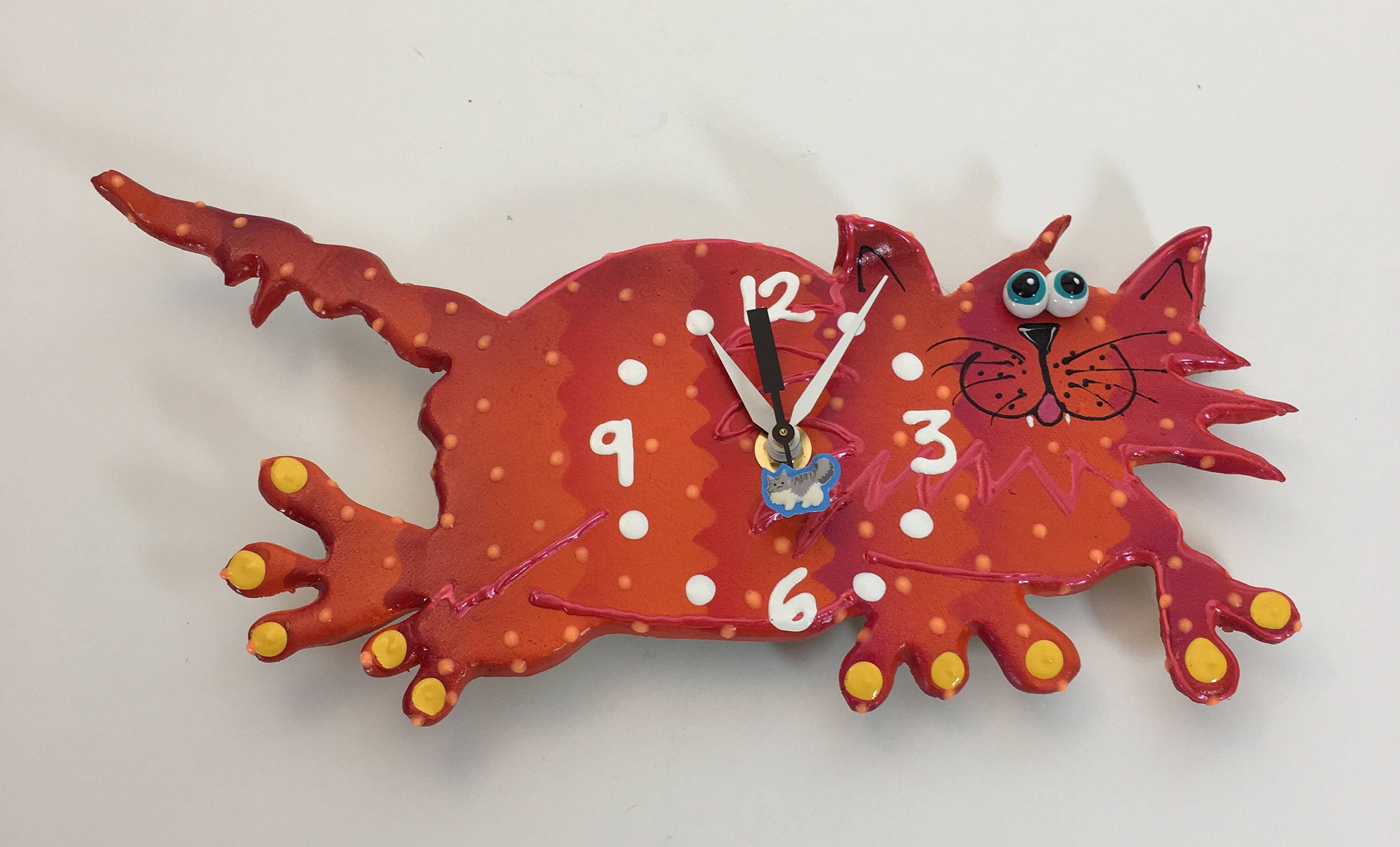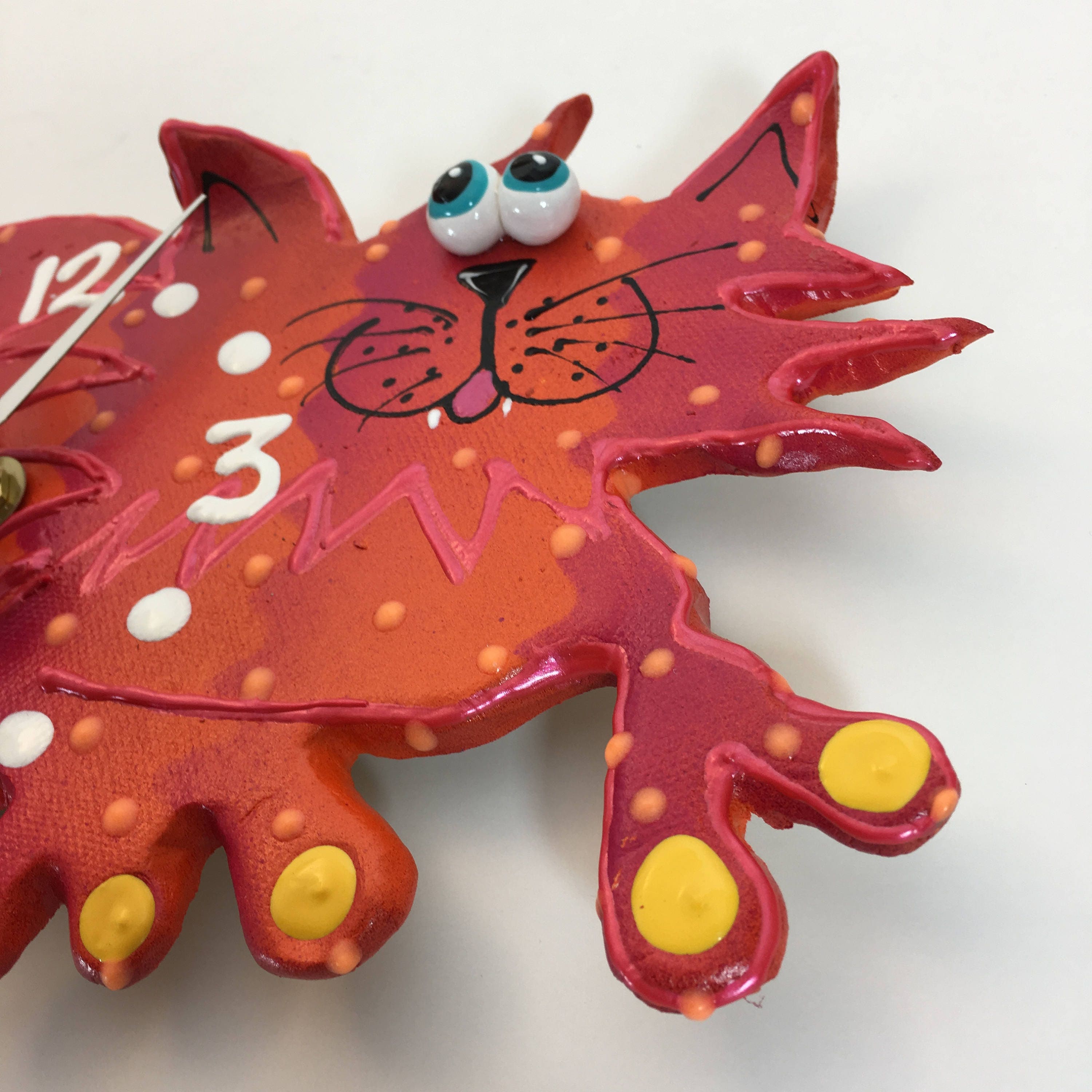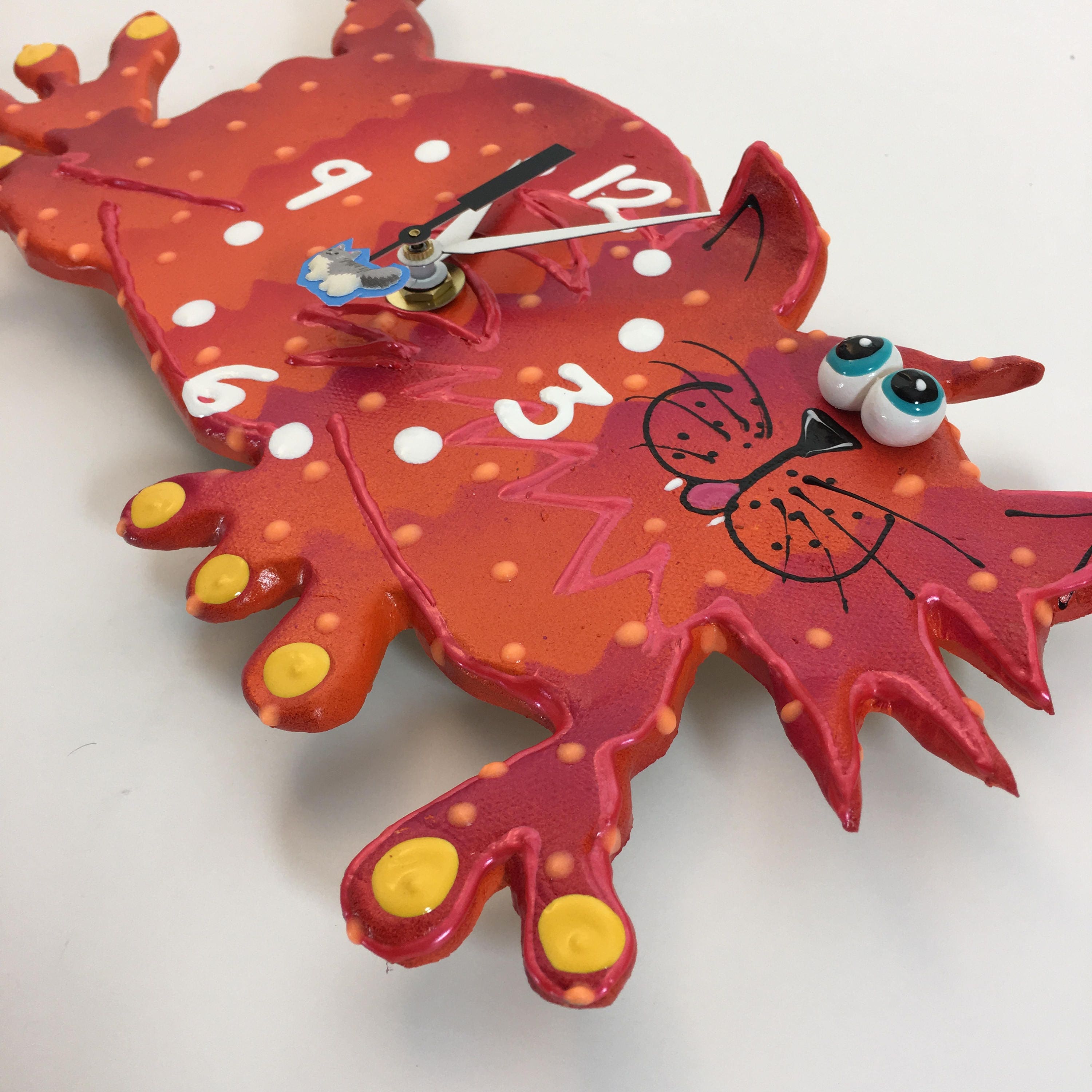 This ceramic clock is ready to hang on a wall or to place on a plate holder . Each clock is durable and suitable for hanging in any room. They're great in kitchens, steamy bathrooms, and lanais, as long as it is covered by a roof! Children and adults, of all ages, love the whimsy of my clocks. Once you turn off the lights enjoy the glow in the dark highlights. This bright and playful clock will add a little bit of fun to your playroom, nursery or kid's bedroom or bathroom. The finish on each piece is a base coat of acrylic paint with ceramic stains and textured acrylic paint detailing. I prefer using acrylic paints over traditional ceramic glazes because they afford me a much wider range of color which adds to the whimsy of my work.