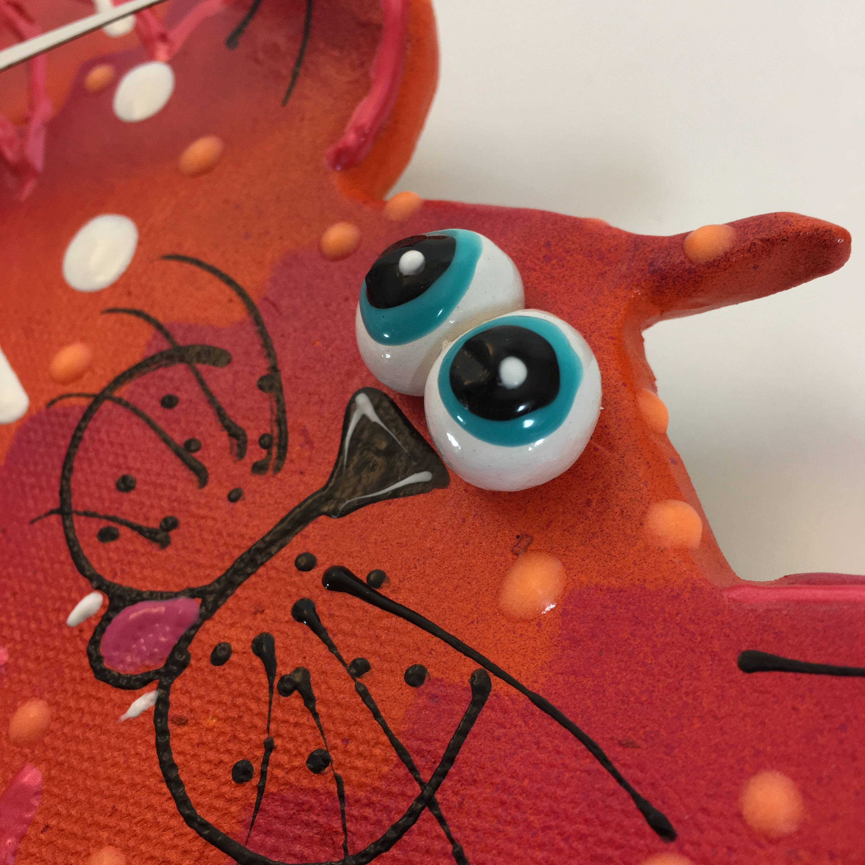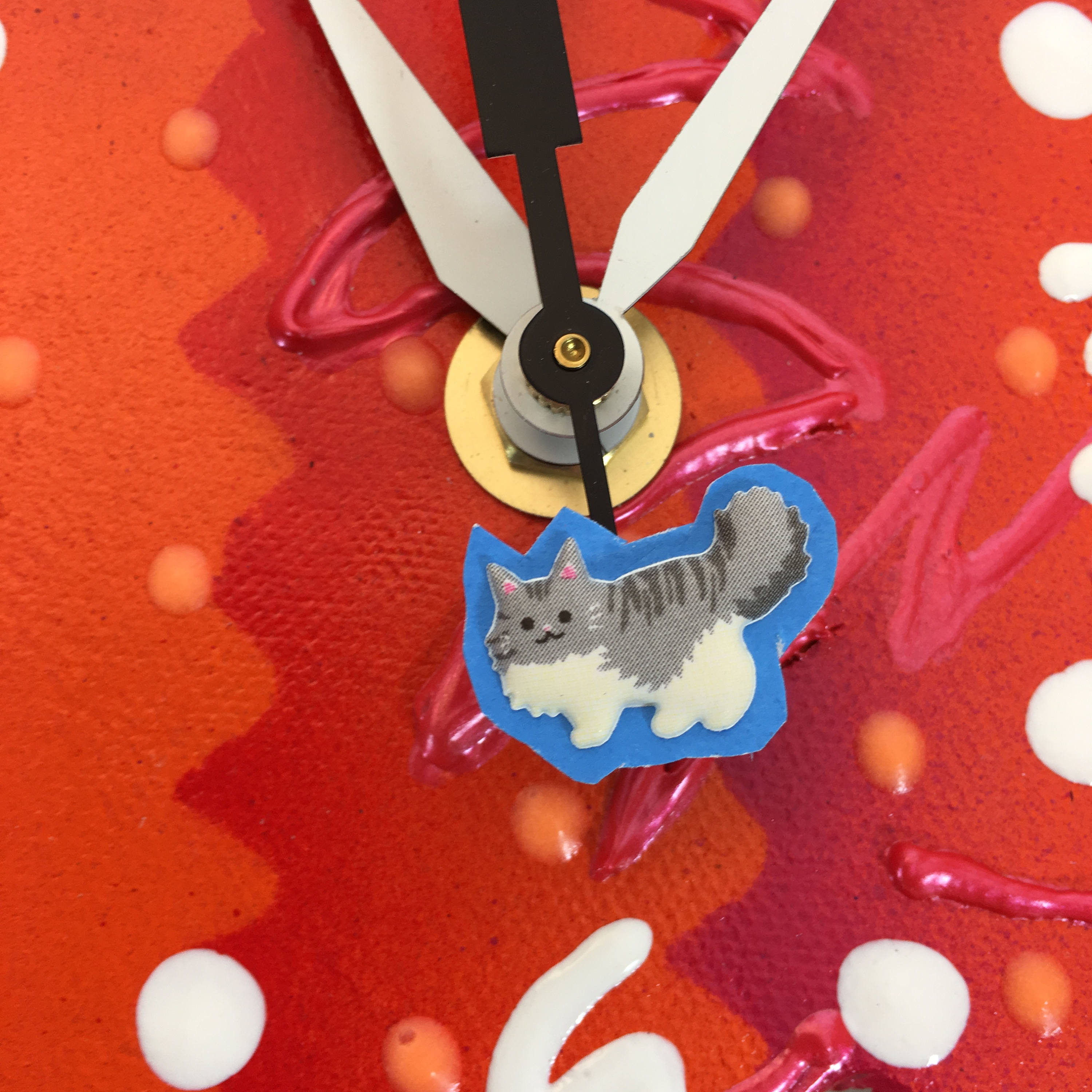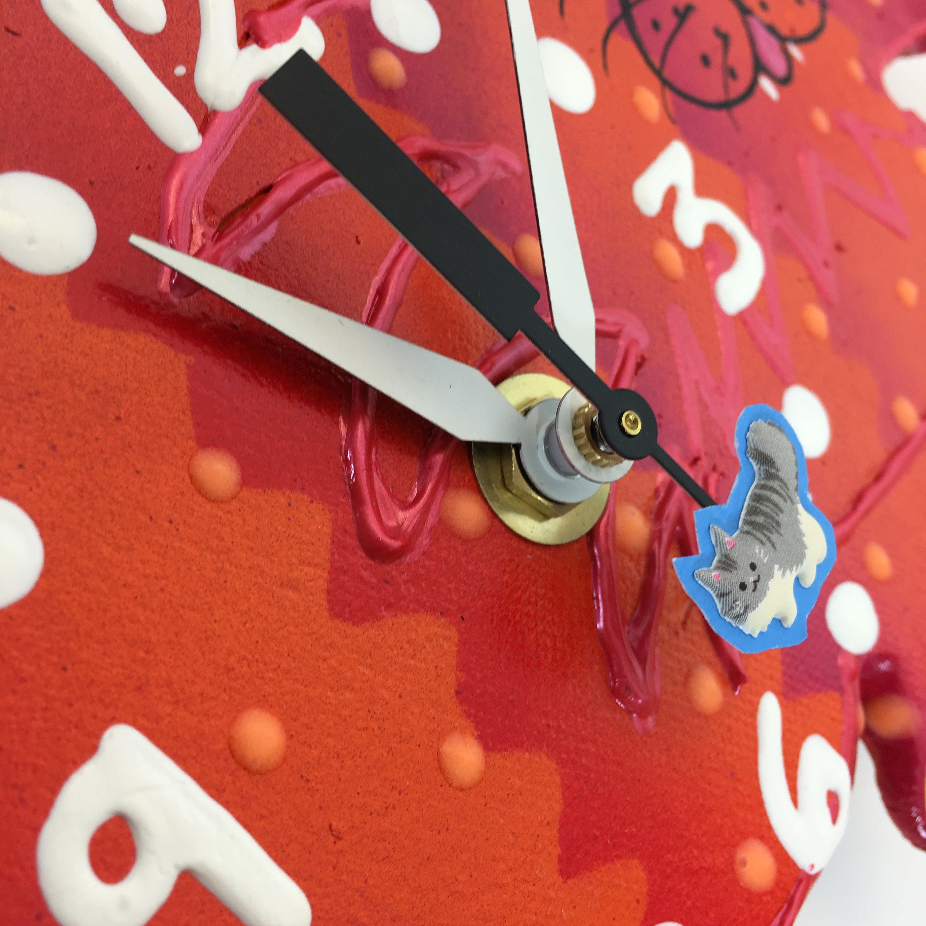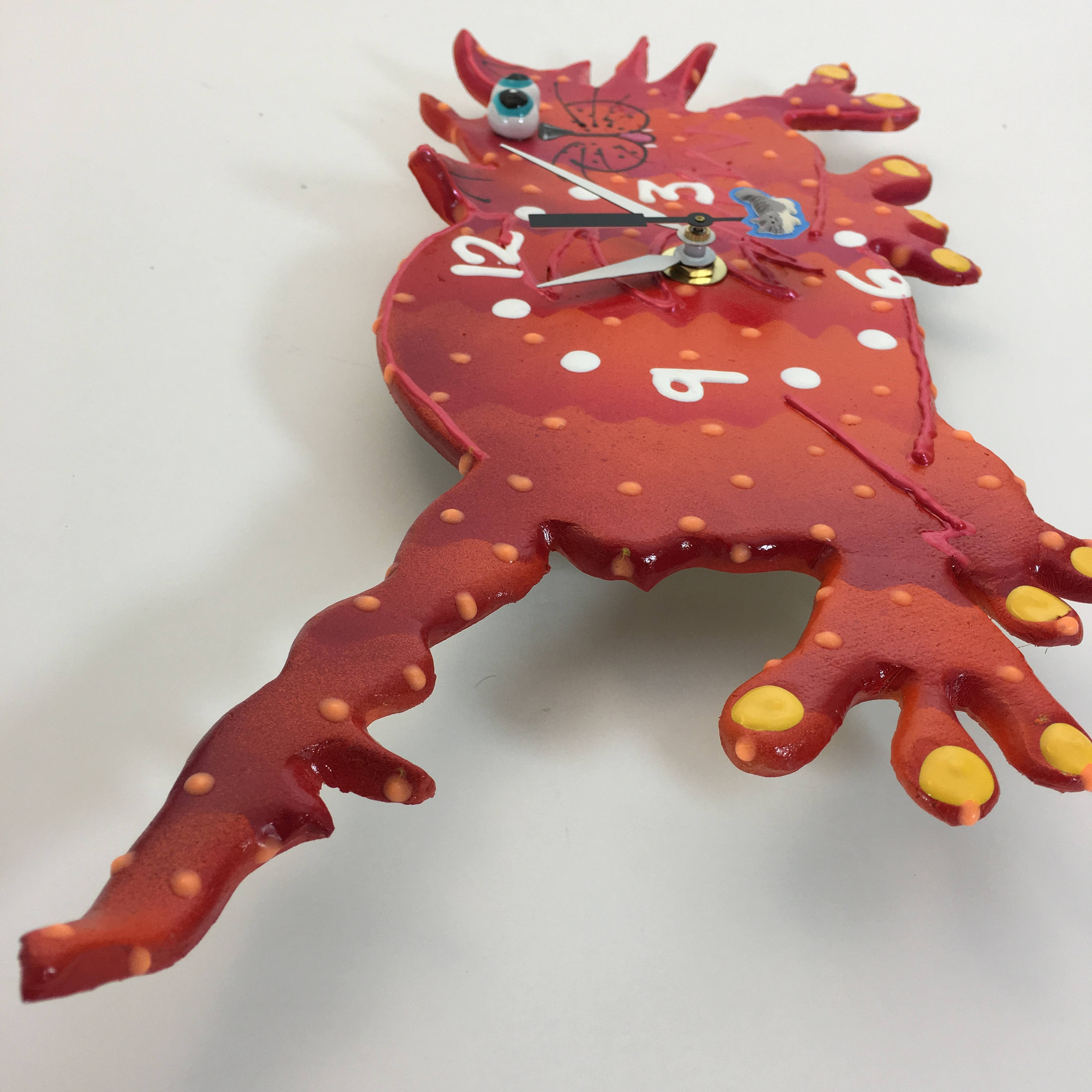 This ceramic clock is ready to hang on a wall or to place on a plate holder . Each clock is durable and suitable for hanging in any room. They're great in kitchens, steamy bathrooms, and lanais, as long as it is covered by a roof! Children and adults, of all ages, love the whimsy of my clocks. Once you turn off the lights enjoy the glow in the dark highlights. This bright and playful clock will add a little bit of fun to your playroom, nursery or kid's bedroom or bathroom. The finish on each piece is a base coat of acrylic paint with ceramic stains and textured acrylic paint detailing. I prefer using acrylic paints over traditional ceramic glazes because they afford me a much wider range of color which adds to the whimsy of my work.