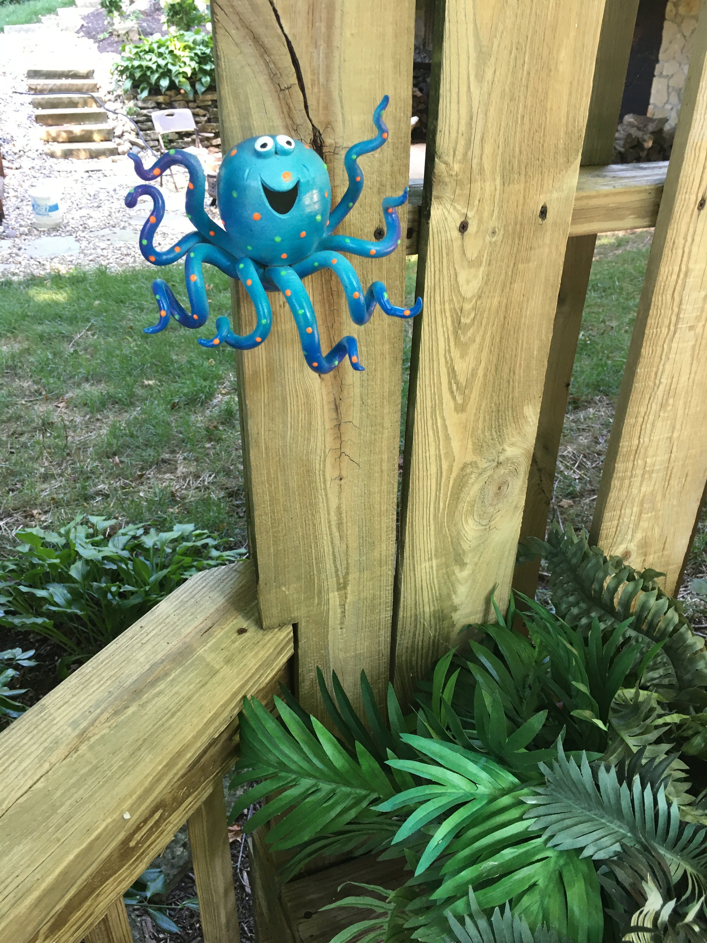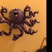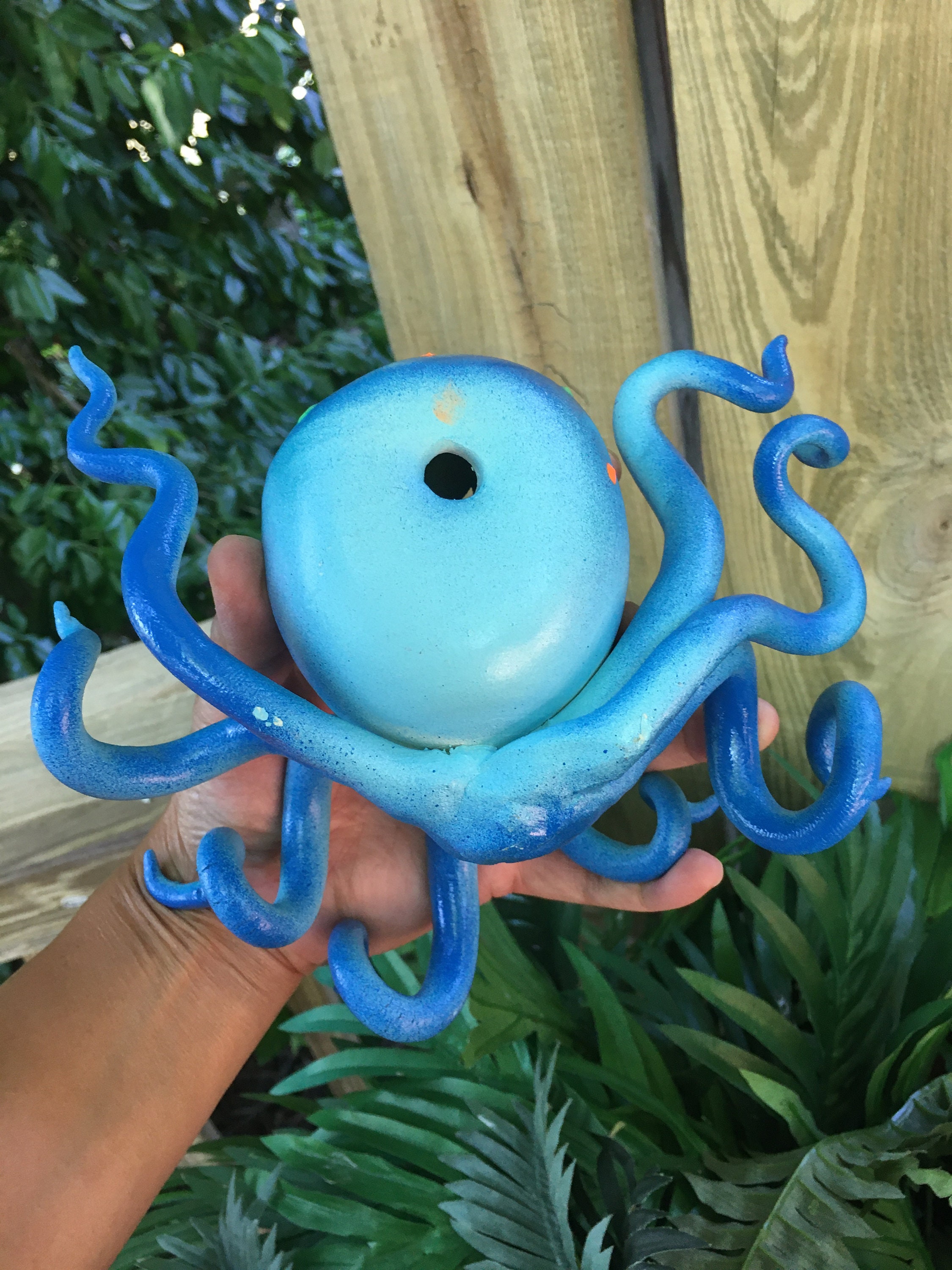 Octopus Wall Decoration, Dimensions 4.5 in. tall x 7 in. wide x 9 in. long Sea life is very mysterious and fascinating to me. Octopi are critters I just can't get enough of, with their dancing legs and the way they live in caves and hoard all kinds of random treasures they find under the sea. Fascinating! The finish on each piece is a base coat of acrylic paint with ceramic stains and textured acrylic paint detailing. I prefer using acrylic paints over traditional ceramic glazes because they afford me a much wider range of color which adds to the whimsy of my work. This octopus has a hole drilled into the backside for easy hanging.