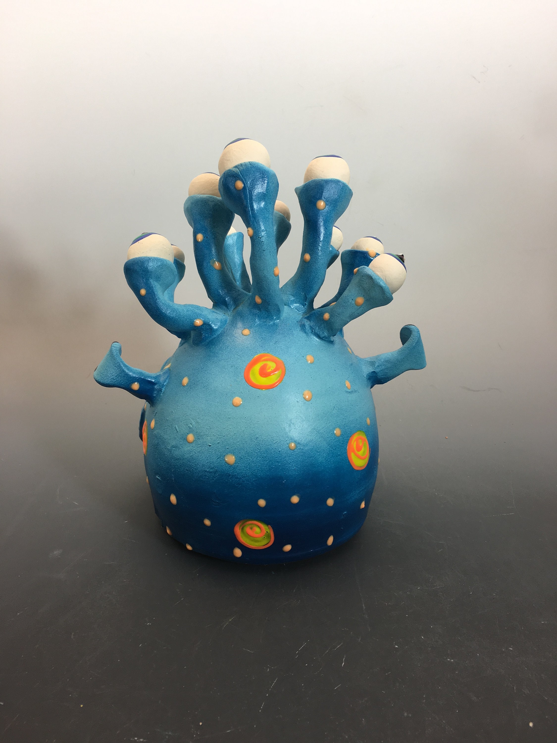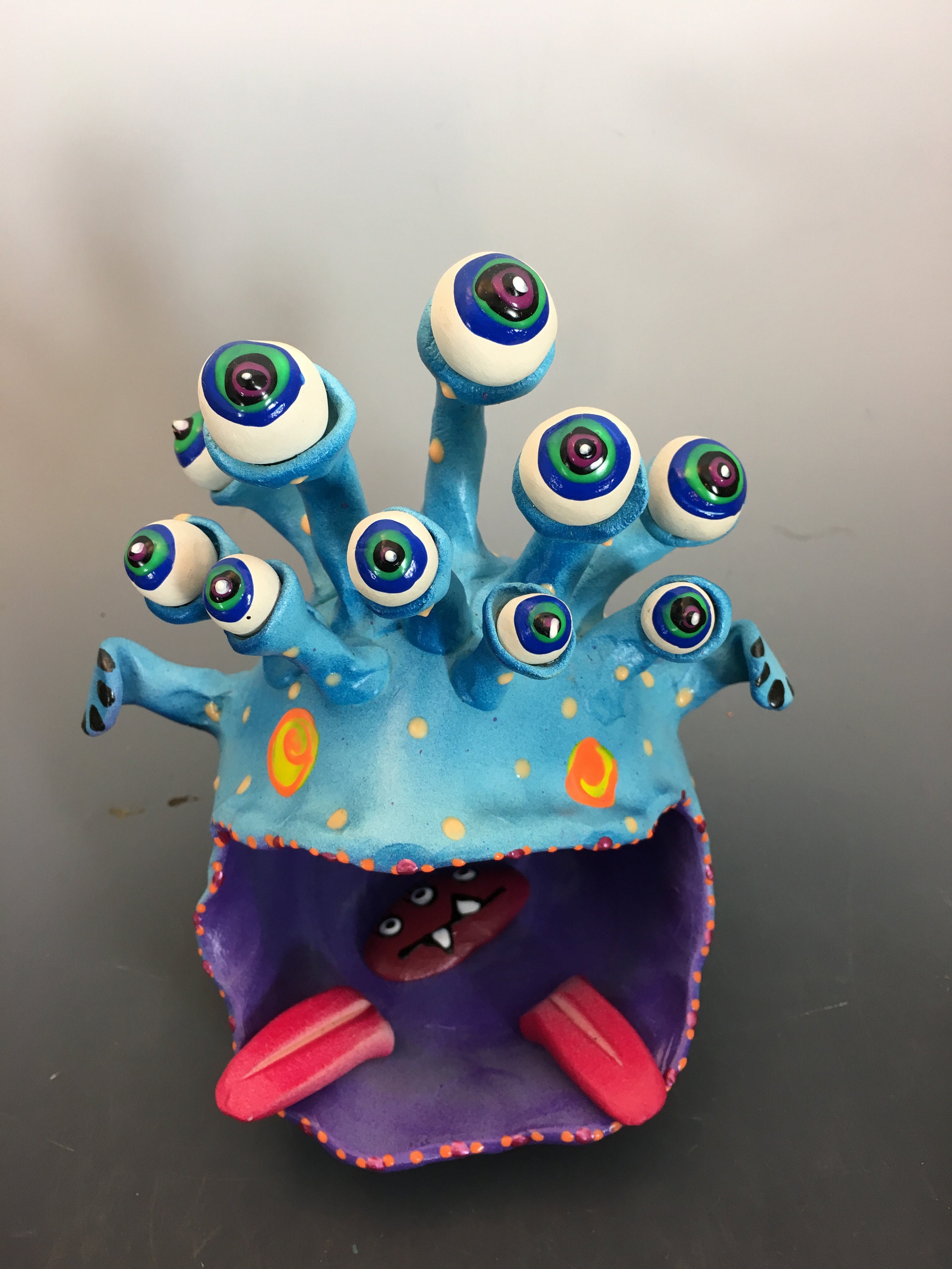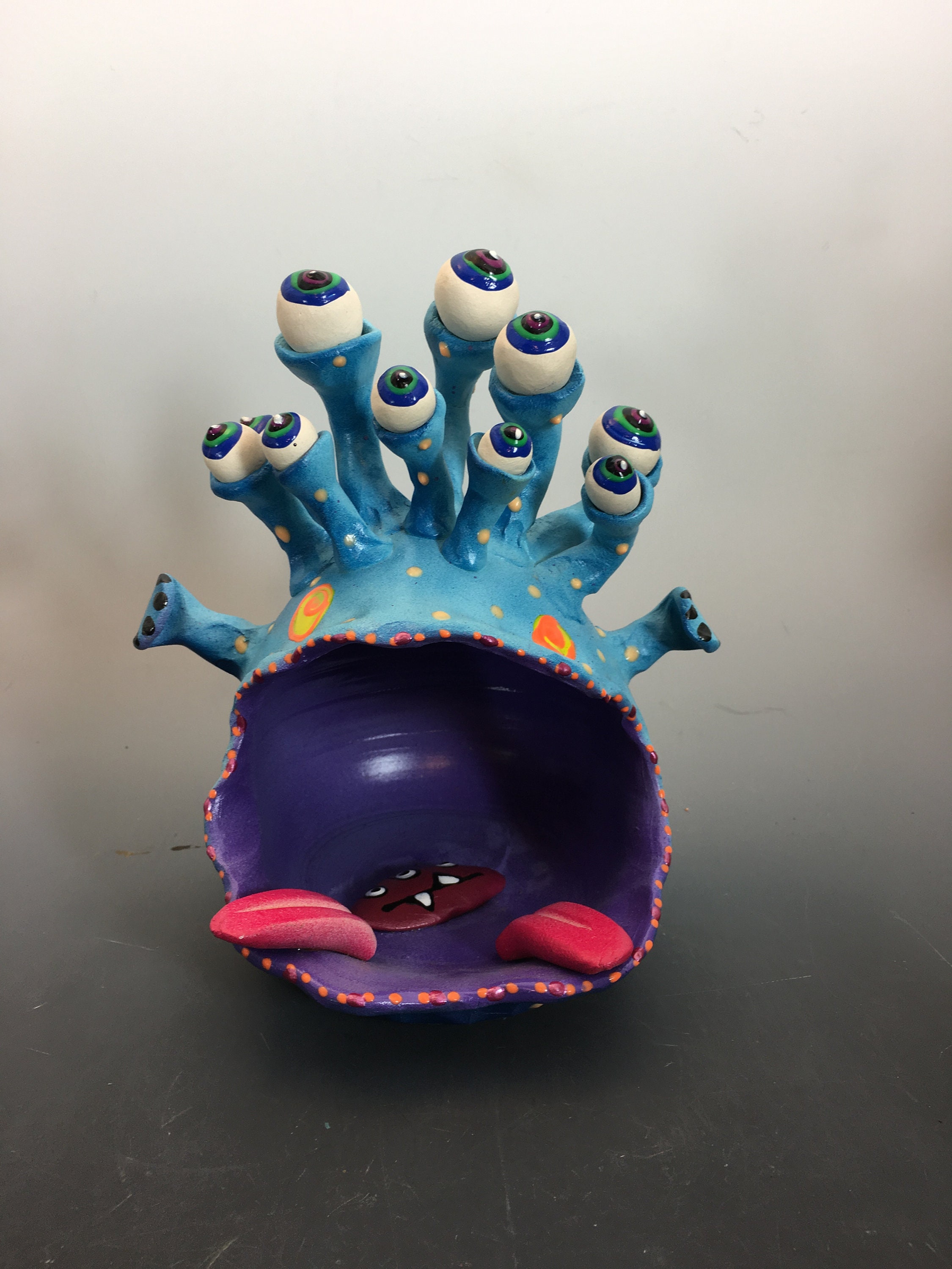 This 10 -eyed ceramic monster has a big wide mouth so you can stuff him full of candy, or with what ever his big mouth can hold! He is 7 inches tall, 7 inches wide, and has a 6 inch diameter.