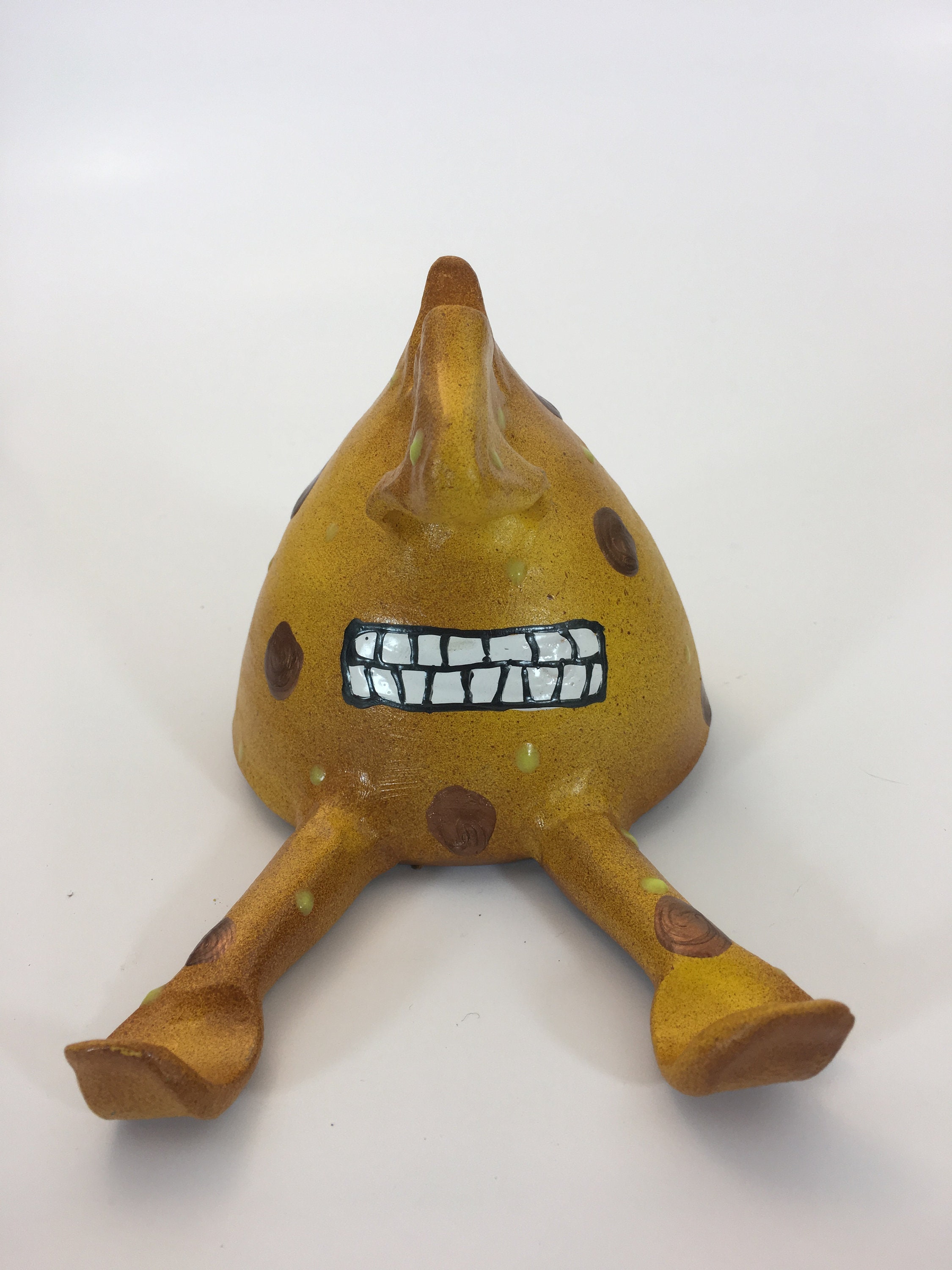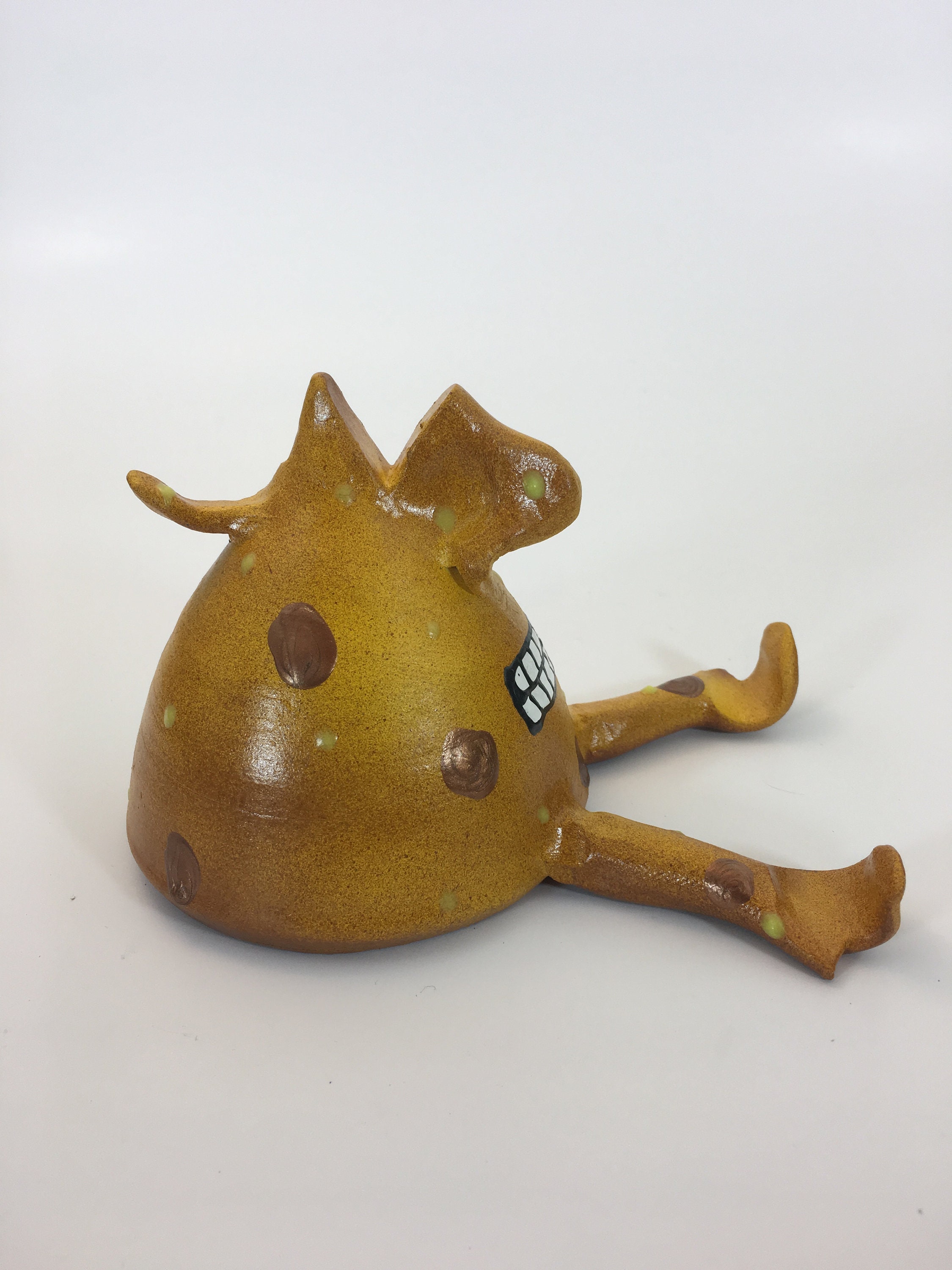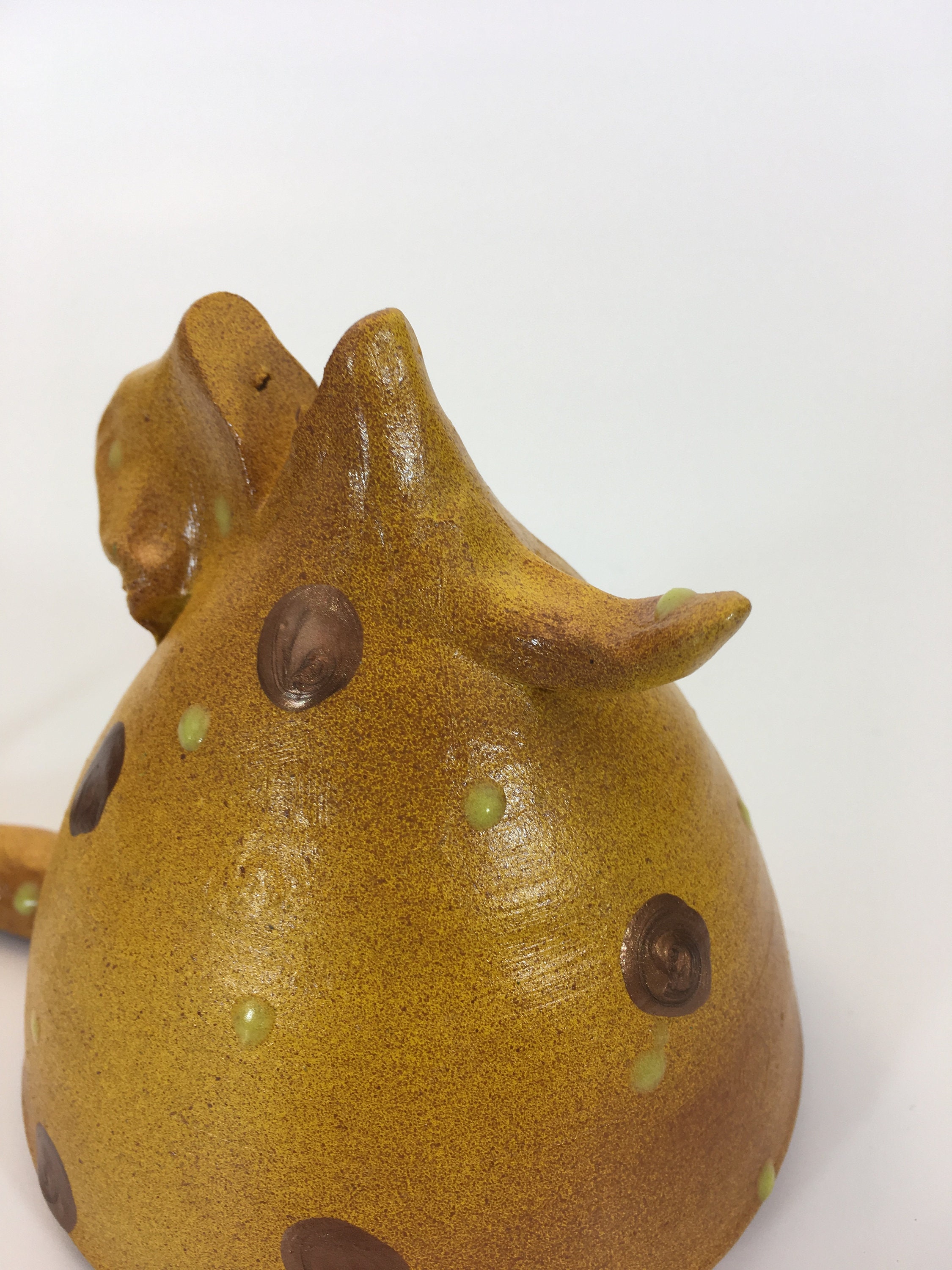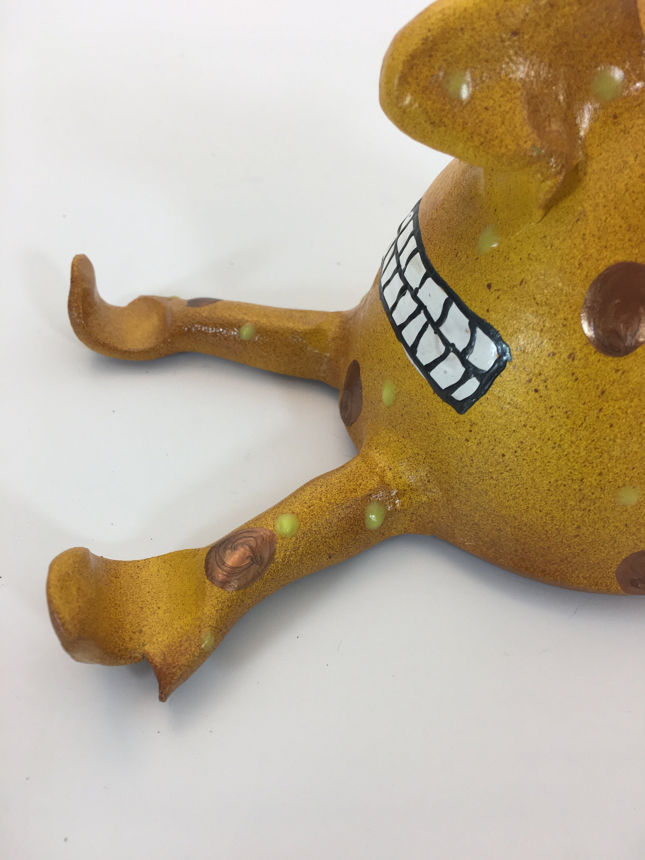 The finish on each piece is a base coat of acrylic paint with ceramic stains and textured acrylic paint detailing. I prefer using acrylic paints over traditional ceramic glazes because they afford me a much wider range of color which adds to the whimsy of my work.