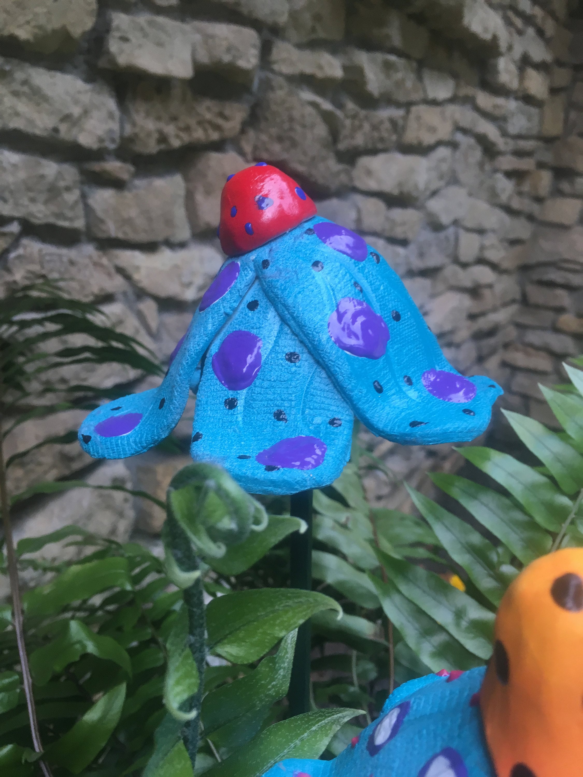 Each Whimsical ceramic flower measures approximately 6 x 6 x 3 inches. With a separate green metal rod 24 inches tall.