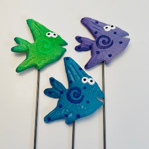 Measuring approximately 16 inches in height and 4 inches in width, this handcrafted fish stake is made from durable white stoneware clay and finished with a weatherproof gloss coating, making it suitable for both indoor and outdoor use. The ceramic stains and textured acrylic paint detailing provide a unique touch, making each piece one-of-a-kind.