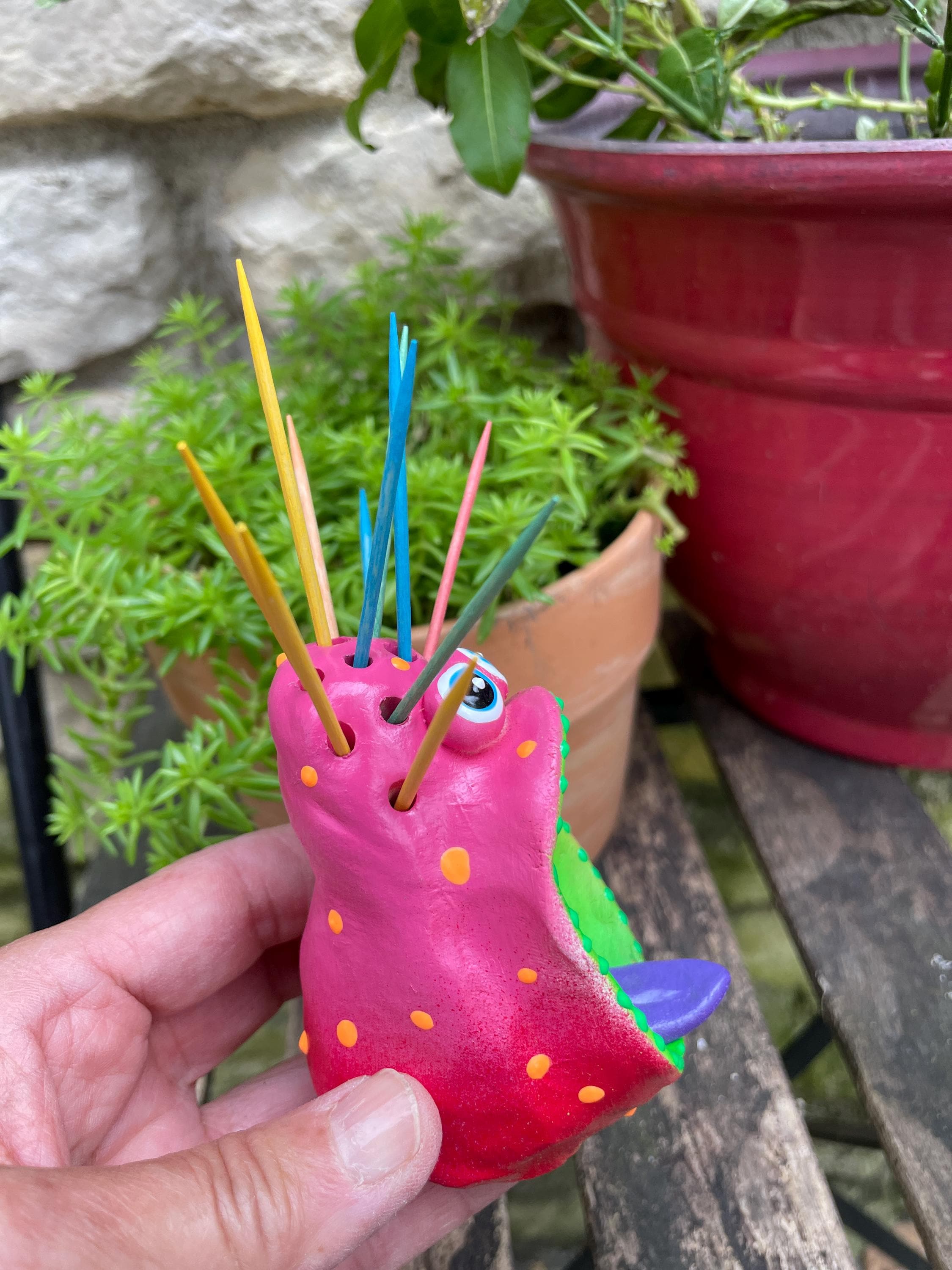 Care Instructions: To clean, use a damp, soapy sponge. Avoid abrasives to preserve the hand-painted finish. Each piece is hand-built, so expect charming variations that make each Monster Alien Toothpick Holder truly unique.