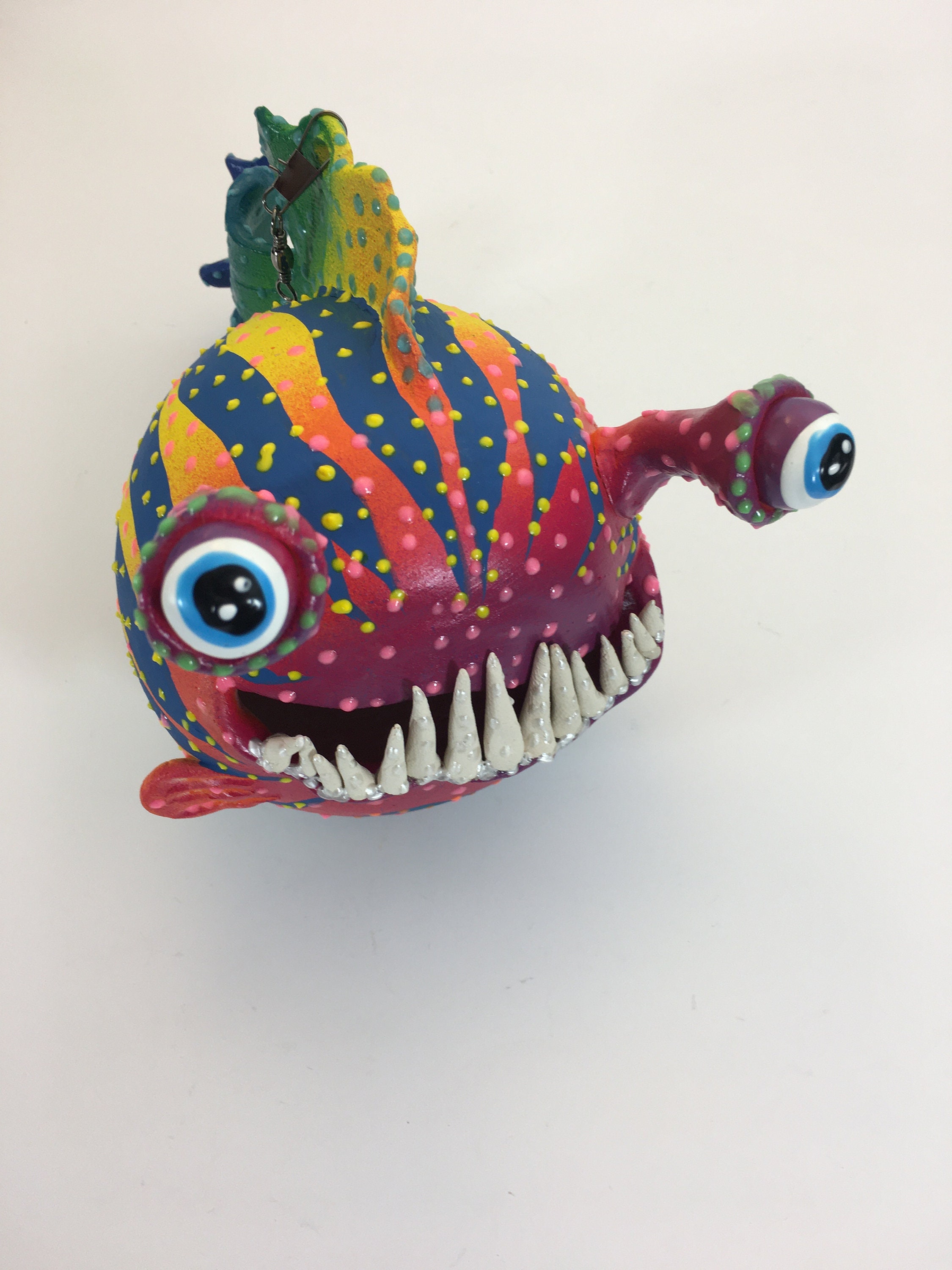 The finish on each piece is a base coat of acrylic paint with ceramic stains and textured acrylic paint detailing. I prefer using acrylic paints over traditional ceramic glazes because they afford me a much wider range of color which adds to the whimsy of my work. This guy has some dimensional glow in the dark paint on him as well to give him a little extra interest. To keep your ceramics clean just wipe with a soft damp cloth. Ceramics last forever when properly cared for and this very cool handmade hanging blowfish will surely brighten up your home for years to come. I have been working with clay for over 20 years. You will receive a quality ceramic art piece. I hope you enjoy my work as much as I enjoy making them.
