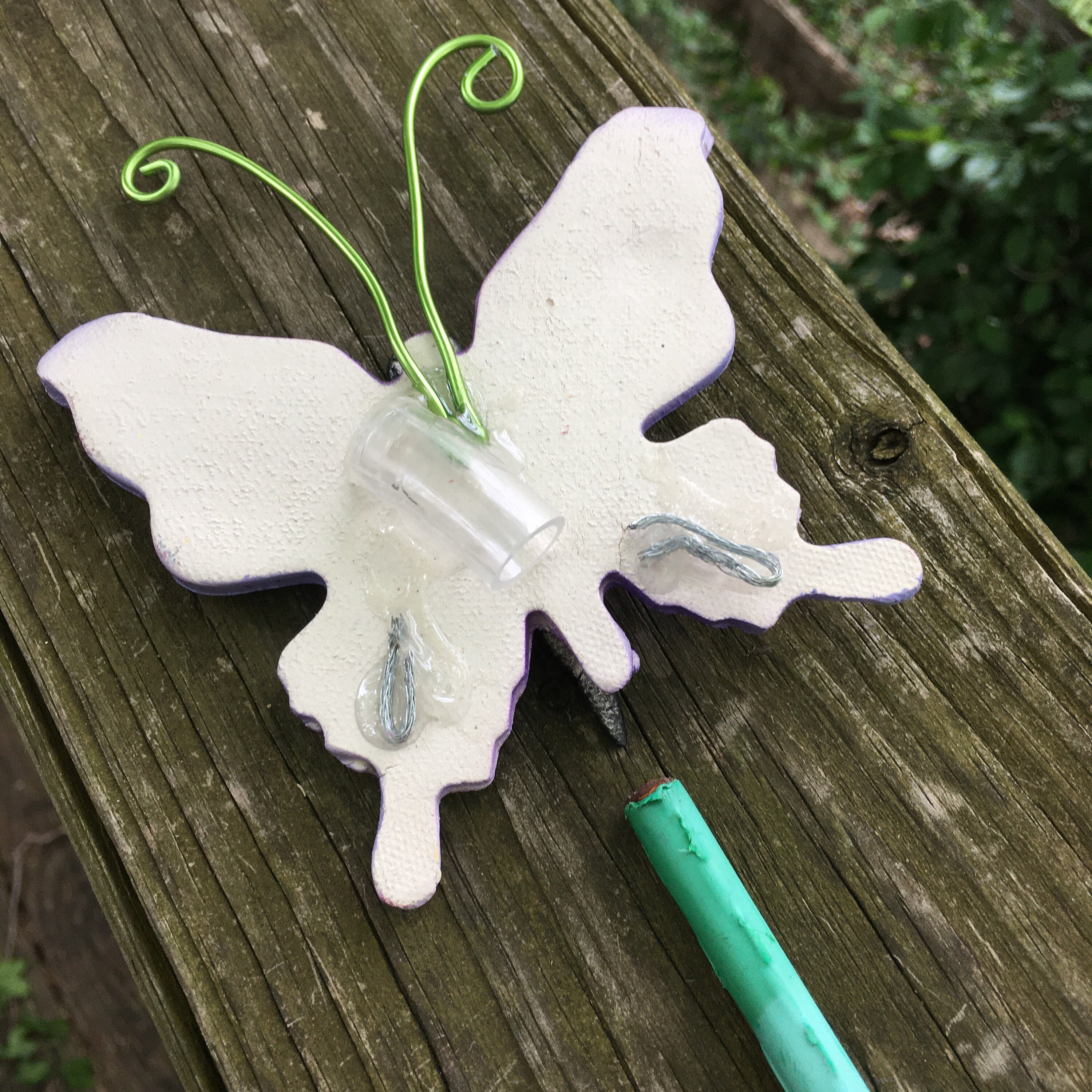 The Butterfly has a plastic tube glued to the back side of the piece. It also comes with a 12 inch green metal rod.