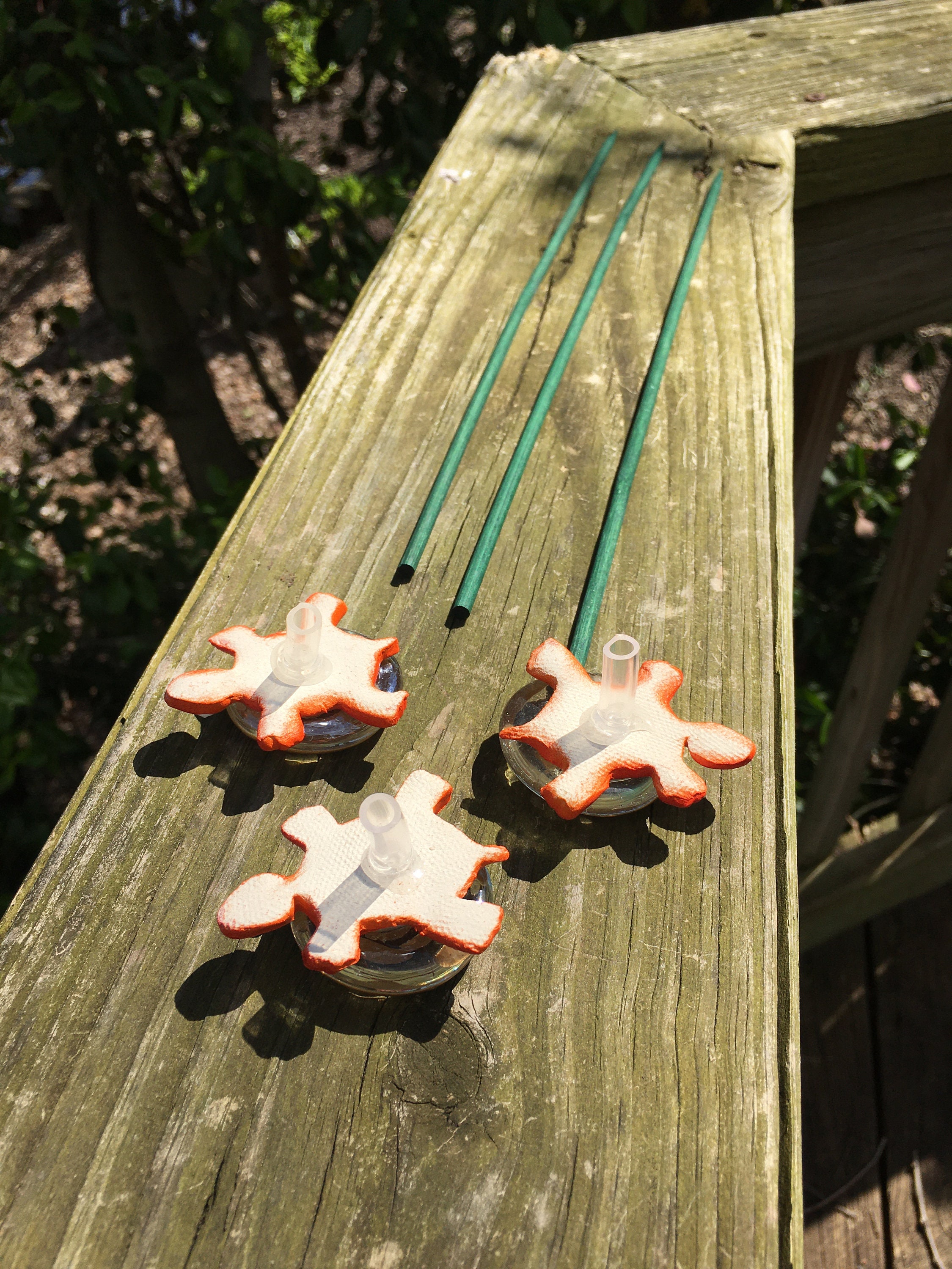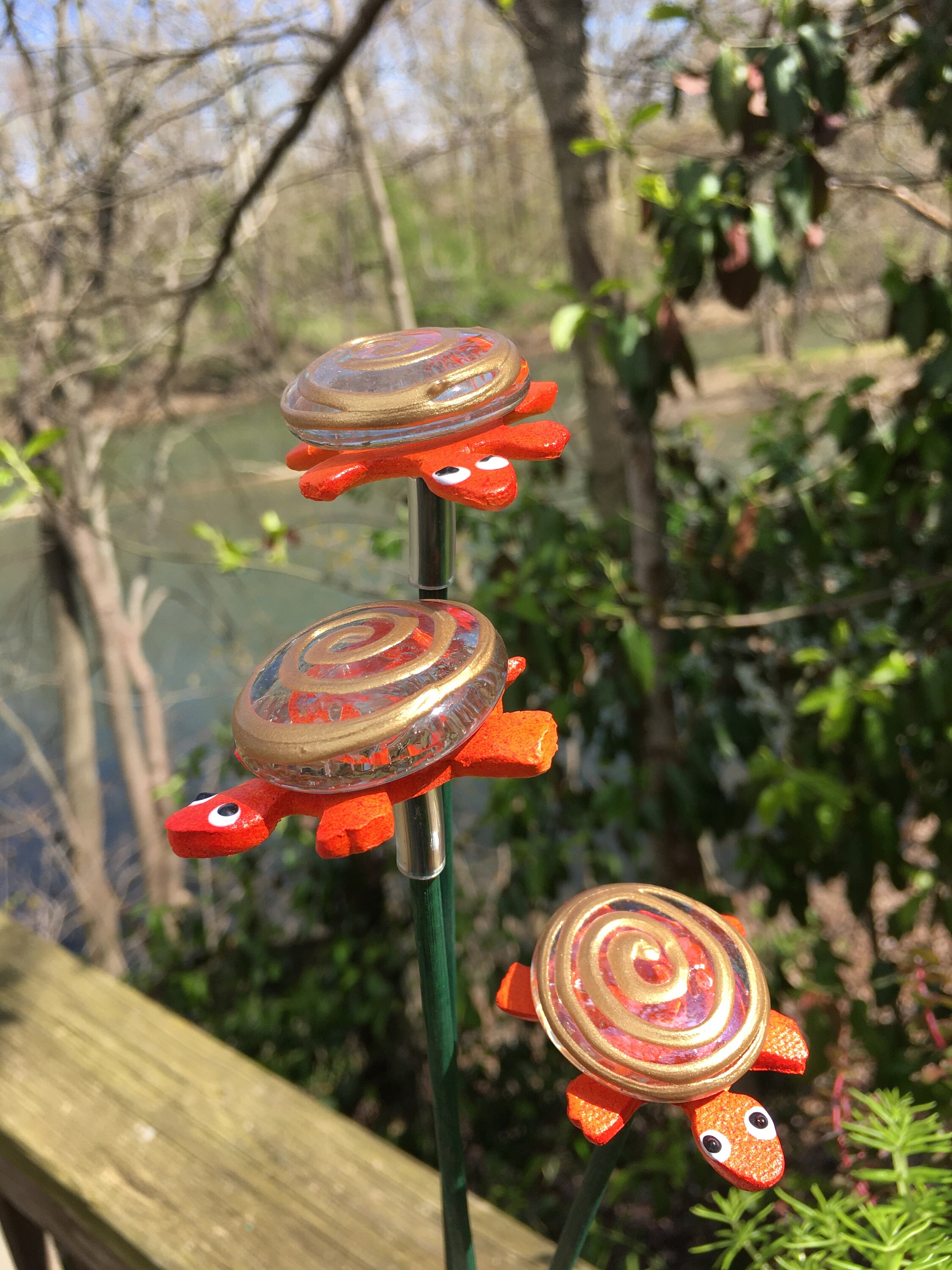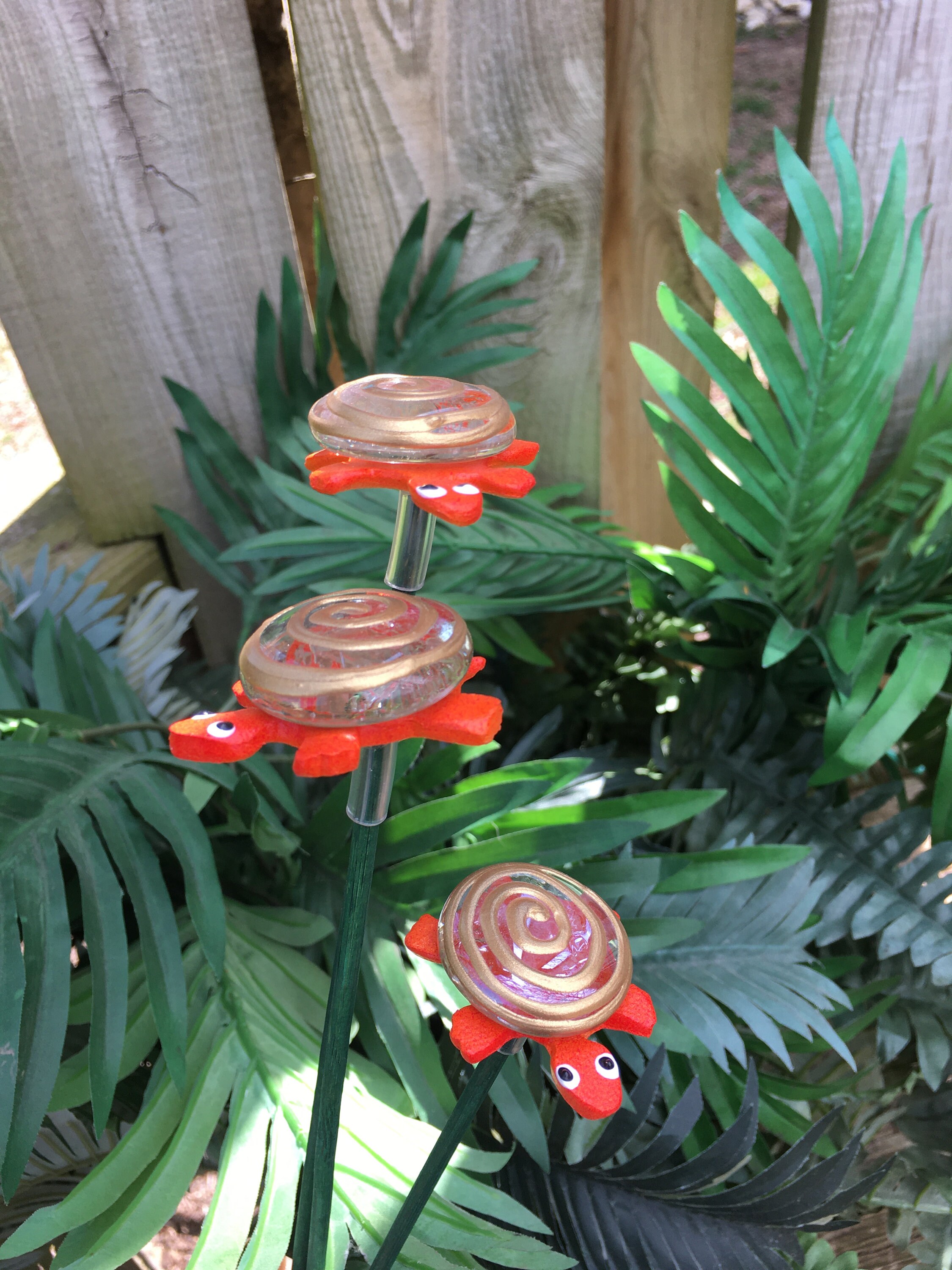 Each piece is lovingly hand formed, as well as each piece is a base coat of acrylic paint with ceramic stains and textured acrylic paint detailing. My garden art is mounted on a hand painted wooden dowl rod and made using the highest quality stoneware clay.