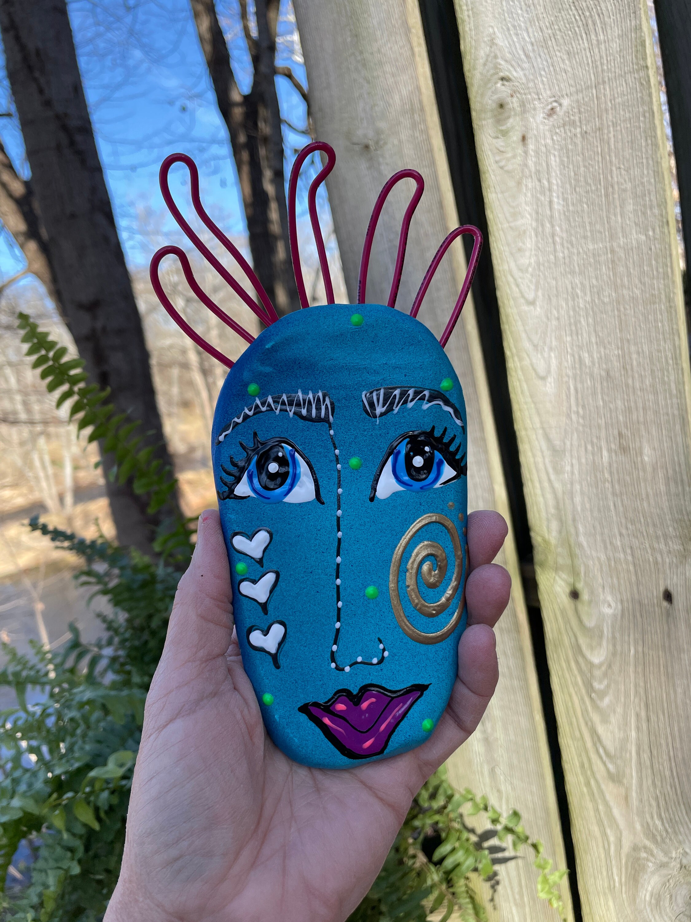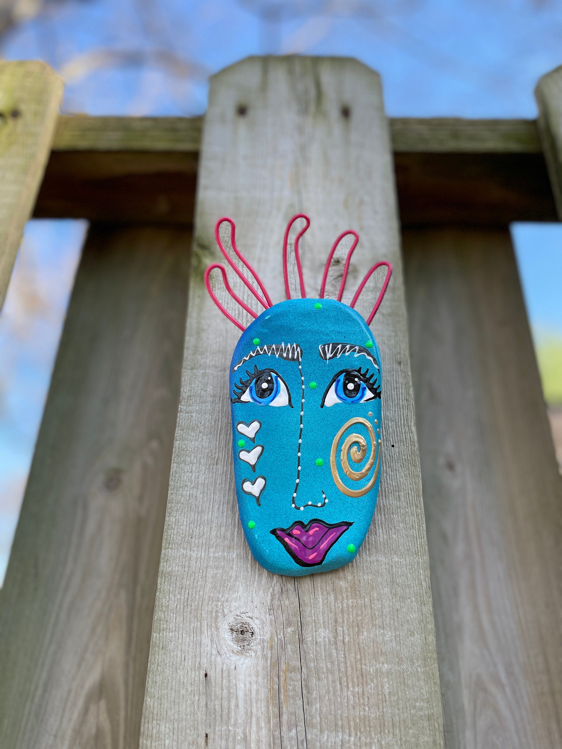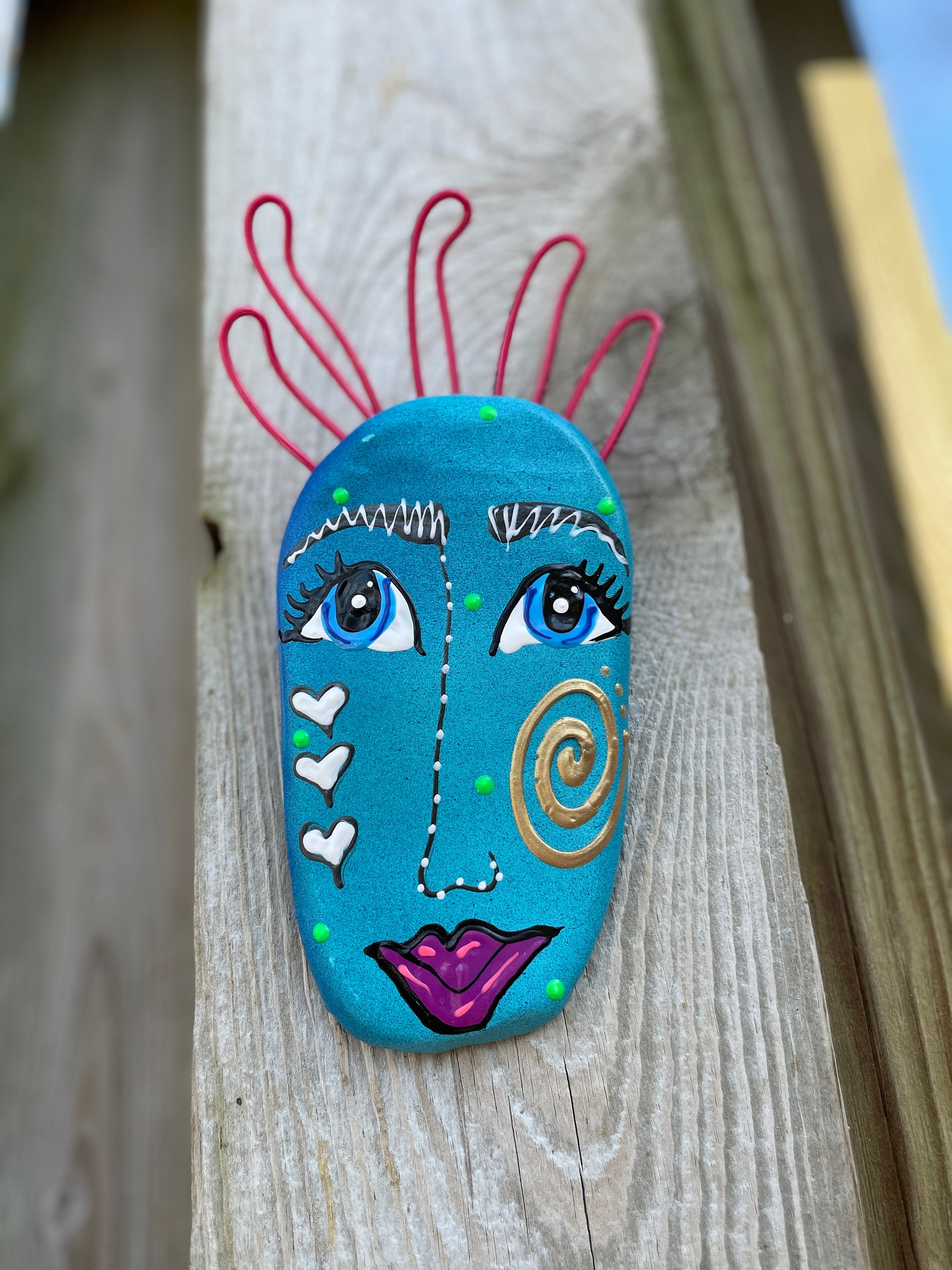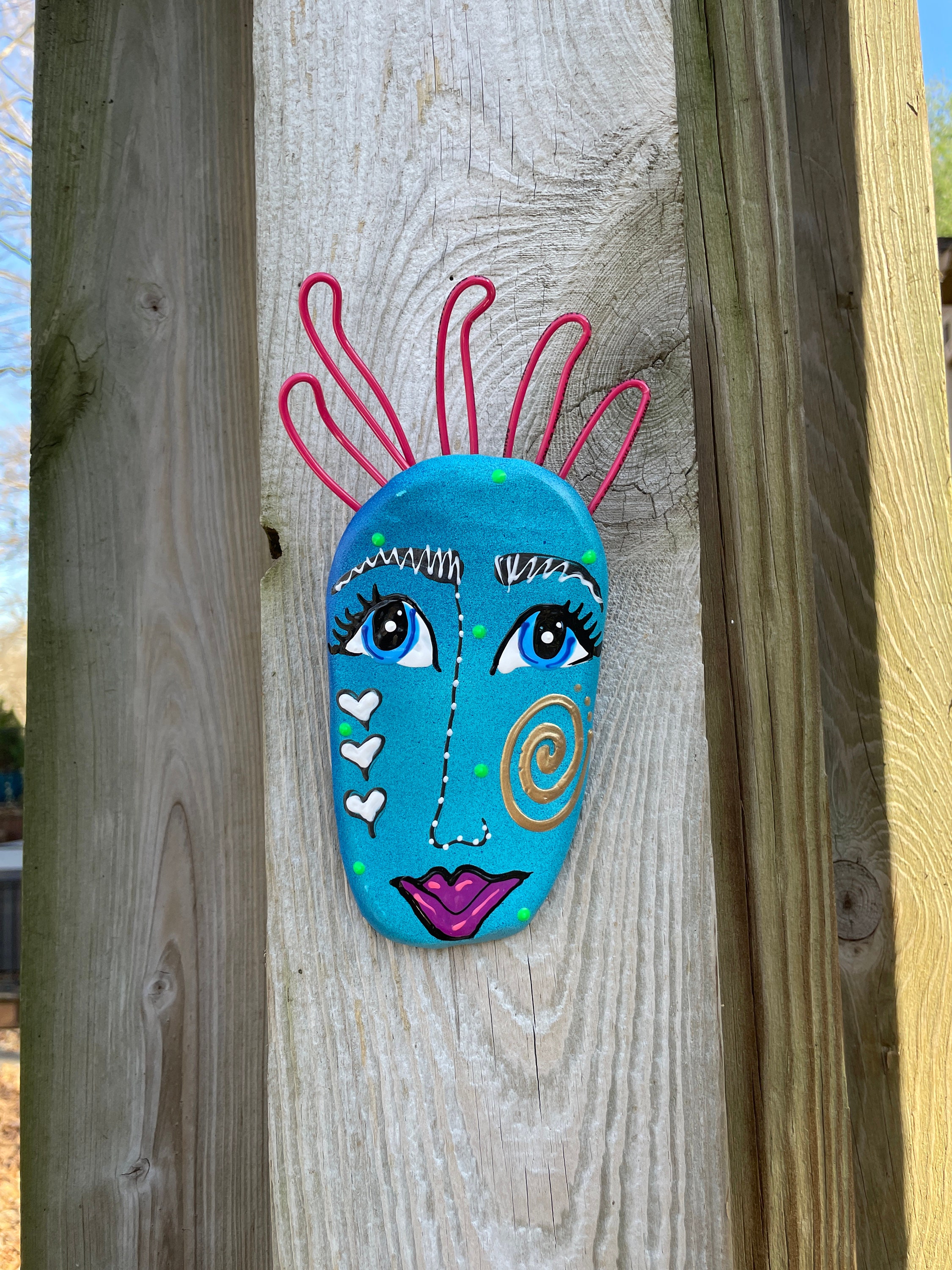 Materials Paint, Stoneware Clay, outdoor sealer Each Face is hand-painted to achieve a vibrant multi tonal, one-of-a-kind work of art. It hangs on a wire loop on it's backside.