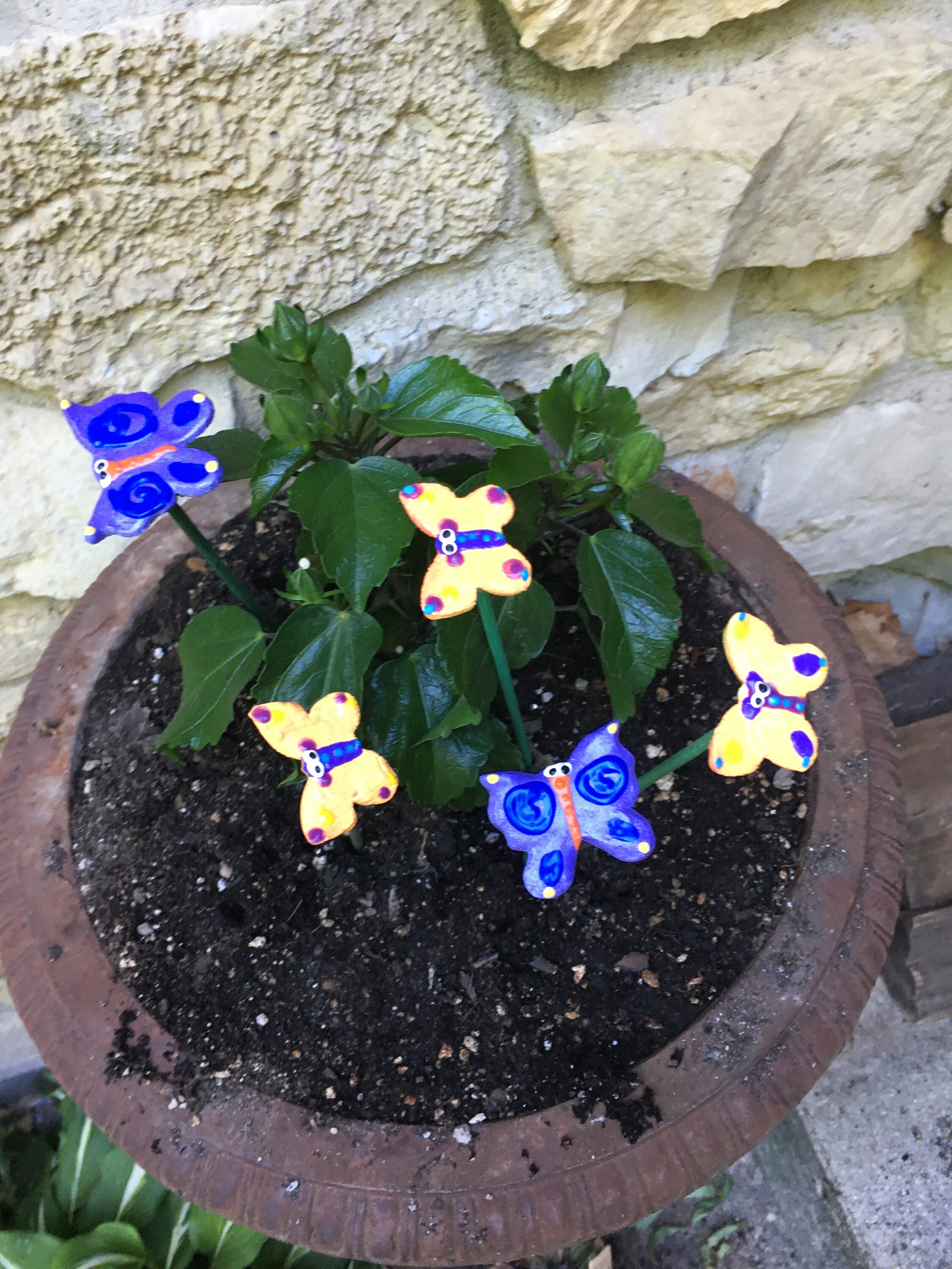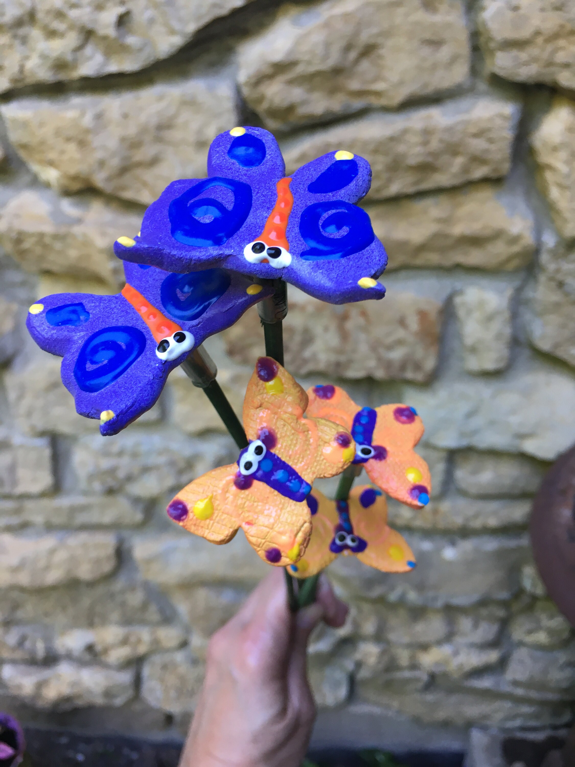 Each piece is lovingly hand formed, as well as each piece is a base coat of acrylic paint with ceramic stains and textured acrylic paint detailing. My garden art is mounted on a hand painted wooden dowl rod and made using the highest quality stoneware clay.