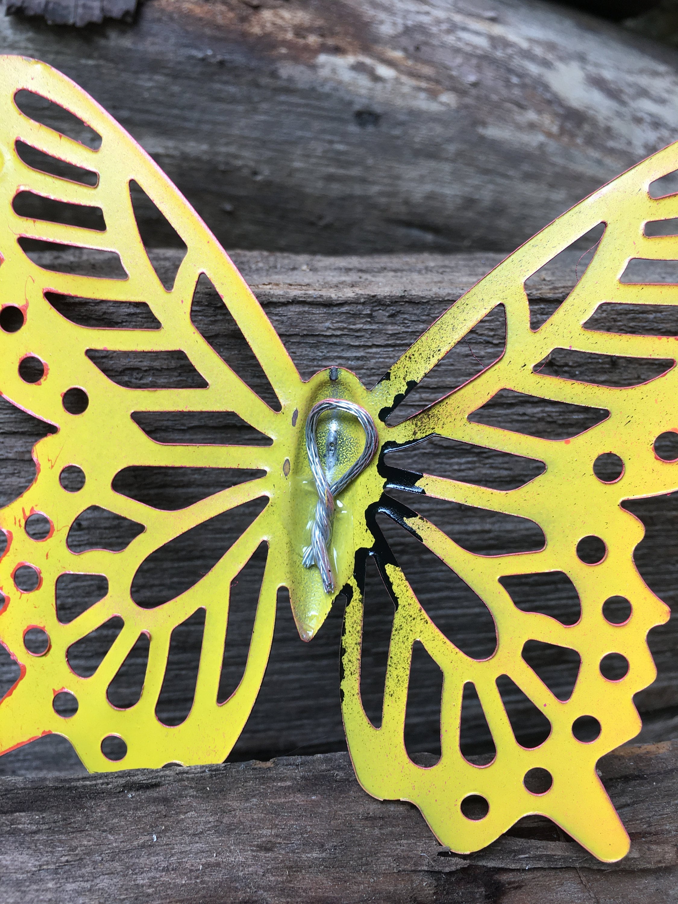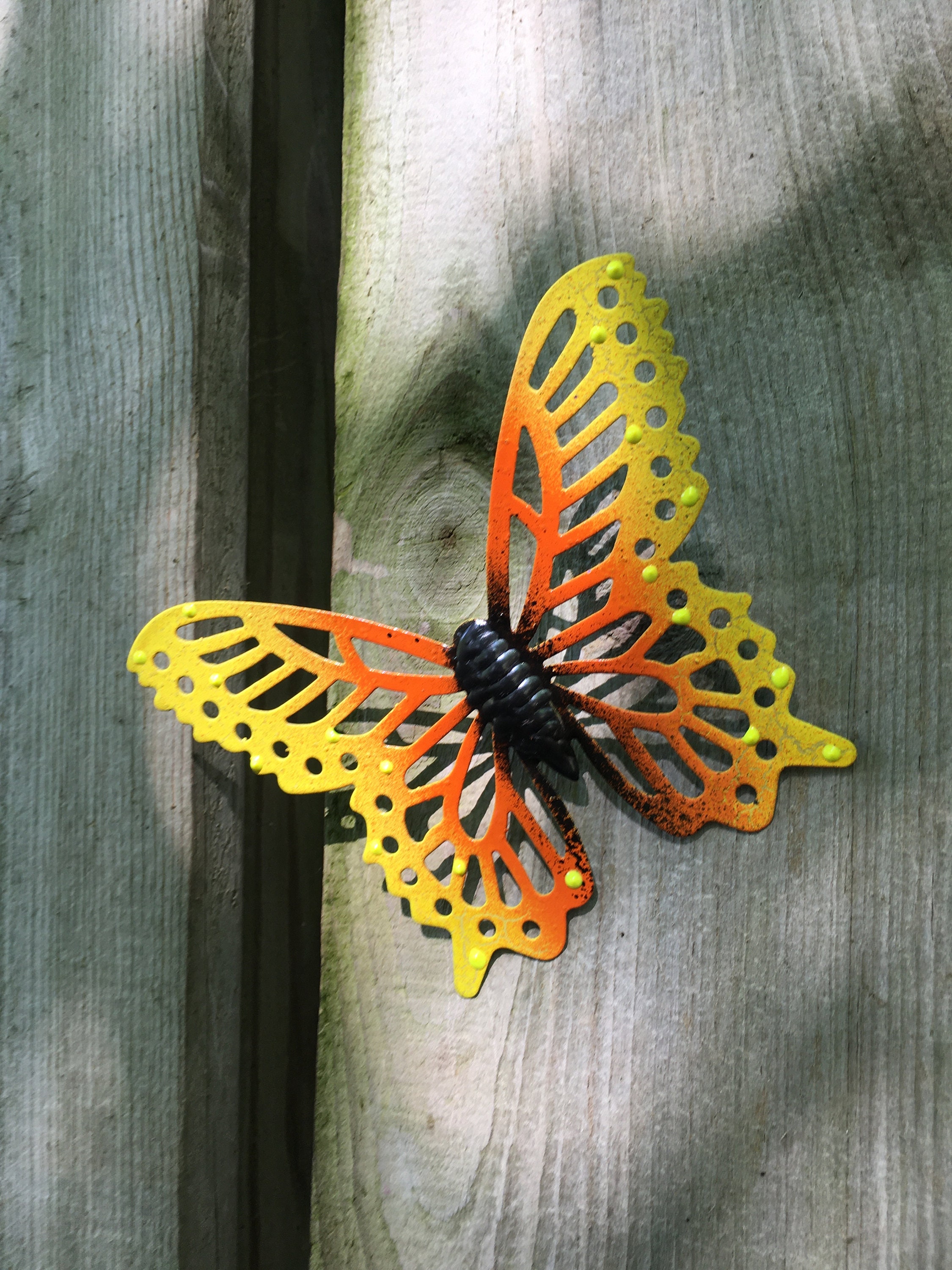 Add a touch of color and charm to your outdoor or indoor space with The Yellow Butterfly! This stunning metal butterfly is the perfect accent for any yard, garden, courtyard, or even your home. Whether you hang it on a privacy fence, decorate a wall, or place it on a tree trunk, its delicate design will brighten up any area.