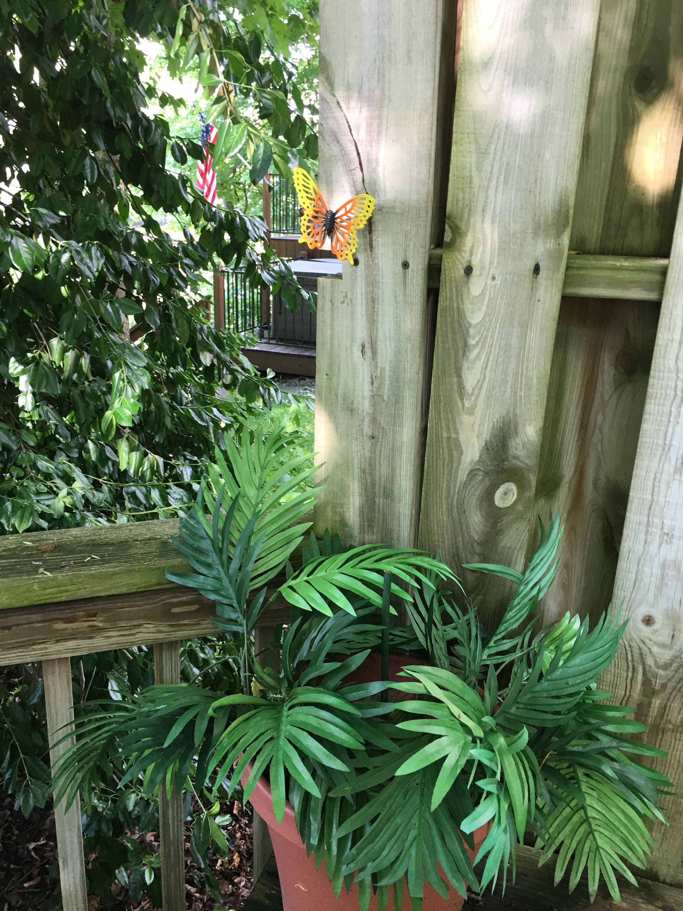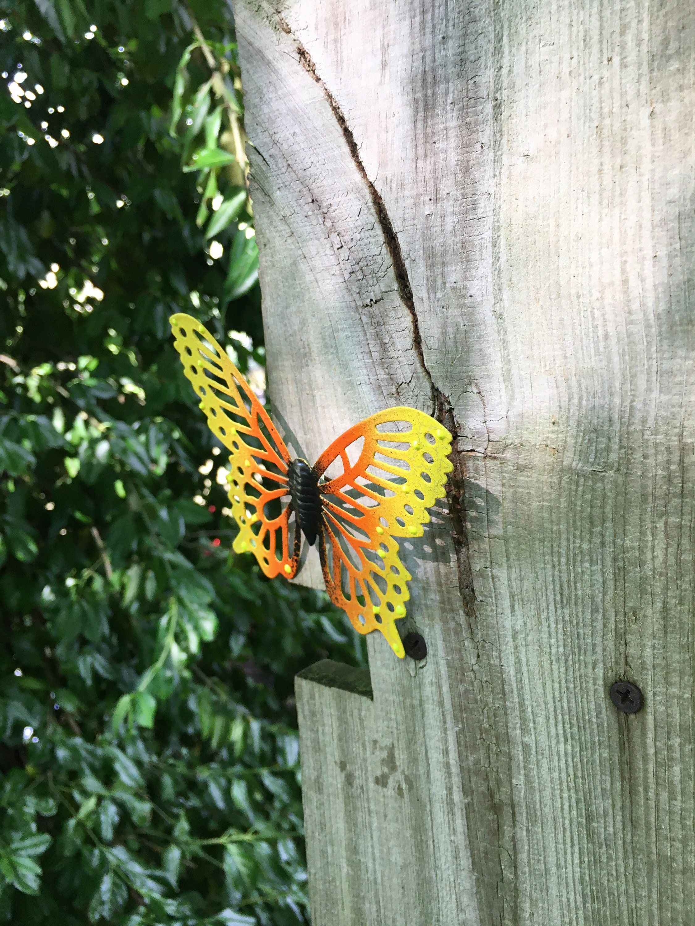 The Butterfly is easy to hang with a convenient wire loop on the backside, ready to be nailed to your fence or mounted wherever you'd like to add a splash of whimsy. Crafted with care, the butterfly is finished with a durable, clear gloss Spar Urethane coating that includes a UV protectant, offering protection against the harshest outdoor conditions. This will help minimize fading and graying from the sun, ensuring your butterfly stays vibrant season after season.