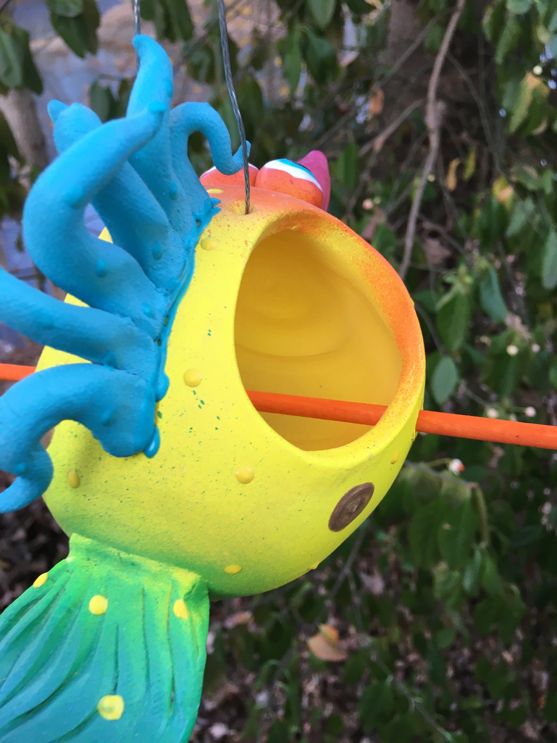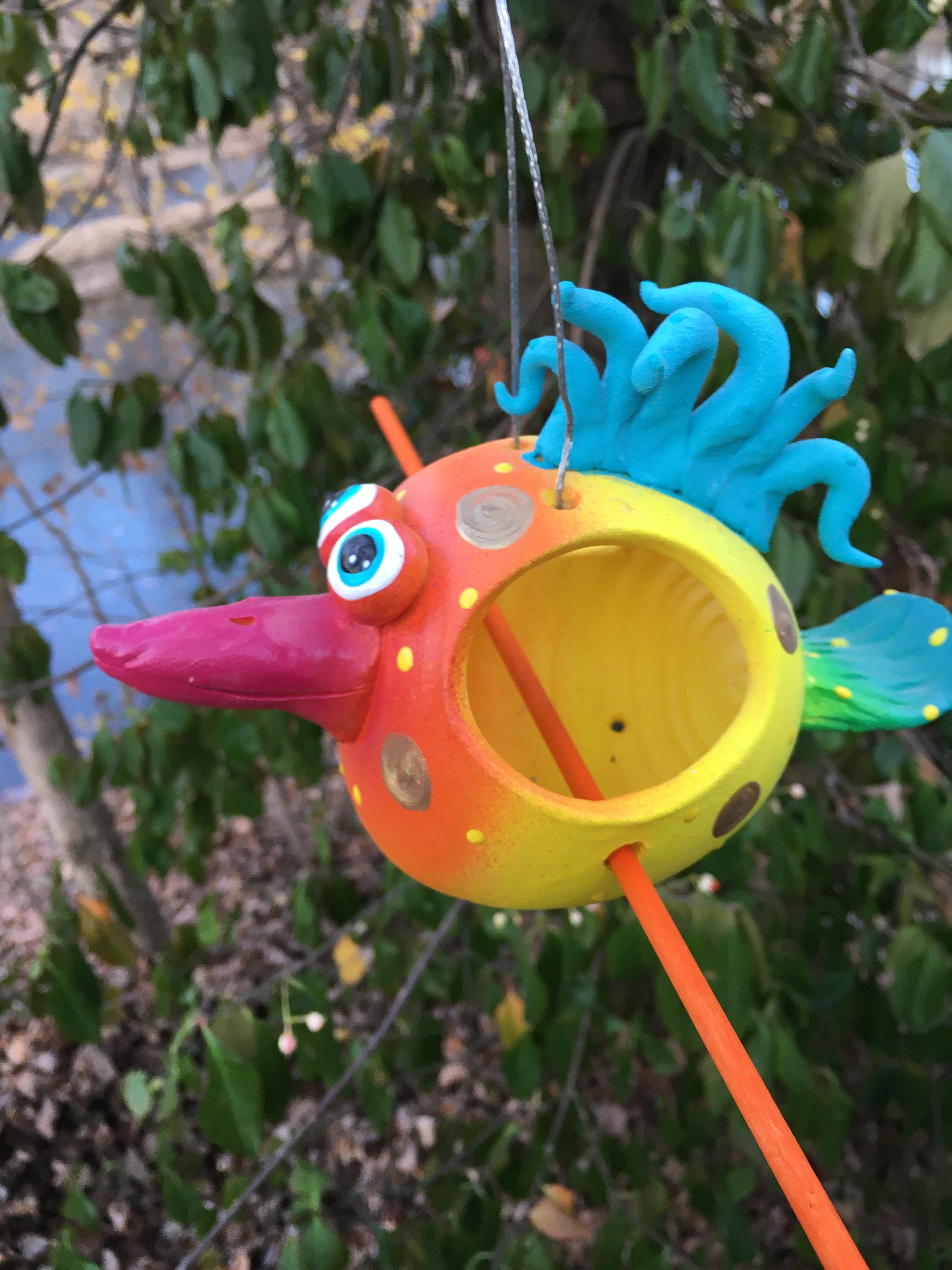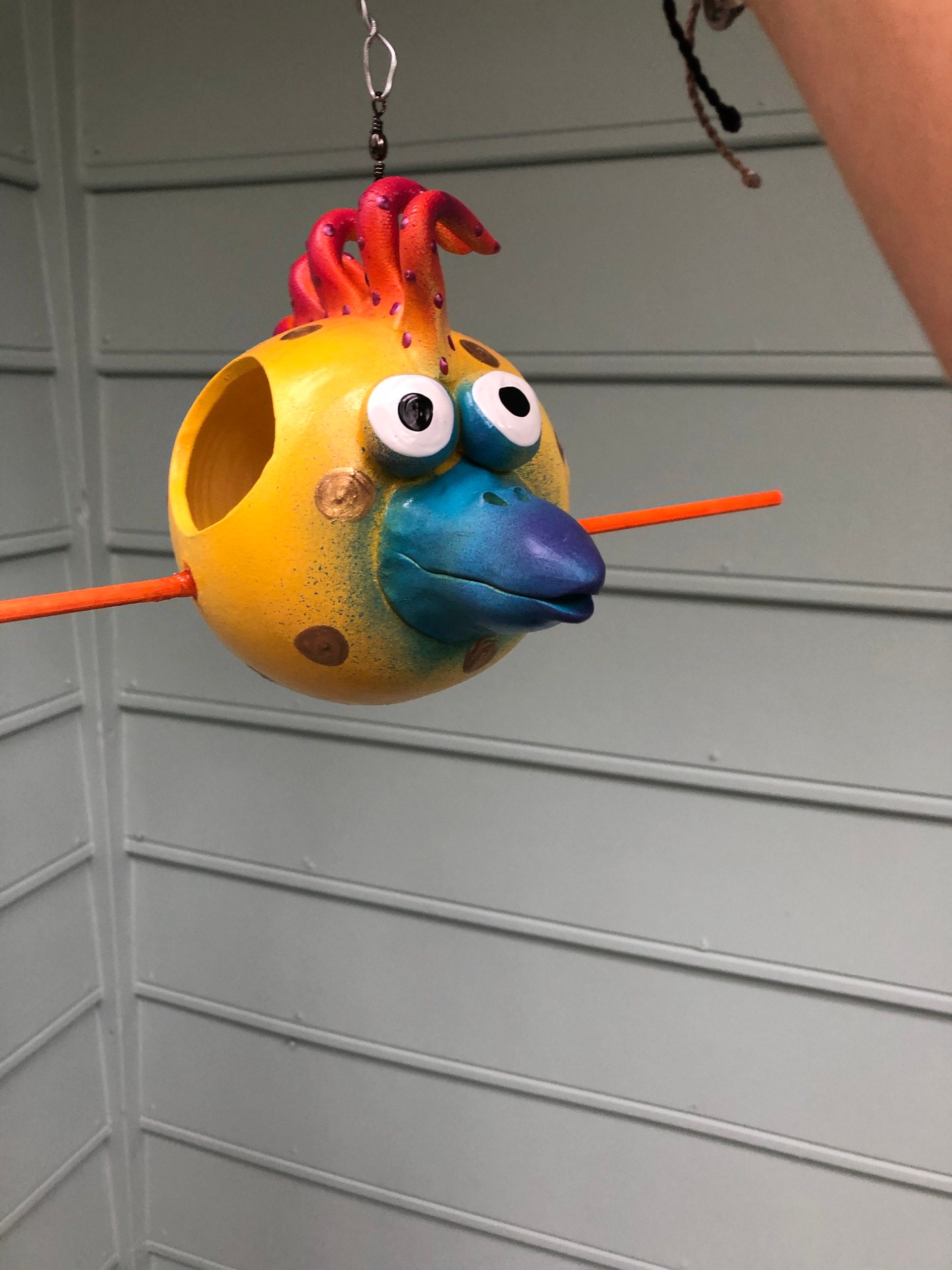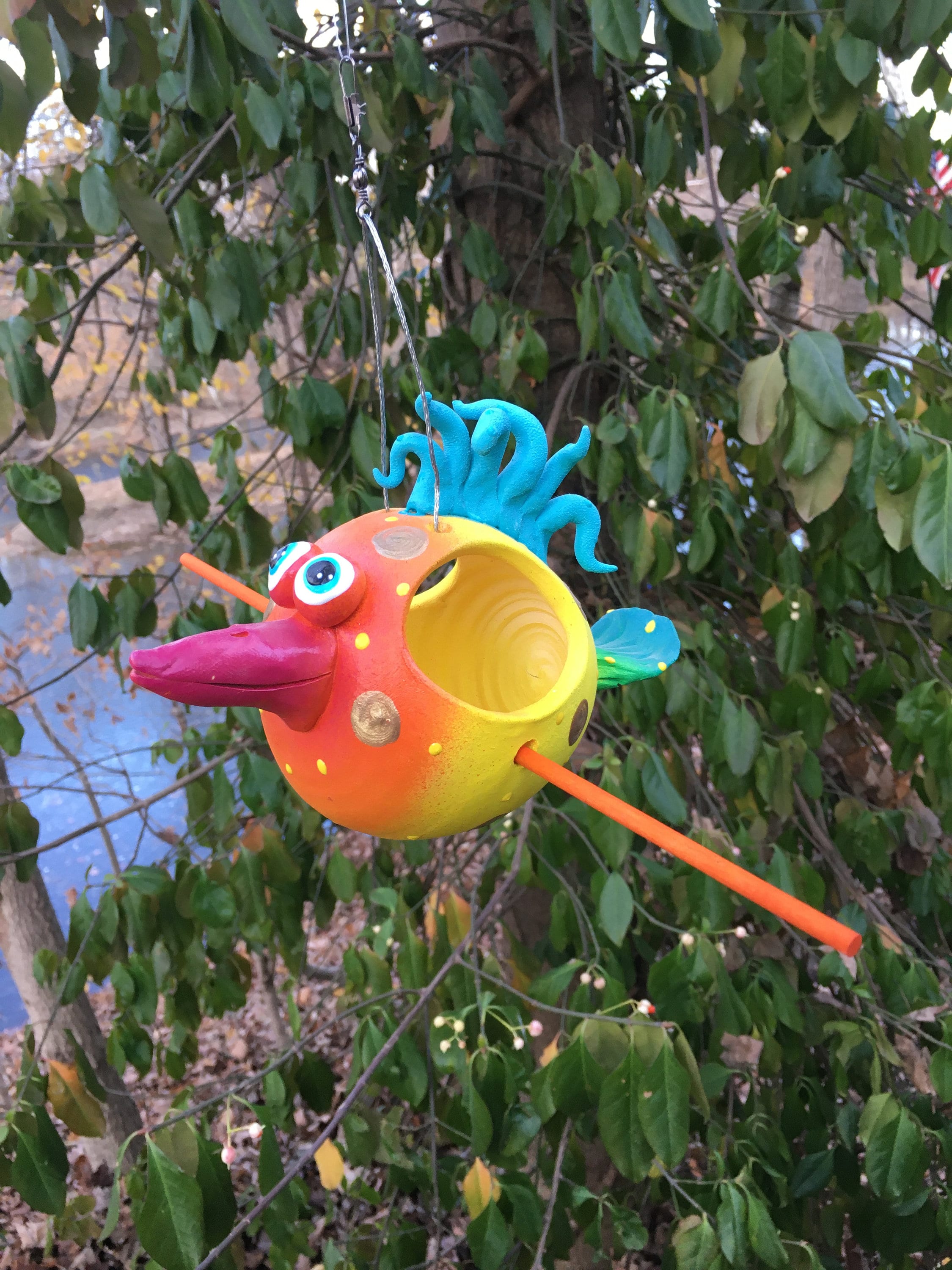 Let this fun, bright bird grace your garden with Whimsy! The Funky bird is suitable for Wrens and other small birds. A cute addition to your yard or garden. Hang it from a Tree branch or a Shepard Hook. (Shepard's hook is not included.)