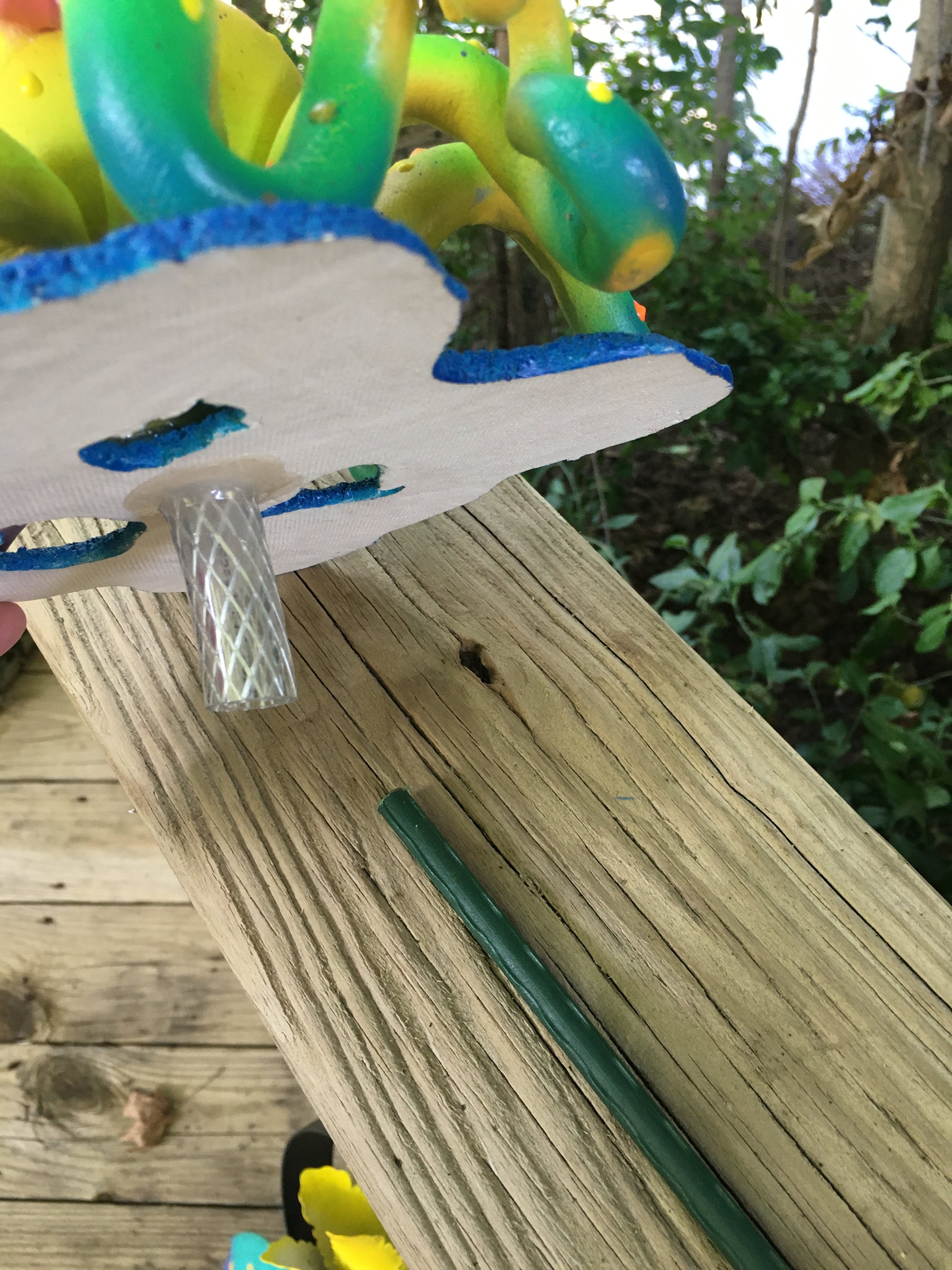 My garden art has a plastic tube glued to the bottom side of the piece. Comes with an easy to assemble 24 inch garden stake so it can hover over your flowers or Plants.