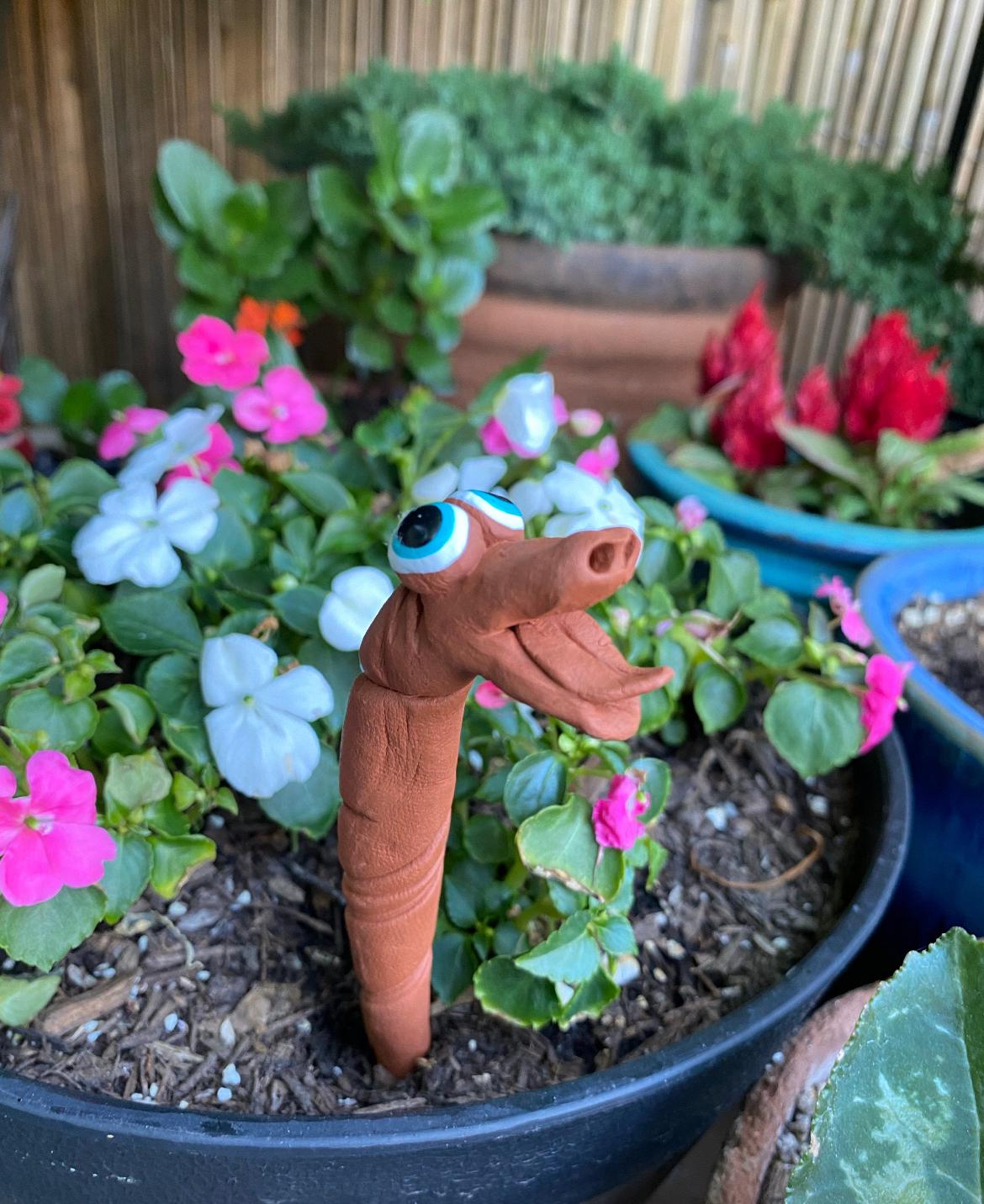 Handcrafted garden plant worms are hand made out of earthenware clay.