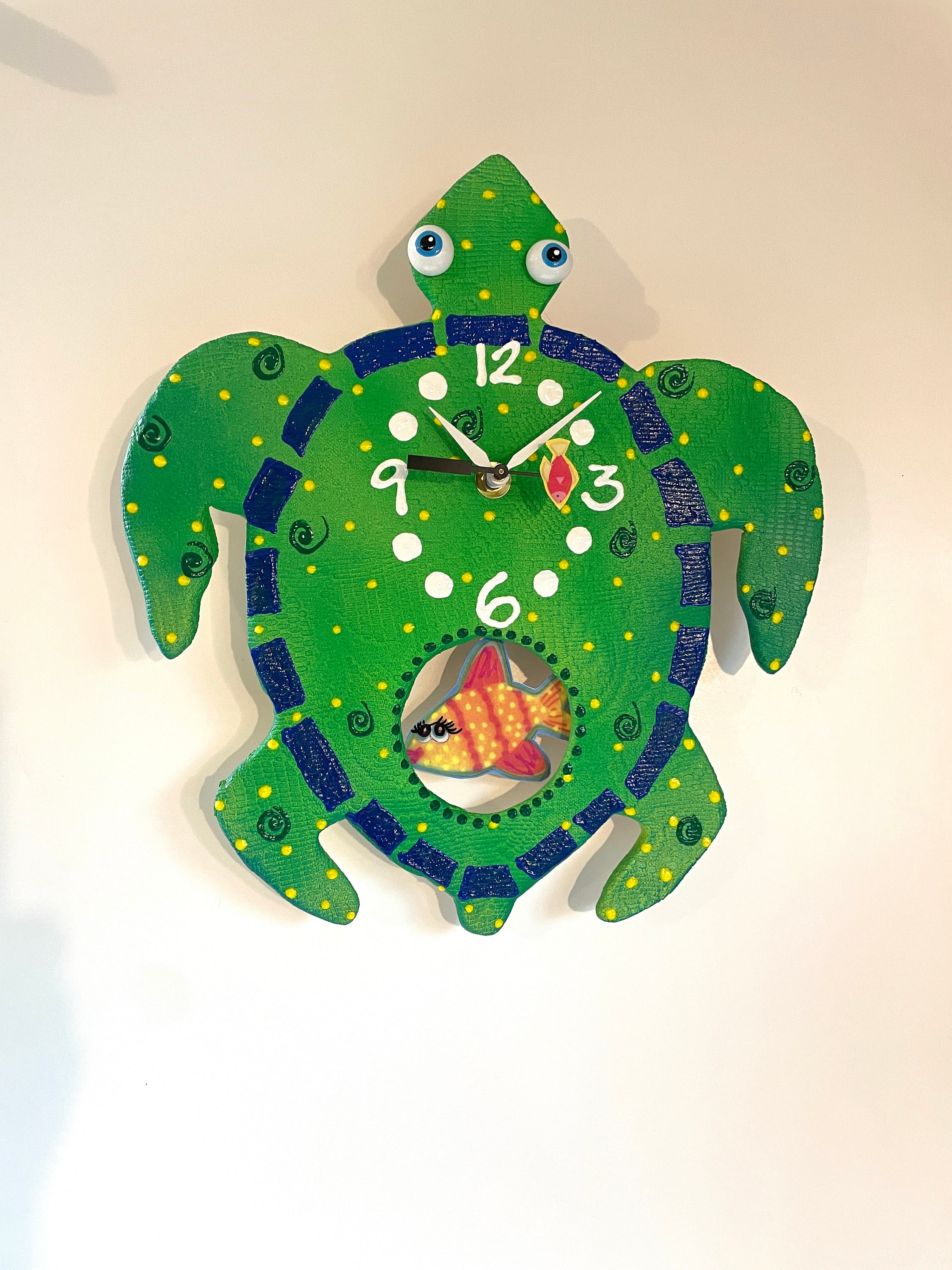 This clever ceramic Turtle wall clock with swinging pendulum is hand made in my art studio in Fishers, Indiana.