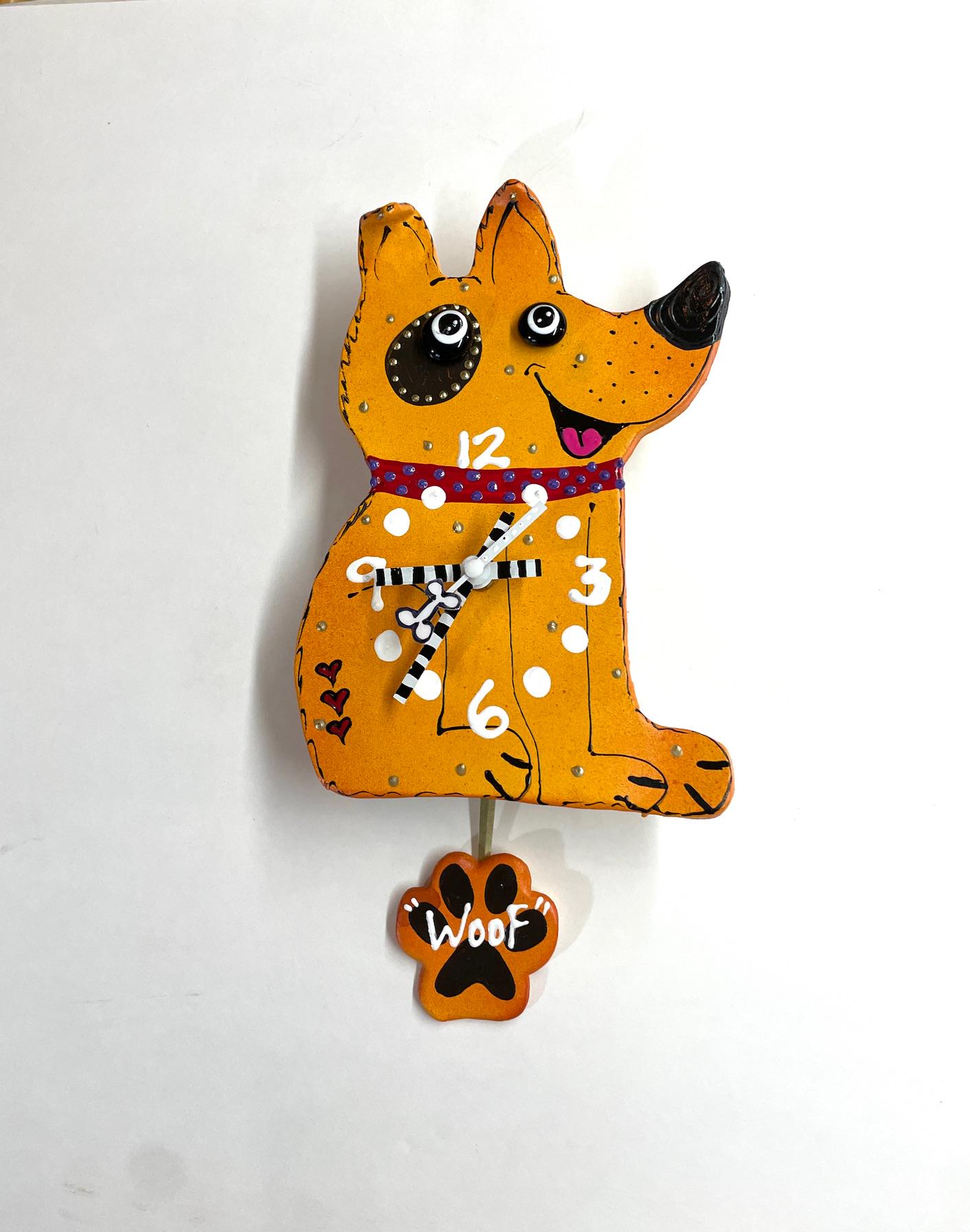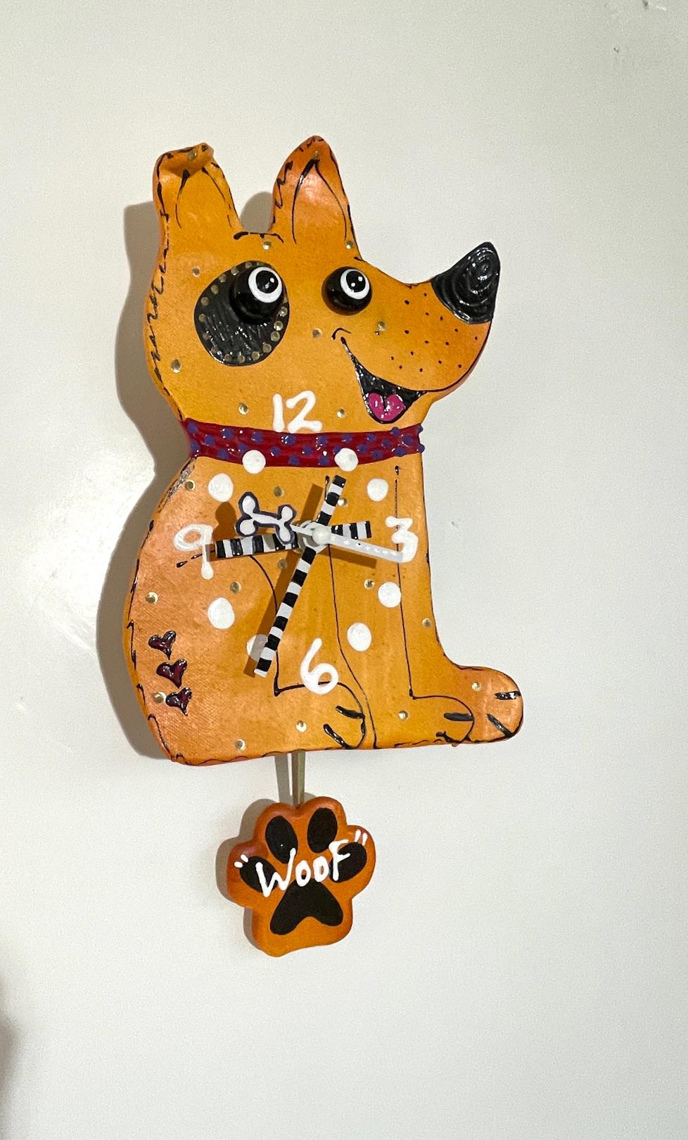 Bow Wow. A Doggie Wall Clock. This cute little Dog Clock is the perfect wall clock for your pet store or pet grooming business. Or a wonderful companion dog that requires the minimum of care. Just hang this happy canine on the wall and keep track of when to take your dogs for a walk.